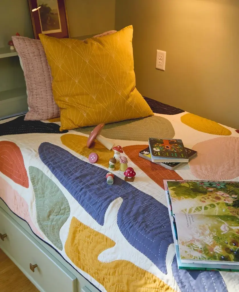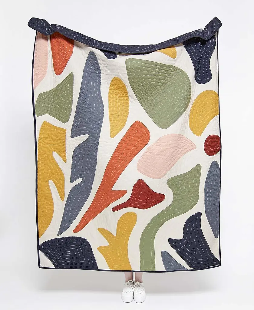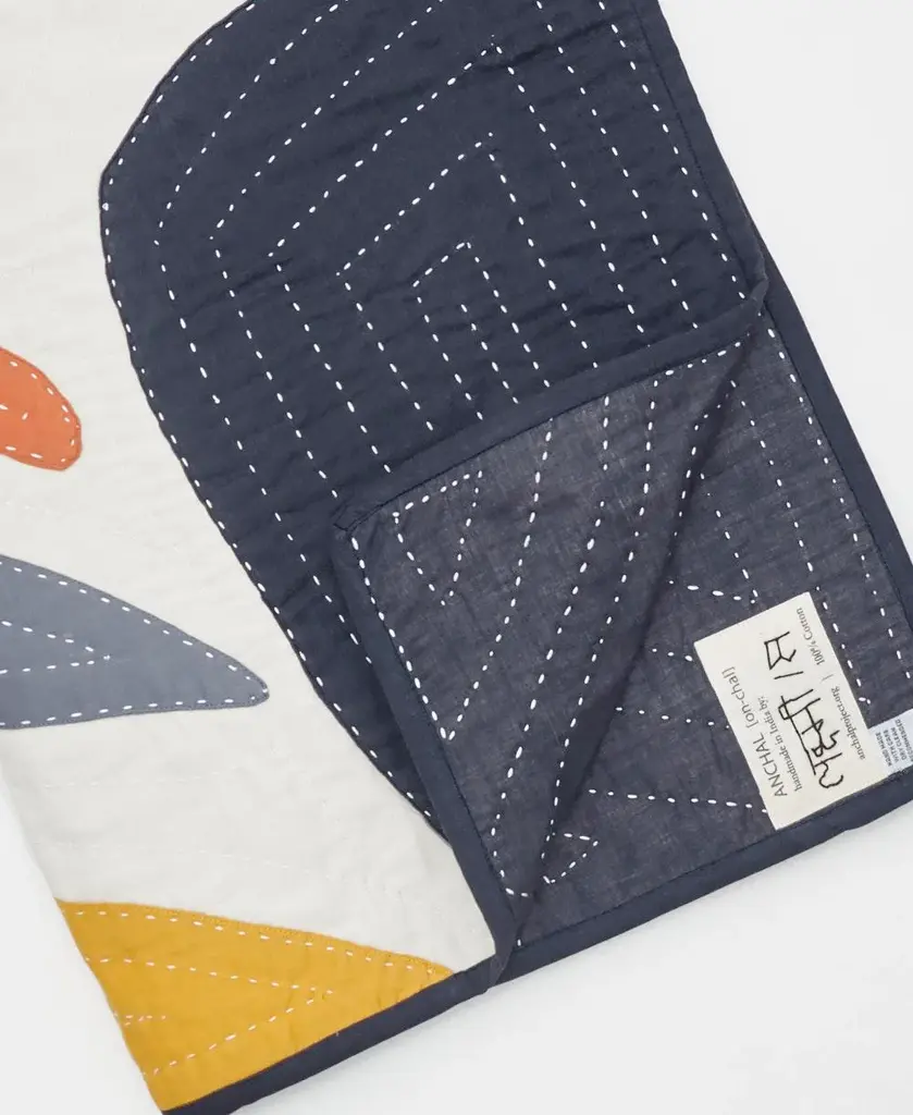 Inspired by a vintage sari pattern, our Petal Patchwork Quilt is a masterpiece of craftsmanship and design. Its curved lines and organic, nature-inspired shapes, in vibrant colors, uses an innovative applique technique. Each lightweight quilt begins with layering 6 layers of cotton, incorporating 23 applique petals, and requires over 20 hours of meticulous hand-stitching. Signed by the artisan who made it, each piece is a testament to honoring traditional craftsmanship. Complete with a stunning, solid navy backing, intricate white stitchwork forms its own unique pattern on the reverse. This modern patchwork quilt tells a story of its own and becomes a part of your story once you welcome it into your home. Drape it over your bed or sofa for an artful pop of color.