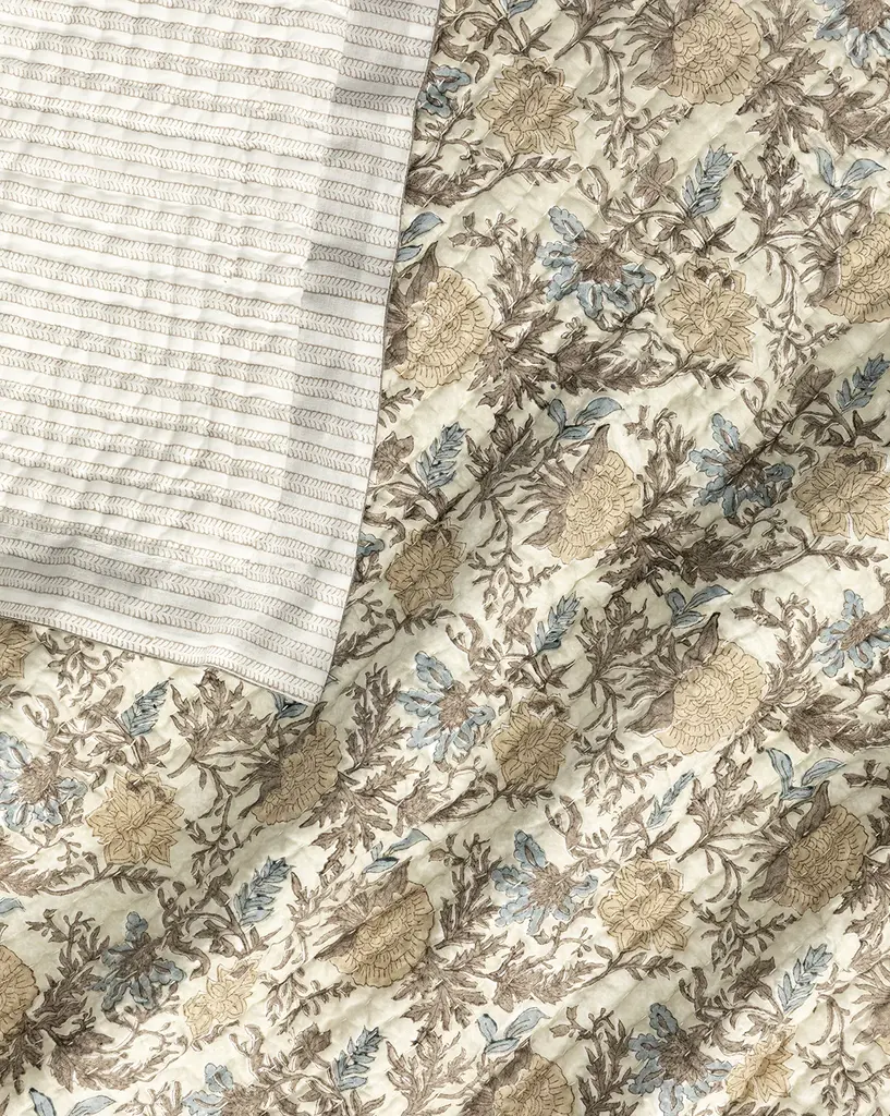 The Audrey Tan Block Print Quilt brings timeless charm to your bedroom with its delicate block print pattern in a neutral tan hue. Finished with soft ruffle edging, it layers beautifully to add extra warmth and visual interest, creating a collected, effortlessly inviting bed vignette.