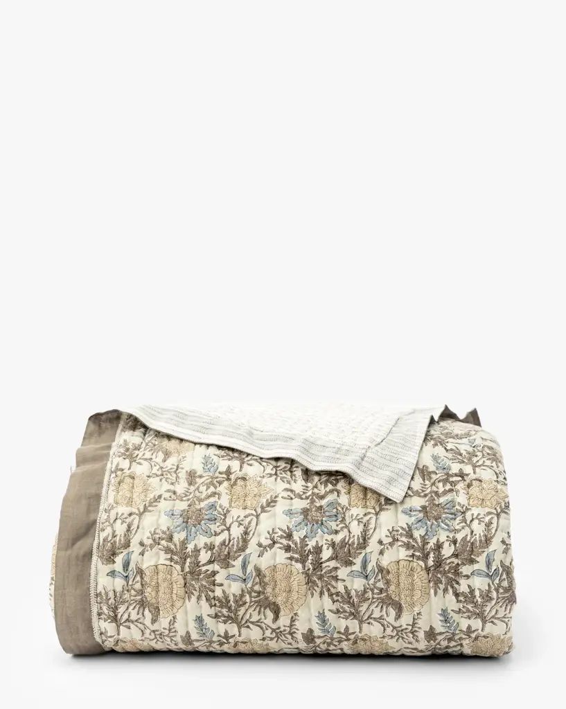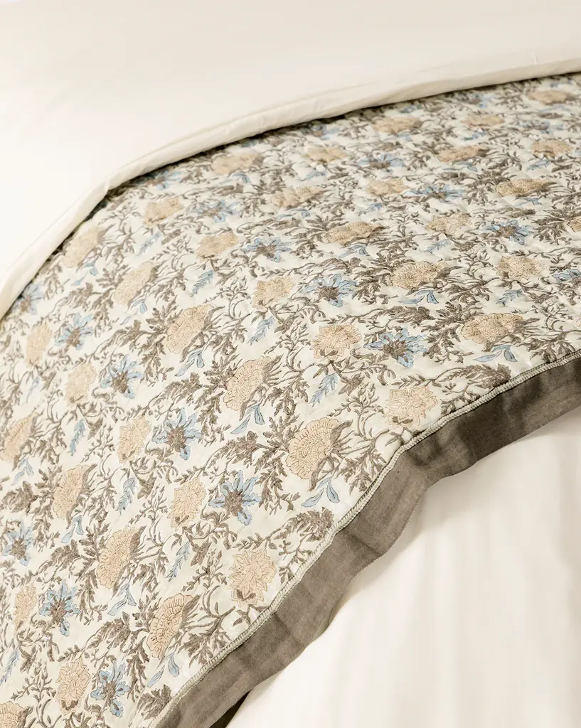 The Audrey Tan Block Print Quilt brings timeless charm to your bedroom with its delicate block print pattern in a neutral tan hue. Finished with soft ruffle edging, it layers beautifully to add extra warmth and visual interest, creating a collected, effortlessly inviting bed vignette.