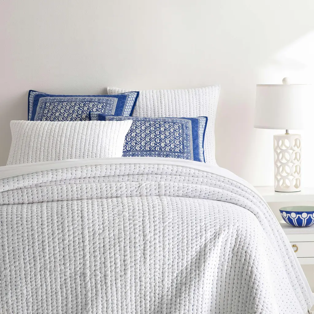 This cozy cotton coverlet is a throwback to traditional Americana. Checked quilting stitches create subtle texture on polka-dotted navy blocks, alternating with creamy white boxes quilted with leaf motifs. The perfect lightweight extra layer to have at the foot of the bed.