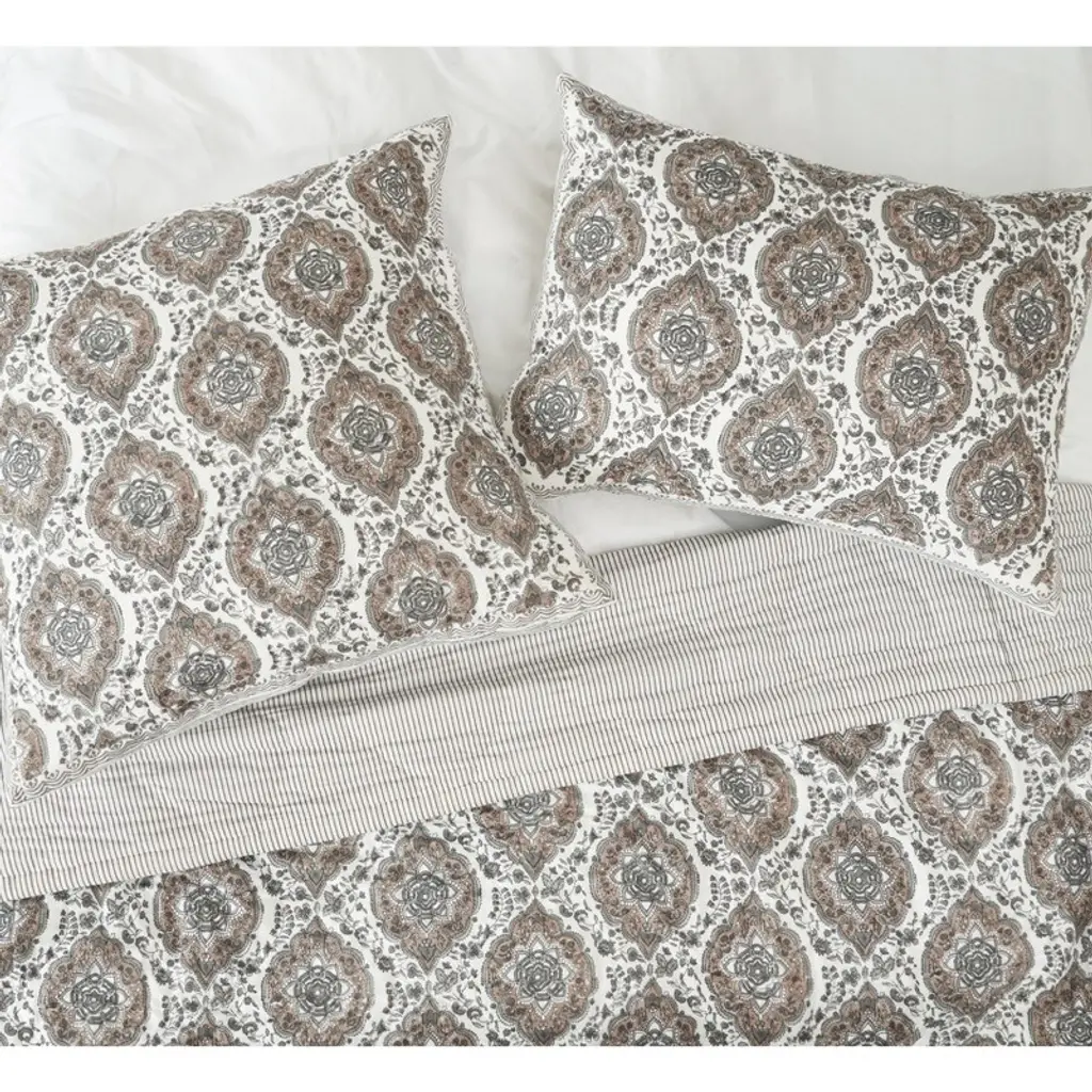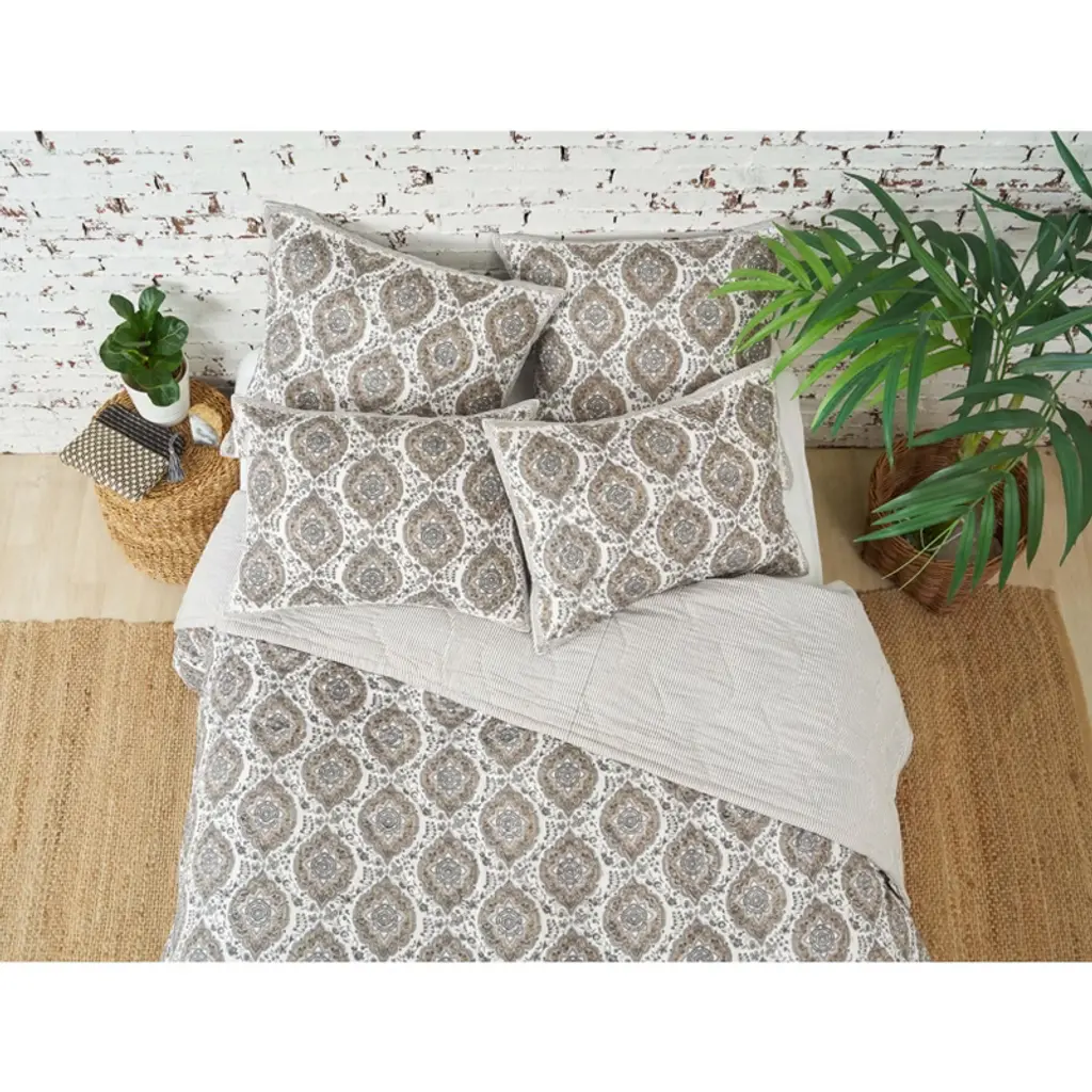 Make a statement with the Freddie Onyx quilt, a hand-crafted quilt featuring a neutral boho design. Crafted from 100% cotton voile with an authentic hand blocked pattern, the quilt is hand-quilted with a heritage Kantha stitch for superior strength and durability. To complete the look, pair with the accompanying Freddie Onyx shams with envelope closure and tie detailing. At carol & frank we believe different is beautiful! Each piece in the Freddie collection is individually block printed and quilted by hand with quality materials, which means no two are exactly alike. Color variations and slight irregularities in pattern are not mistakes, but part of what makes this collection unique.