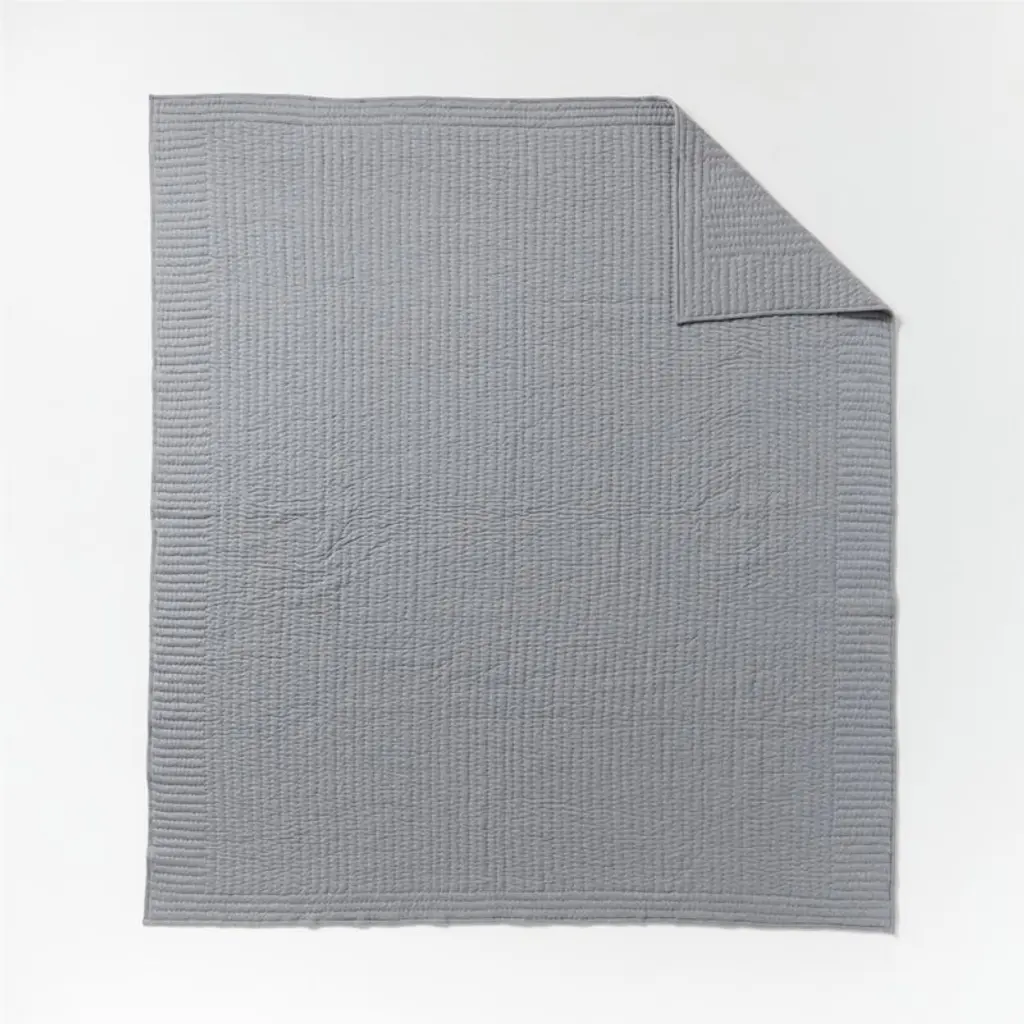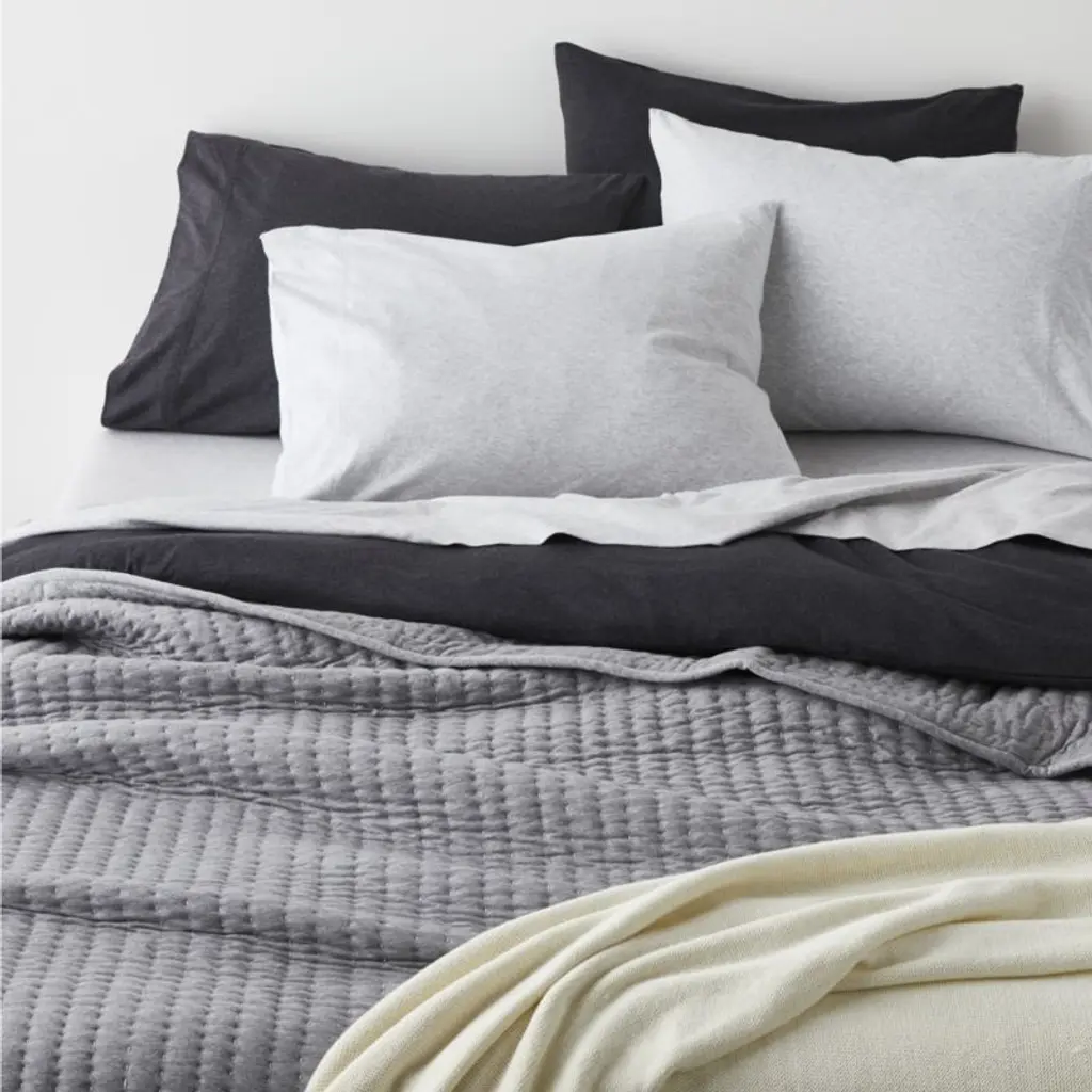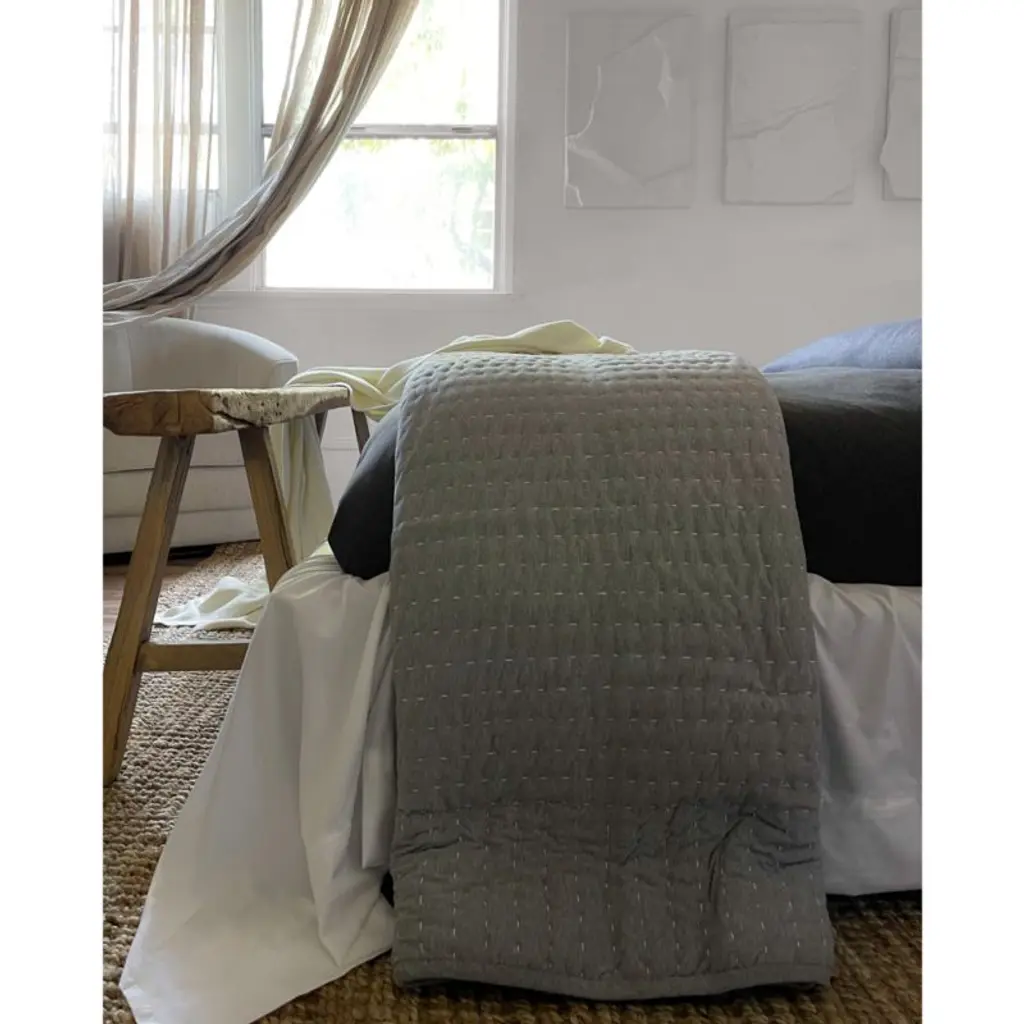 Traditional kantha quilting gets a modern casual update in classic heathered grey jersey. Softer than your favorite sleeping tee, the organic cotton fabric is stitched by hand into narrow channels for a dotted effect and a supersoft ribbed feel. The perpendicularly sewn border finishes our quilt with subtle linear contrast. For an ultra-inviting bed, add the matching pillow shams and the coordinating heathered light grey sheet set and duvet cover.