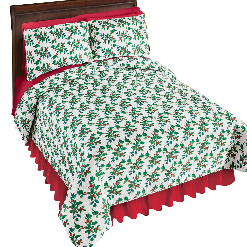 Festive Colorful Holly Design Holiday Quilt - Quilts & Comforters - King - Hand Wash