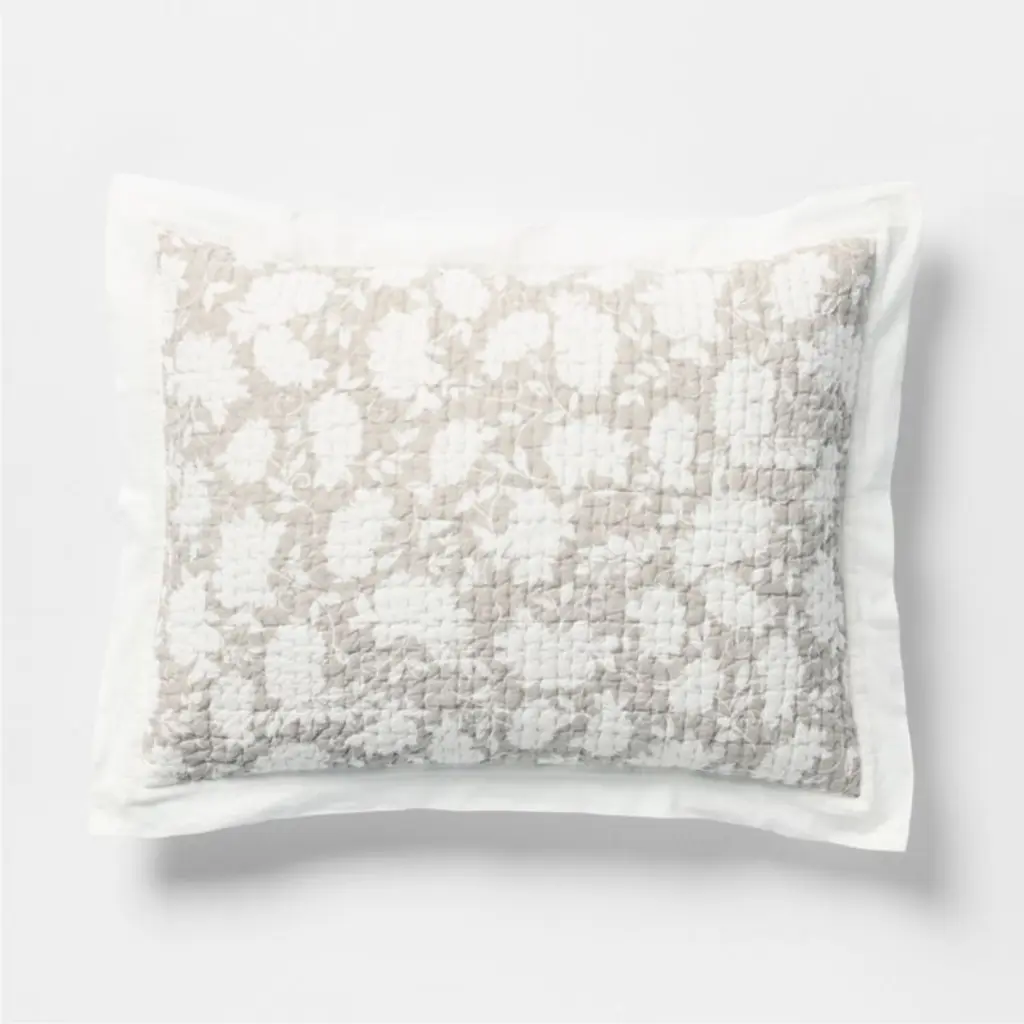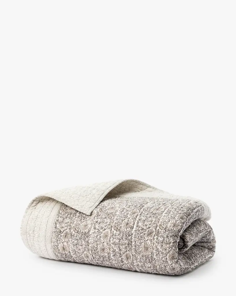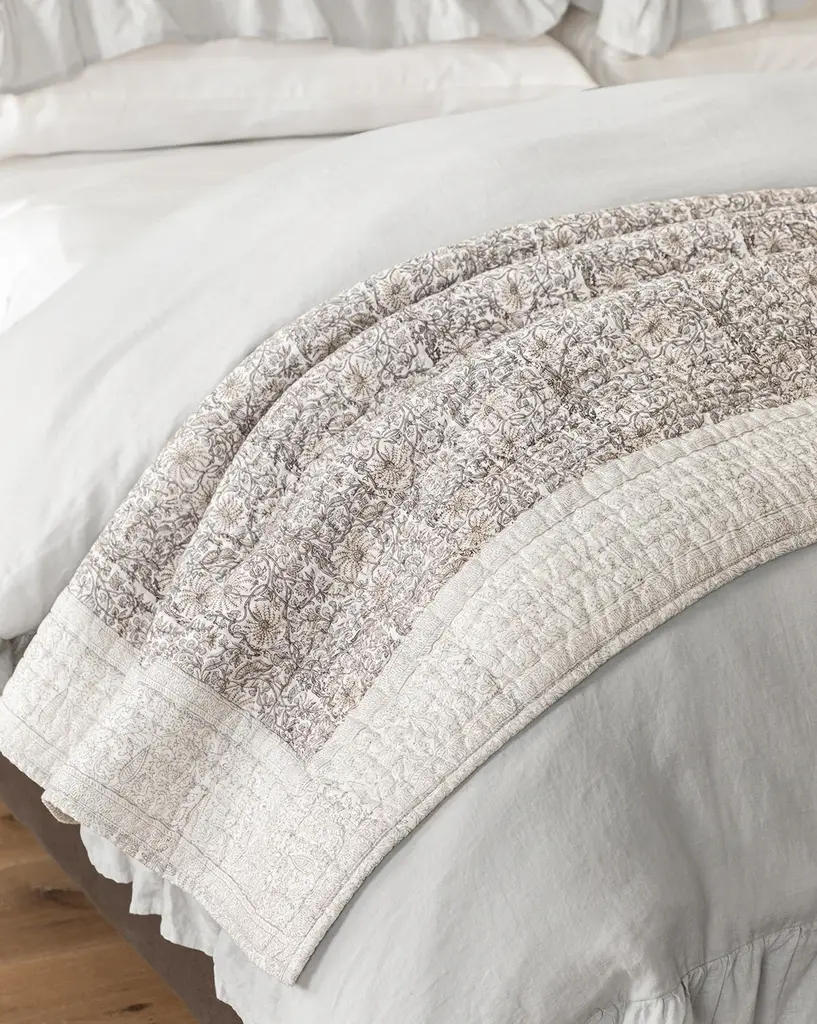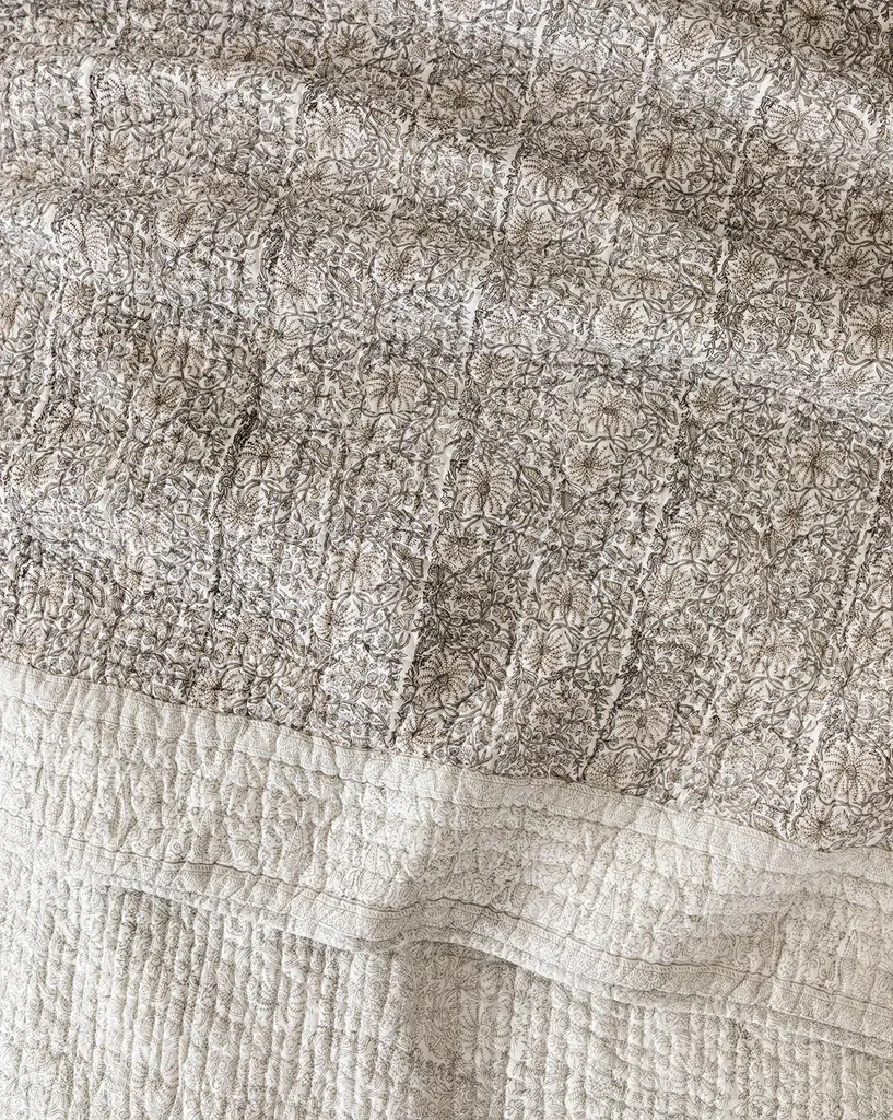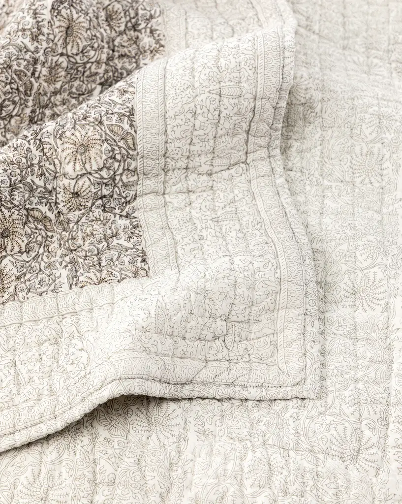 A romantic addition to bedding, the Floral Block Print Quilt is intricately detailed with flowers and botanicals. Block printed and hand-quilted with channel quilting, the construction of the Floral Block Print Quilt speaks to its artisanship. Finished with piping from its solid, single-color block printed backing, this quilt is warm, textural, and heirloom in quality.