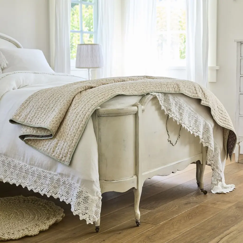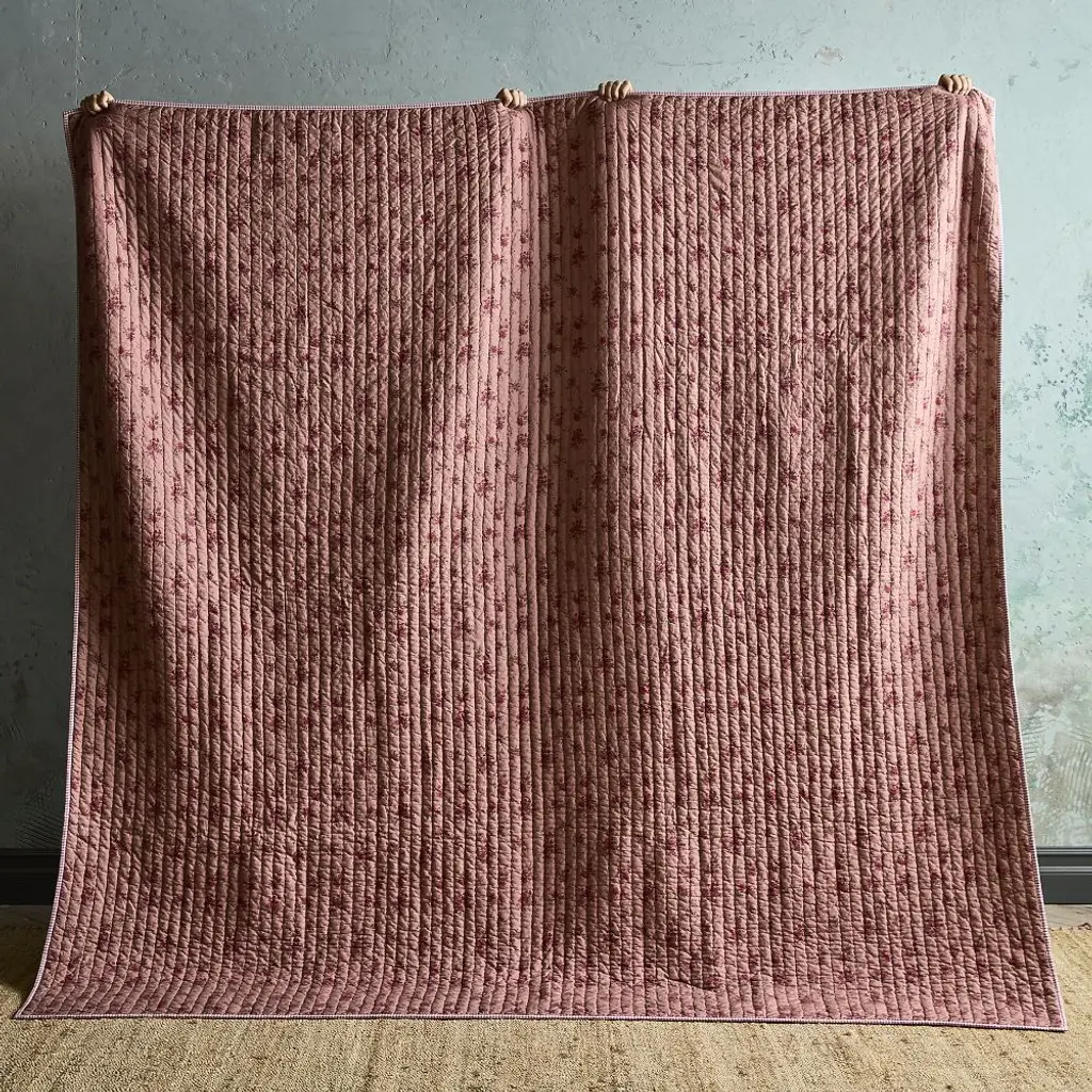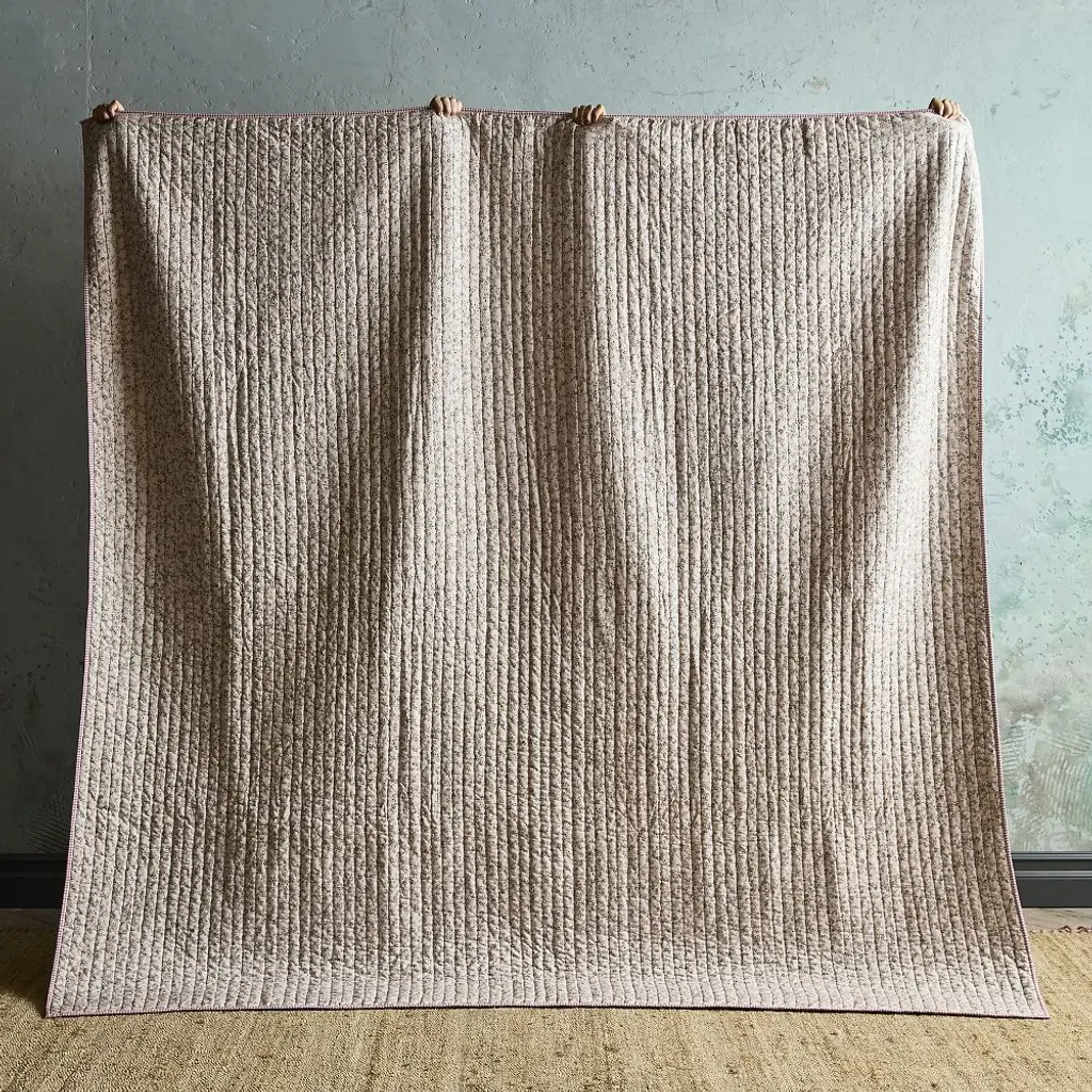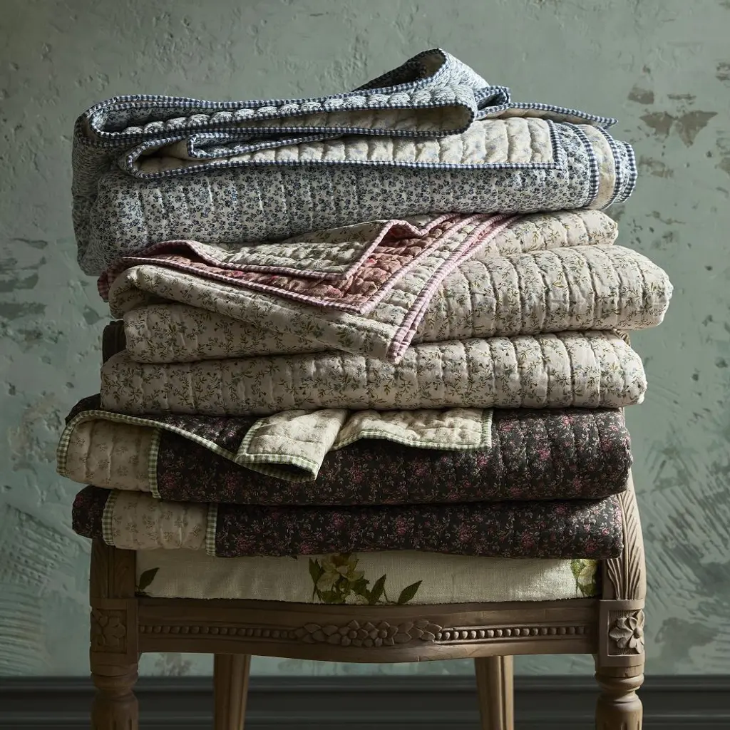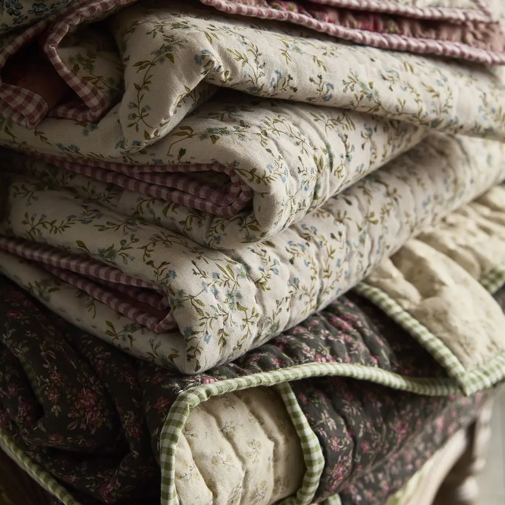 Two in one. With a gingham border and sweet florals on each side, this reversible quilt is ethically handcrafted in India by an artisan women’s workshop. An heirloom in the making.