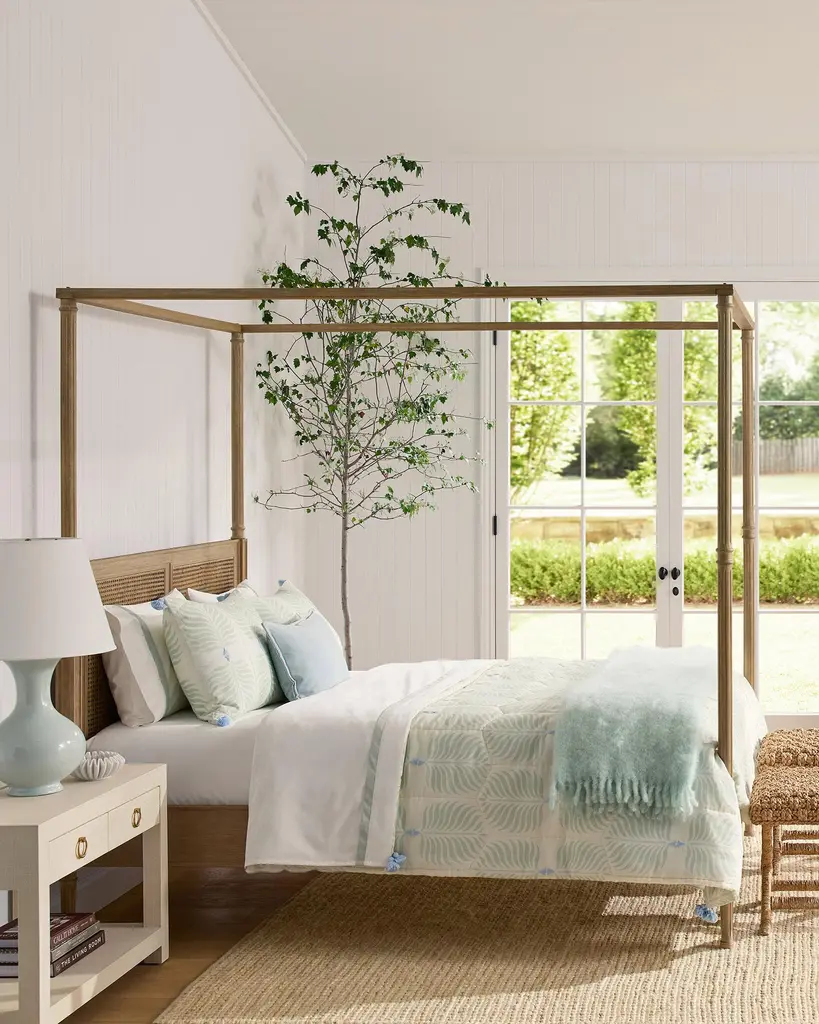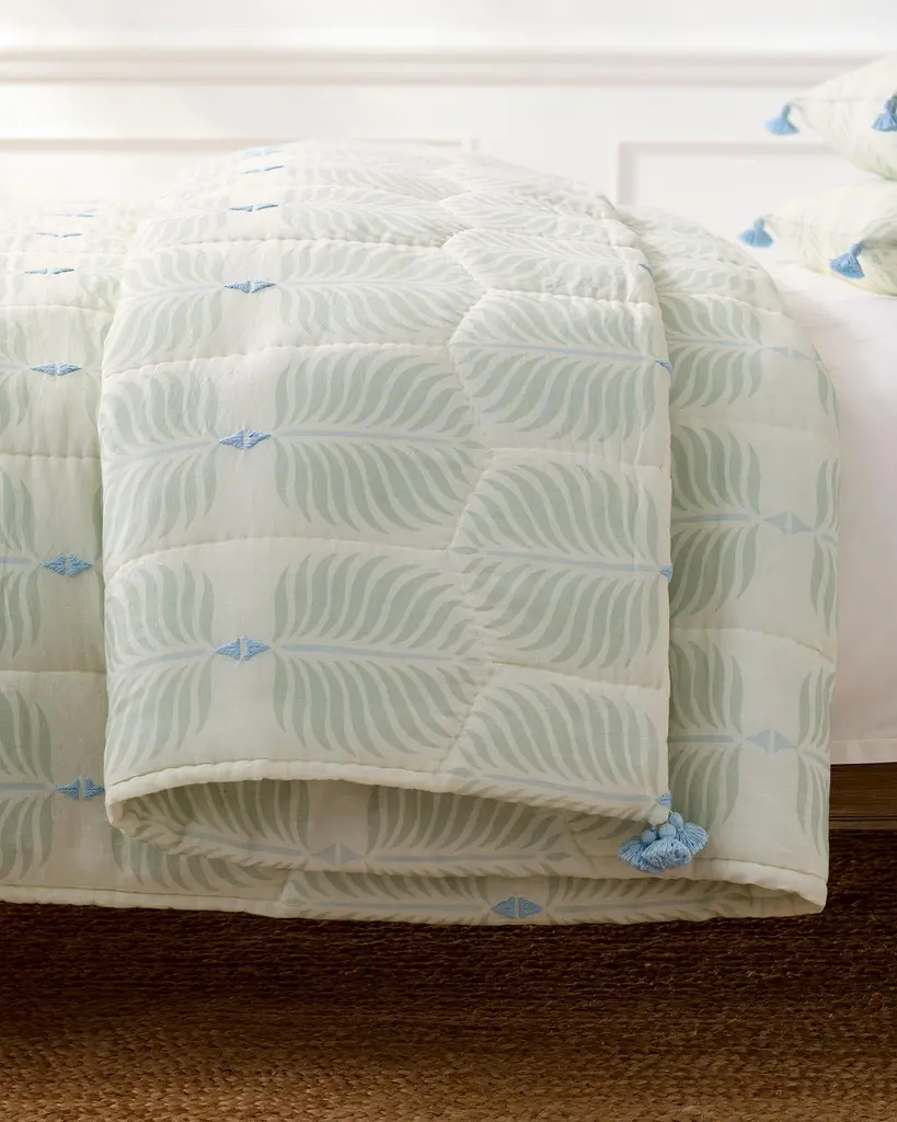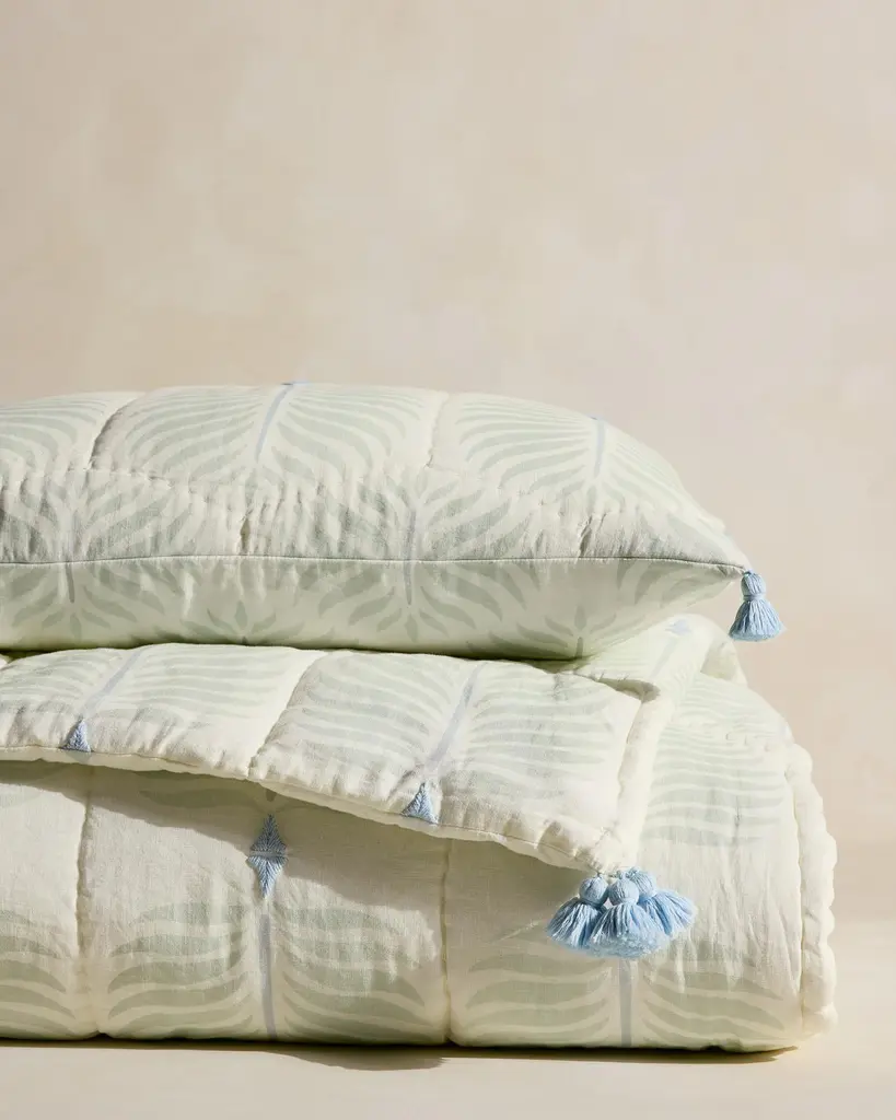 Flora. A lush bold botanic inspired by an Indian block print. Quilted by hand with tassel adornments.