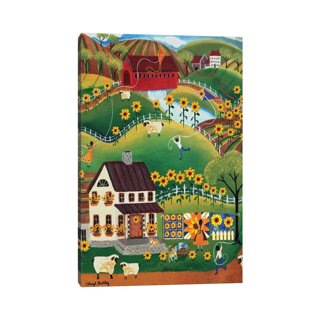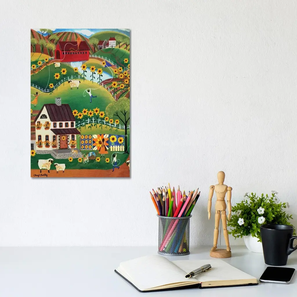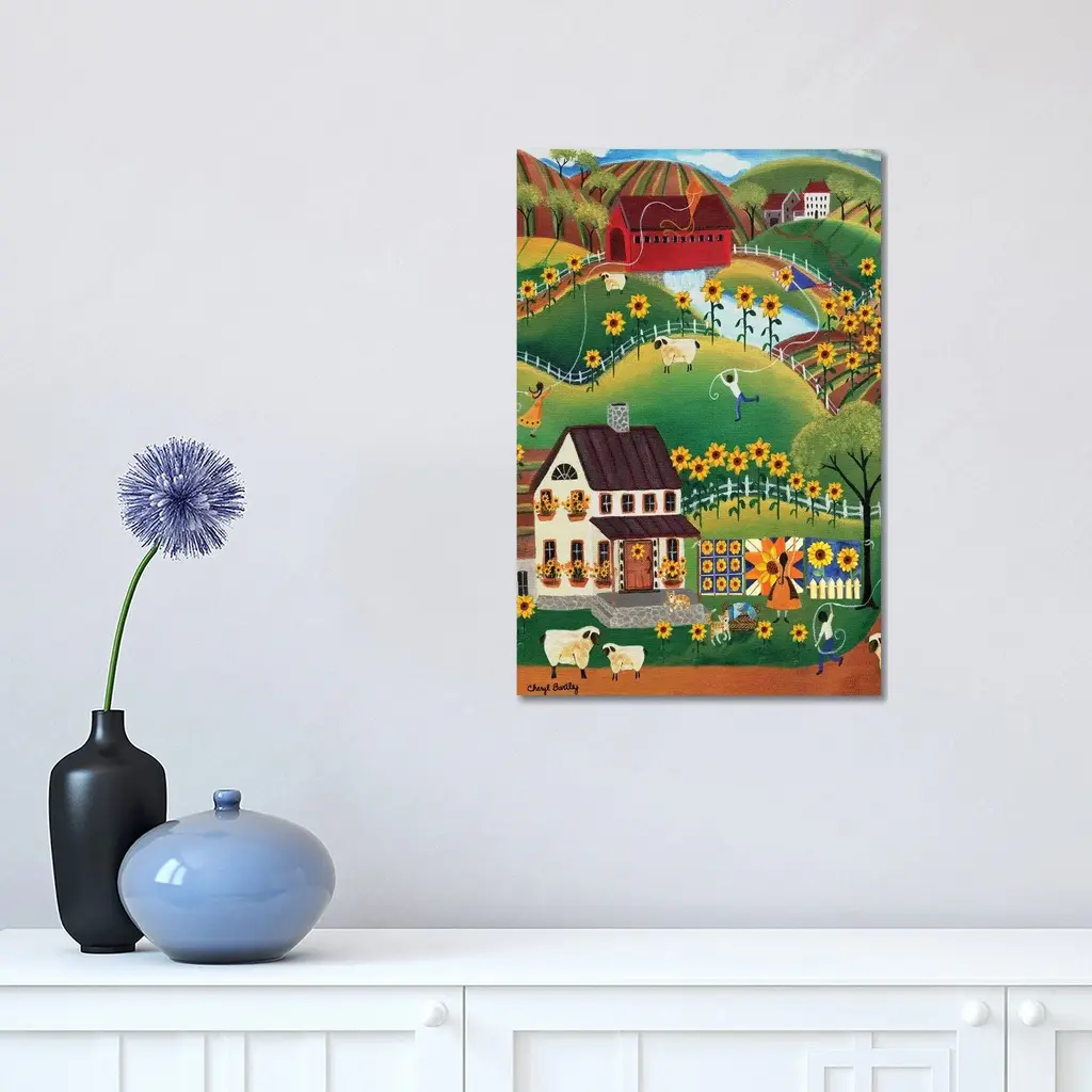 Icanvas "Primitive Quilt Maker House Sunflower Sheep Cheryl Bartley" By Cheryl Bartley Canvas Print - 26x18x1.5