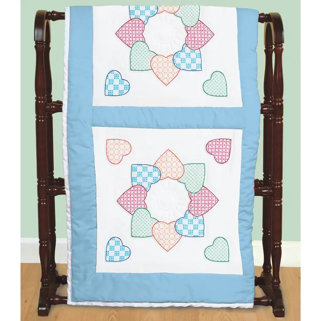 JACK DEMPSEY-Stamped Cross Stitch & Embroidery Quilt Blocks. Create a beautiful quilt top using this great kit. It consists of individual squares to stitch and join together to form a quilt top. The embroidery designs have been stamped using ink that washes away with any liquid and the fabric is a cotton/poly blend broadcloth. This package contains six 18x18 inch quilt squares, instructions for completion and care, and complete DMC floss requirements. Fabric, backing, batting, hoop, needle, thread, and floss all sold separately. Design: Patchwork Hearts. Made in USA.