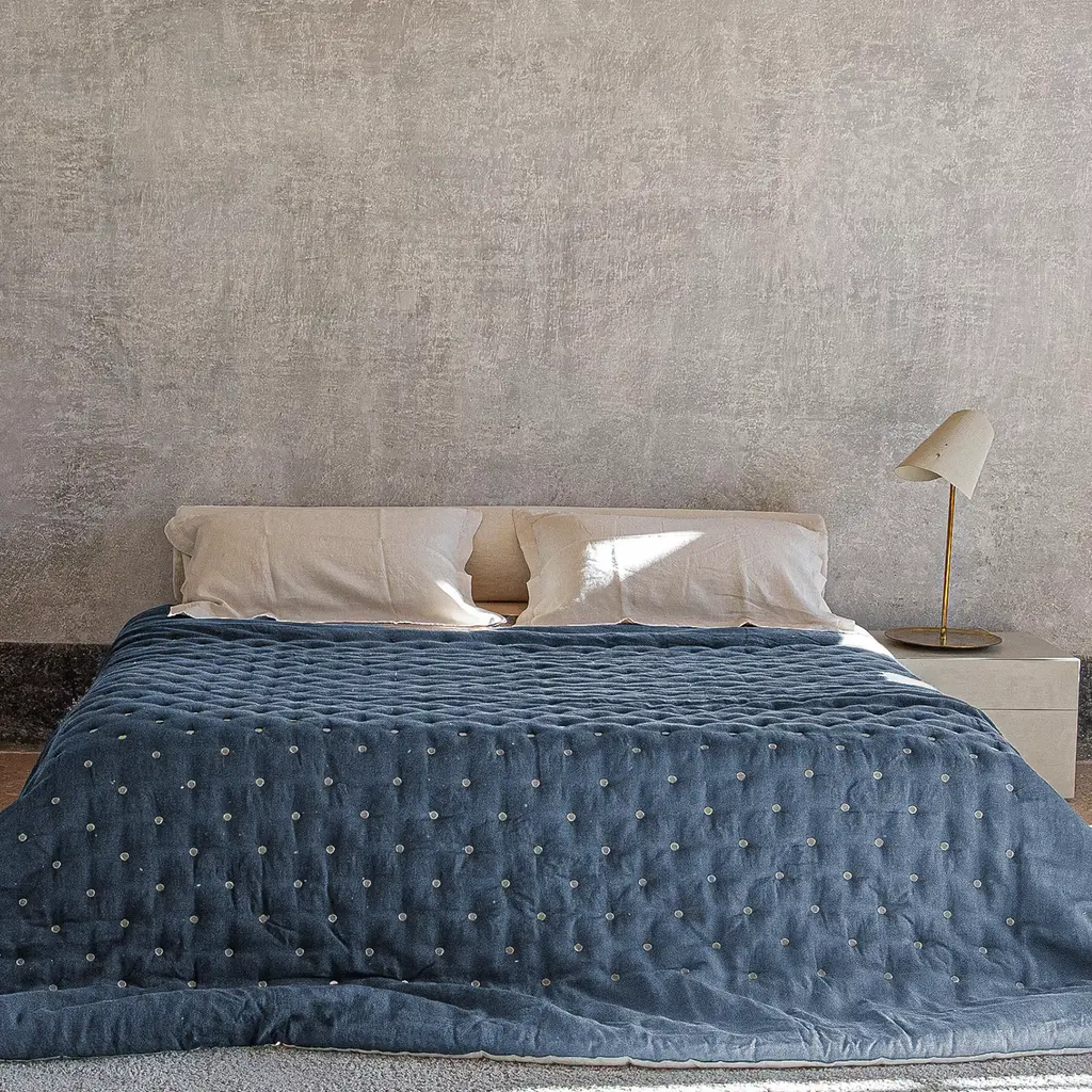 Enhance your space with the light blue linen quilt, a year-round bestseller from Once Milano. Handmade with care, it features a natural side and a color side available in your choice of 9 different shades. This versatile quilt offers both style and comfort, suitable for any season. A perfect blend of elegance and practicality for any bedroom. Available in various sizes, please ask the concierge for other details.