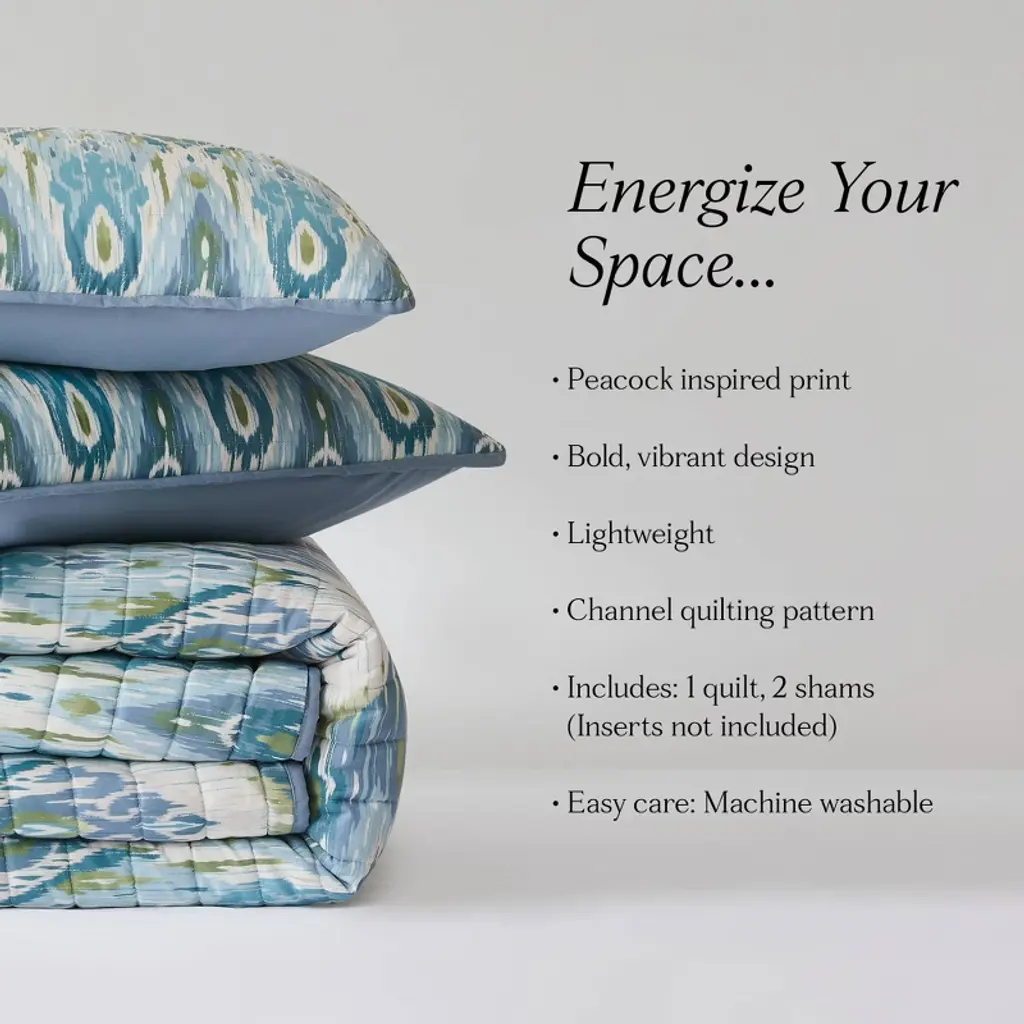 Much like a peacock's vibrant feathers, this quilt set is a stunning centerpiece for your bedroom. Its colorful eclectic design brings an energizing flair, complementing maximalist or boho style spaces. This quilt set is crafted from a soft microfiber with a lightweight polyfill. This 3 piece bedding set includes 1 quilt and 2 shams. STANDARD 100 by OEKO-TEX® certified, all components have been tested and certified free from harmful substances. Machine washable for easy care.