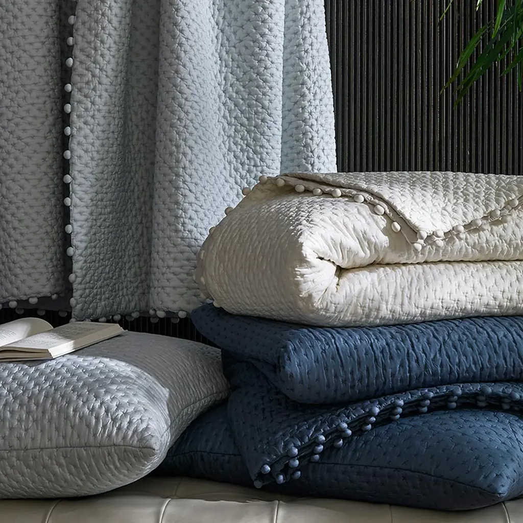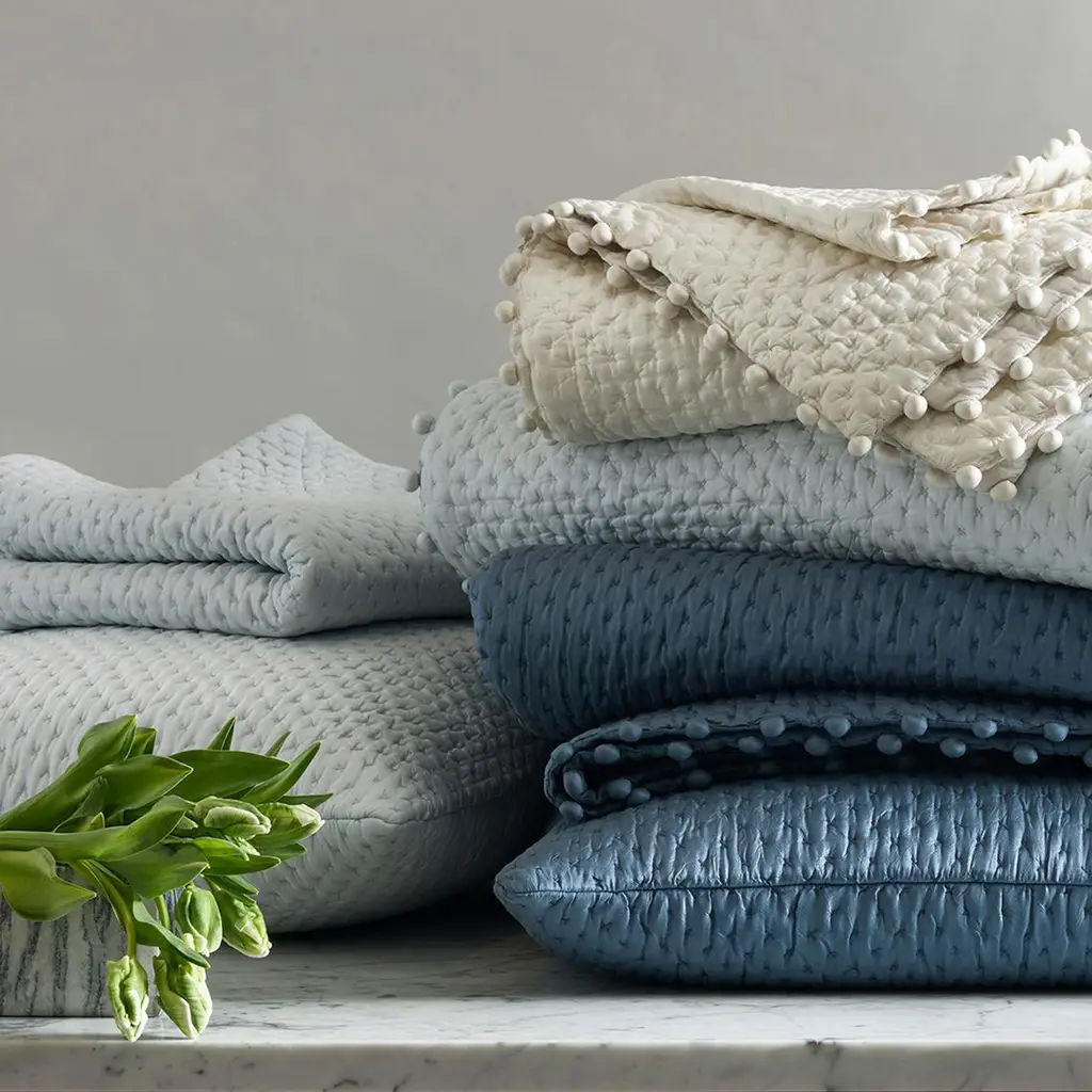 Margaret is precious in feel and robust in craft, featuring 100% hand-stitched silk quilting across the front and cotton voile on the back. It's breathable, elegant and has a natural texture and versatility, whether tucked in formally or casually strewn across a bed. Small round poms along its edge make a delightful accent.