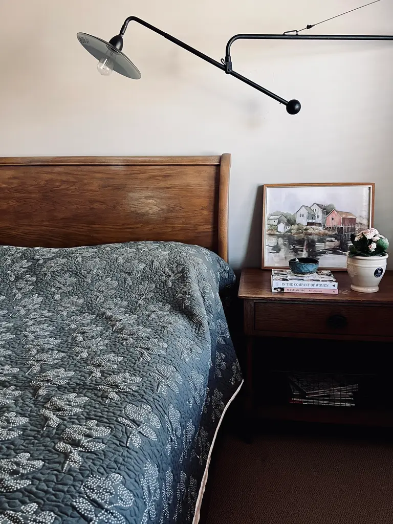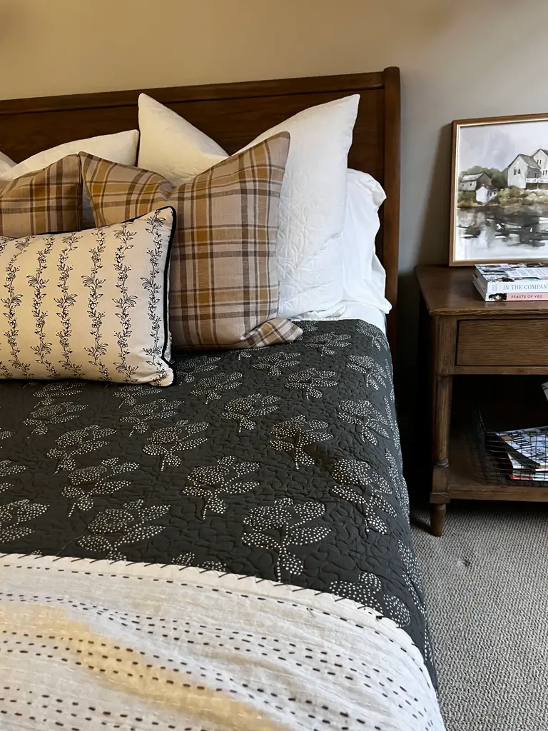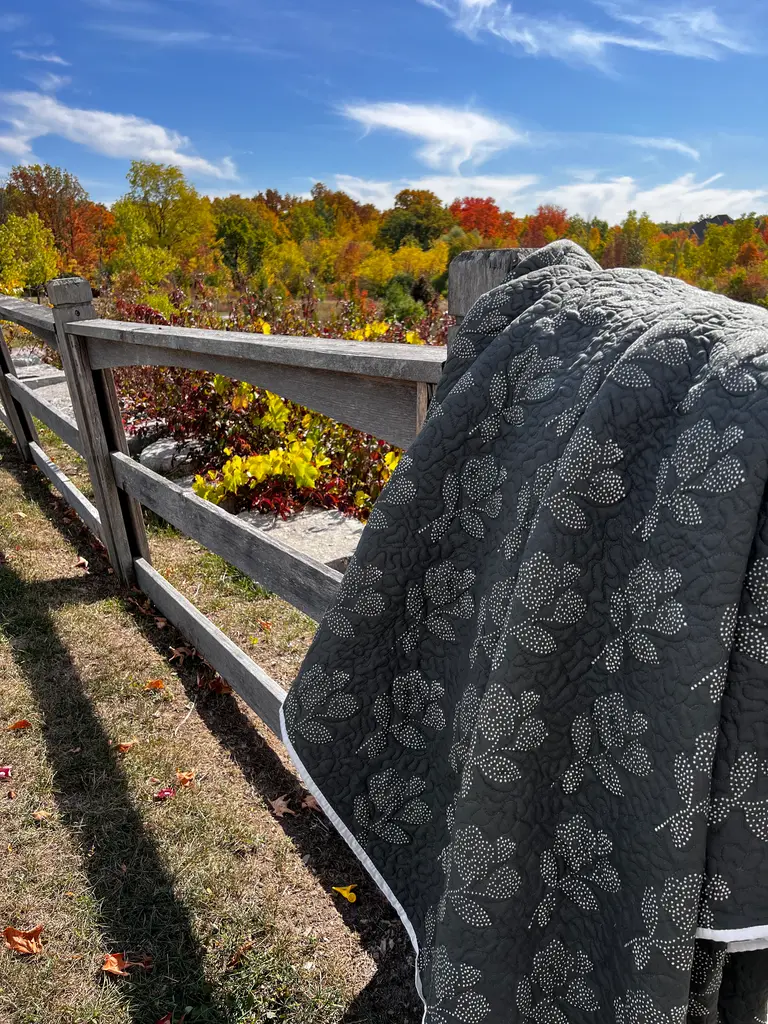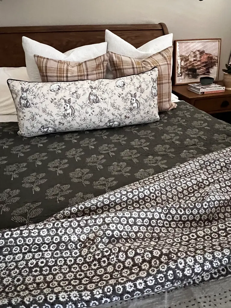 Midnight Bloom Quilt Hand Block Printed • Naturally Dyed • Reversible Wrap yourself in the quiet beauty of the Midnight Bloom Quilt, where timeless craftsmanship meets understated elegance. Featuring delicate dotted florals blooming across a deep chocolatey charcoal base, this hand block printed quilt evokes the magic of moonlit gardens and starlit skies. Expertly printed by skilled artisans using traditional woodblocks and natural dyes, each quilt is a one-of-a-kind expression of slow design. The subtle floral pattern adds texture and depth, while the contrast piping gives it a clean, refined finish. Lightweight yet cozy, it’s perfect for layering across seasons—on your bed, reading nook, or as a comforting throw. Product Features: • Hand block printed using traditional techniques • Naturally dyed with eco-friendly pigments • Reversible design with soft contrast print on the back • 100% cotton shell with breathable surgical cotton filling • Lightweight, soft, and perfect for all seasons • Ethically handcrafted in India Care Instructions: Cold wash separately on delicate cycle. Line dry in shade.