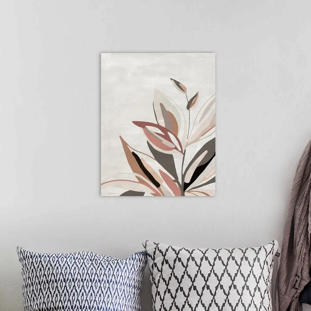 A beautiful and serene illustration of a flowering stem in shades of rust and olive green on a neutral grey background
