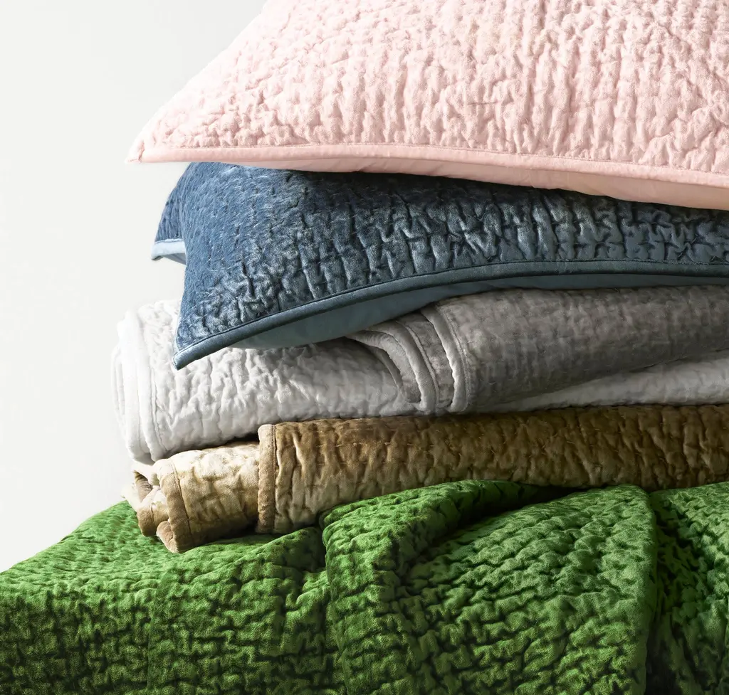 Love at first touch, you will melt at the hand feel of this sublimely soft-to-the-skin scrumptious quilt. Relaxed and inviting, double diamond Kantha quilted cotton velvet. Layer on the romance, with velvet for every season.