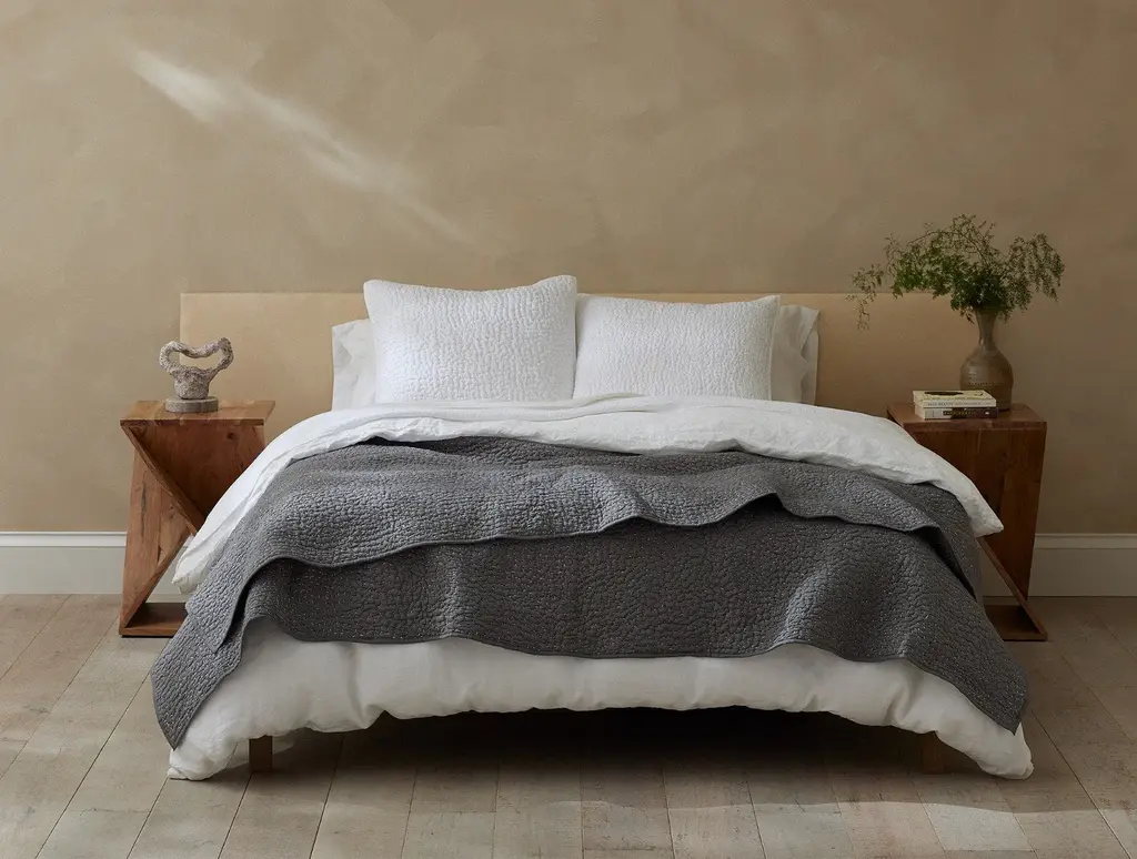 Inspired by the traditional kantha quilts of India. To create these calming waves of tiny, contrasting stitches, we embroider each quilt by hand. Natural variations in texture wrap you in breathable comfort that layers beautifully. For the Undyed version, the threads are multi-colored. We use premium organic cotton for the interior batting and outer shell. These natural fibers feel breathable and soft to the touch, an ideal layering piece for year-round comfort.