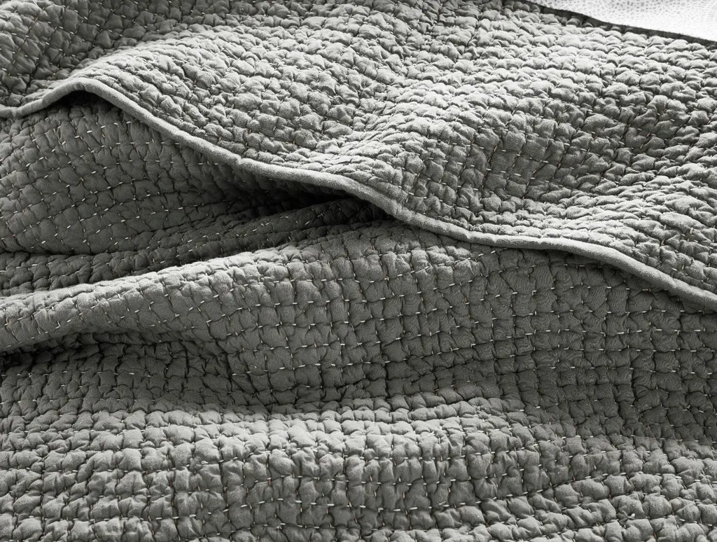 Inspired by the traditional kantha quilts of India. To create these calming waves of tiny, contrasting stitches, we embroider each quilt by hand. Natural variations in texture wrap you in breathable comfort that layers beautifully. For the Undyed version, the threads are multi-colored. We use premium organic cotton for the interior batting and outer shell. These natural fibers feel breathable and soft to the touch, an ideal layering piece for year-round comfort.
