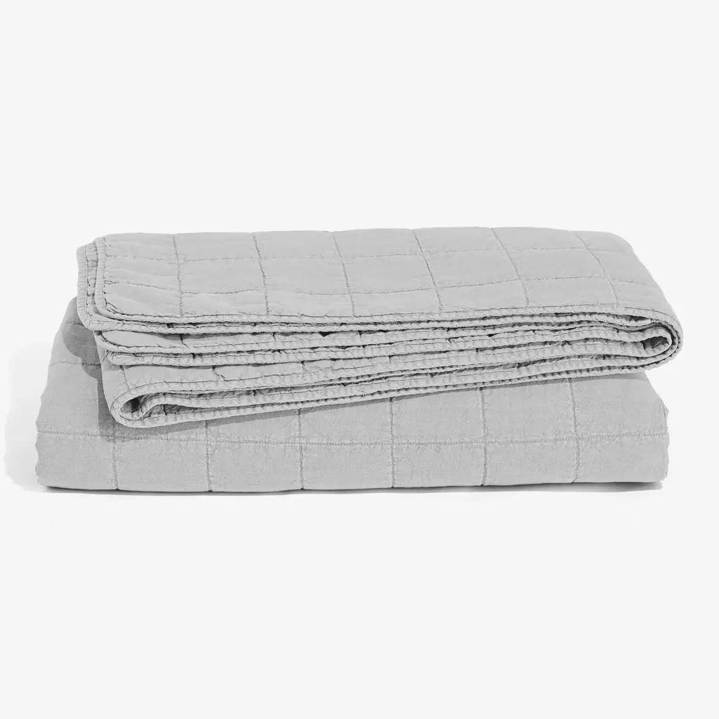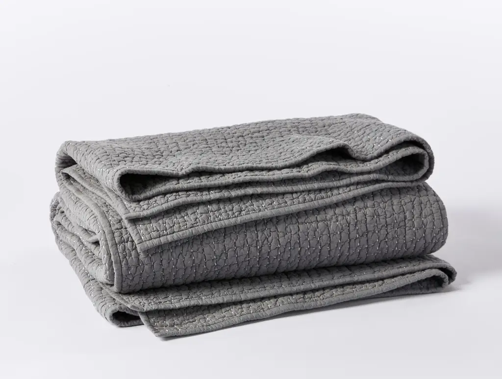 The simplicity of linear hand embroidery is celebrated in the subtle stitching that dots this solid landscape of crinkled percale fabric. The fog-washed hues of natural plant life along the shoreline of Northern California are translated into channels of complementary-colored threads hand-stitched into horizontal lines throughout. Organic cotton batting adds a plush, medium-weight warmth. To get the full crinkled effect, we recommend washing and drying before first use.