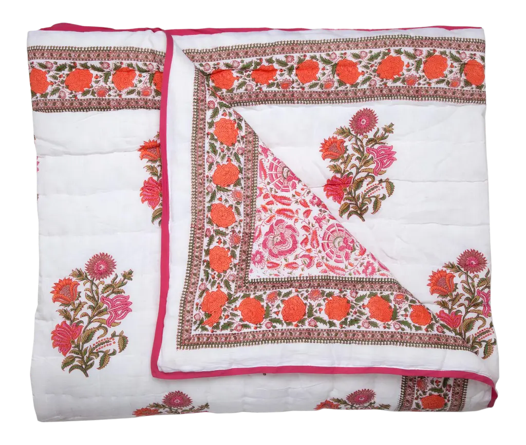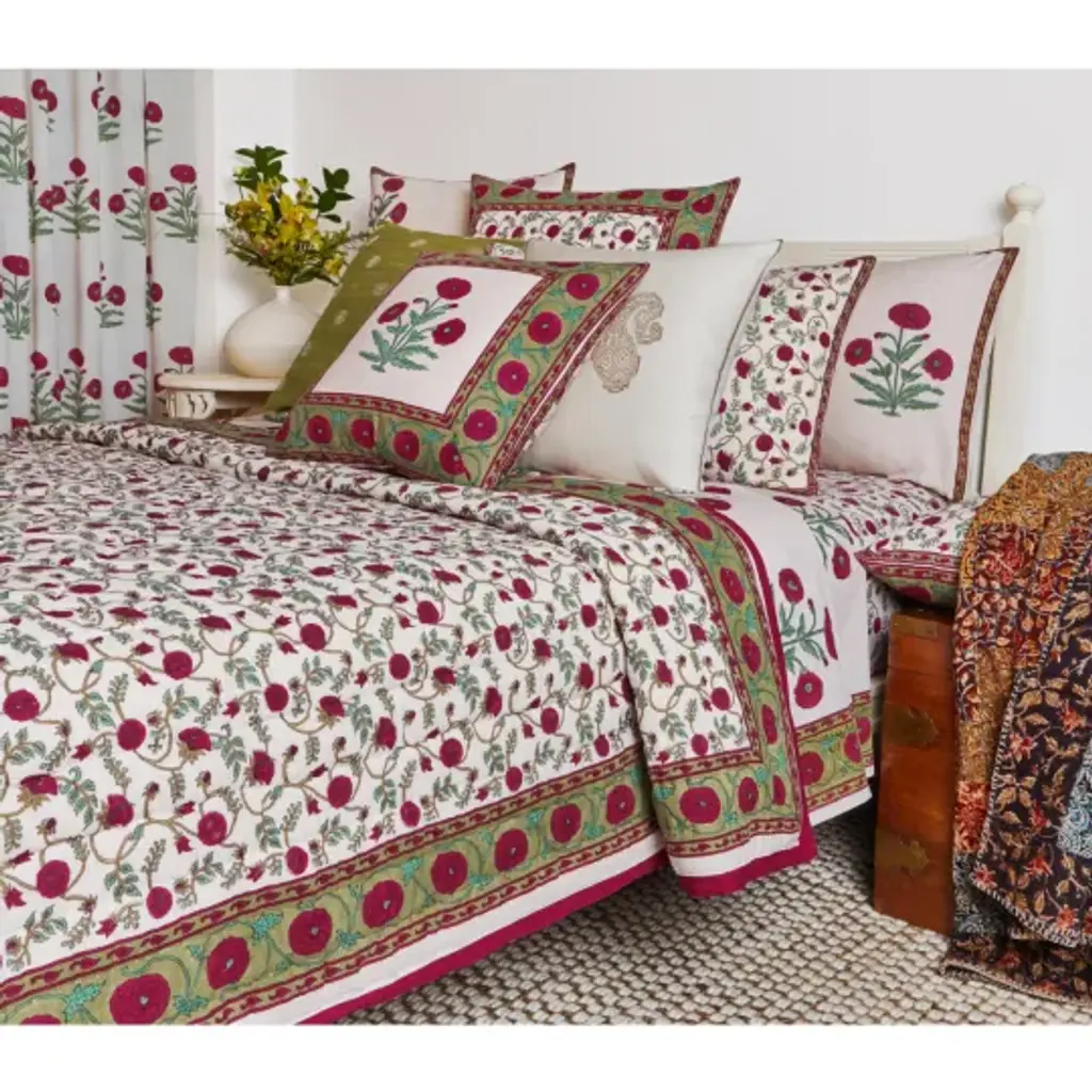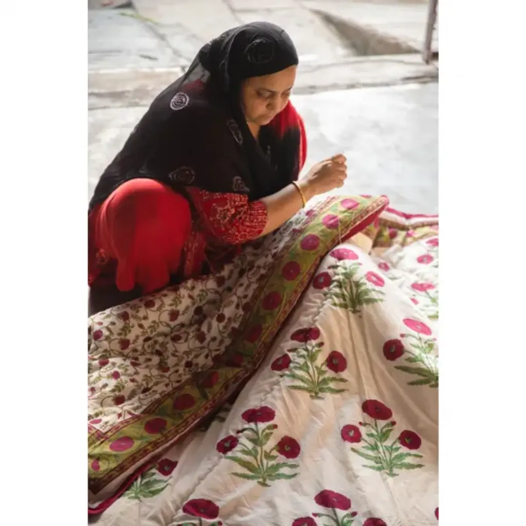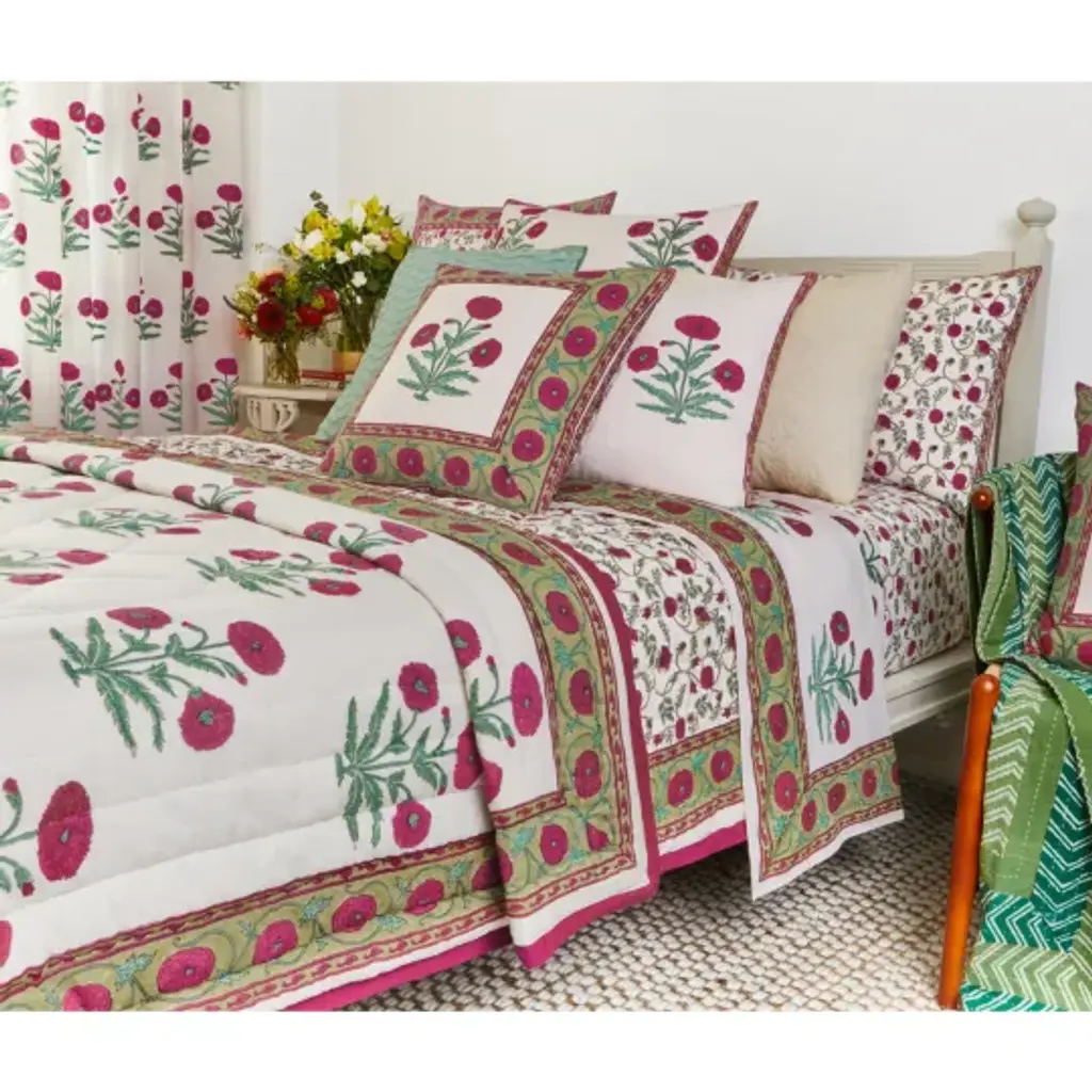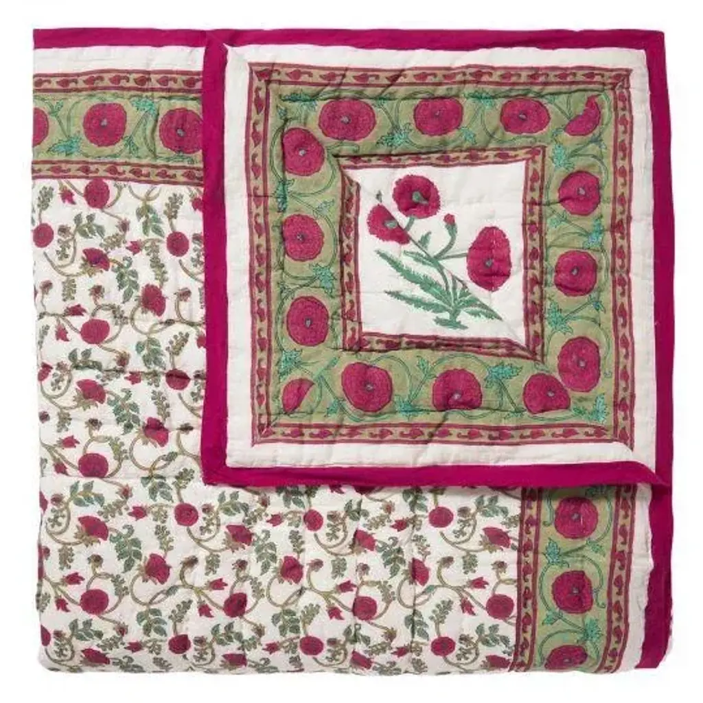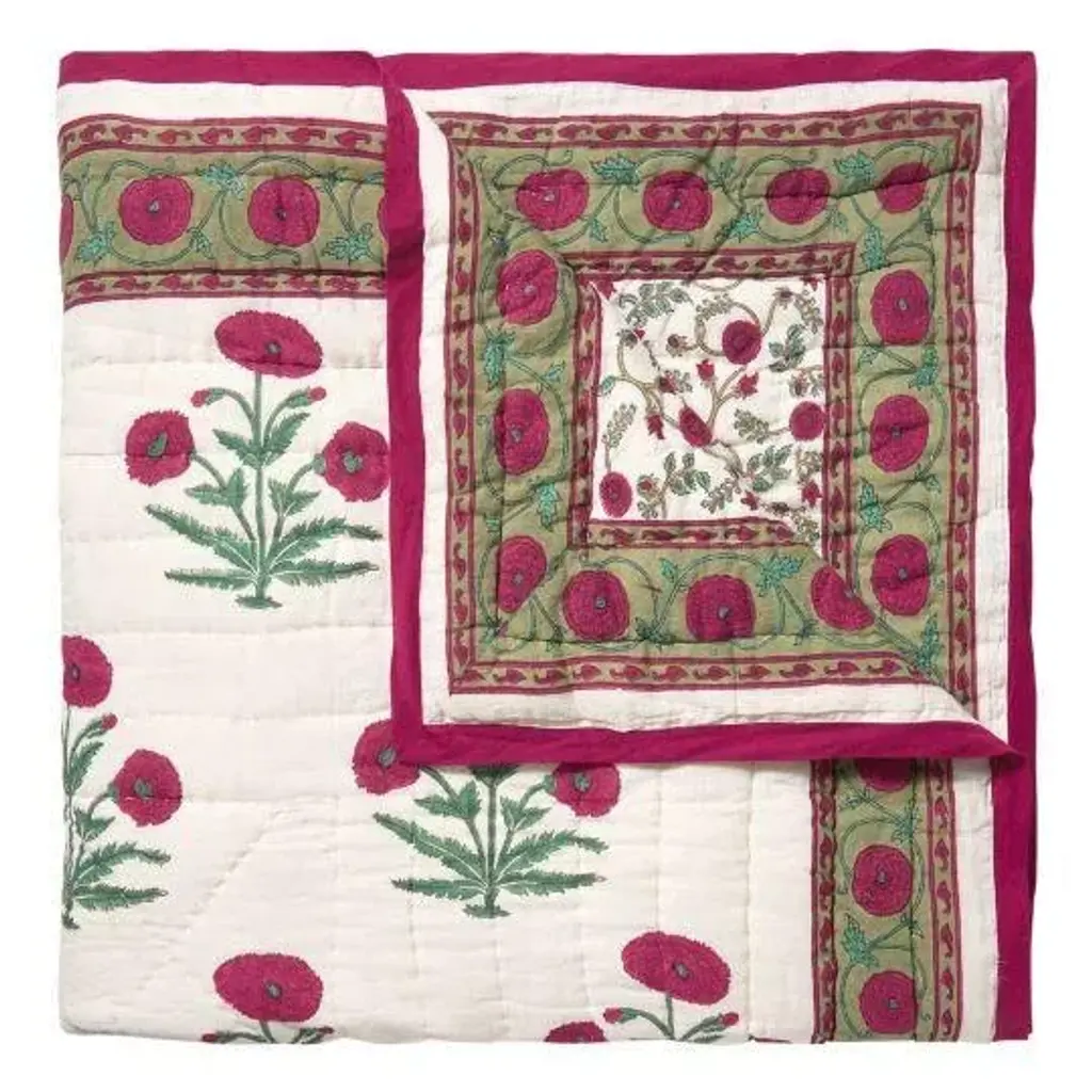 The Poppy-Gina design in magenta pink on cream is inspired by 17th century Mughal botanical patterns. The design showcases the iconic repeating pattern of poppy flowers as seen in textile fragments on display at The Metropolitan Museum of Art, complemented by our Gina floral vine pattern on the reverse. A stately border of meandering poppy blossoms on green makes for a stunning finish. Simply flip the quilt to refresh your room whenever you desire a change. Our handmade all-natural Indian quilts feel lightweight and breathable but remain perfectly warm to sleep under all year round, except during the hottest of months. Hand block printed using ancient techniques that produce subtle variations in design, these quilts blend beautifully with white or solid colors. The super-fine cotton voile feels soft as a cloud and only grows softer with each wash. Materials: Quilts are made of light-weight soft cotton voile with 100% fluffy cotton fill. Crafts: Hand block printing. Hand quilting with patterned running stitch. DIMENSIONS Quilt King: 108" wide x 110" long CARE & MAINTENANCE Protect from direct sunlight when using. Hand or machine wash separately in cold water on gentle cycle. Use a mild detergent without any bleach or fabric softeners. Do not soak or wring the fabrics. Scrub gently if needed. Tumble dry on low heat or air dry in the shade. Test stain remover on a small area before applying.