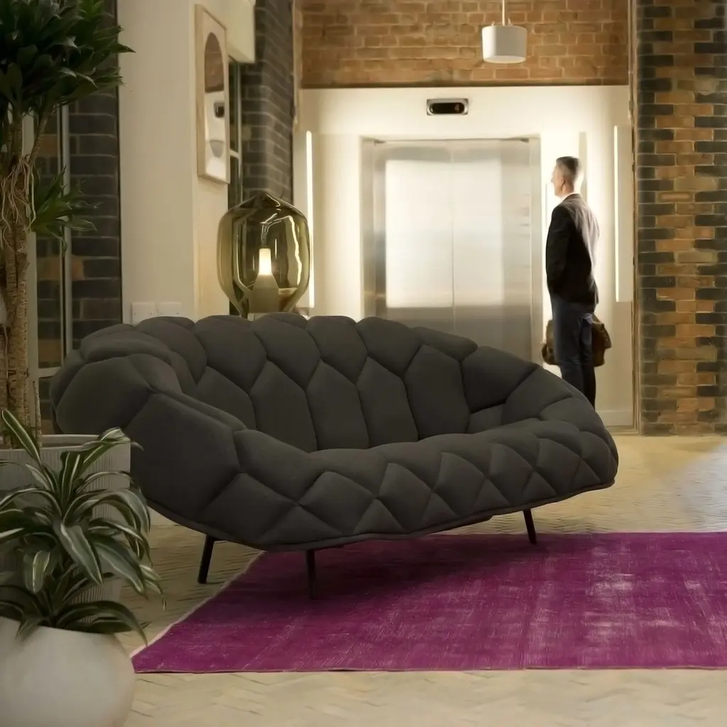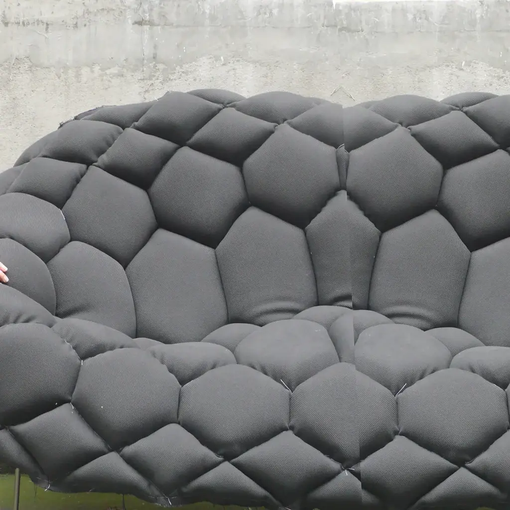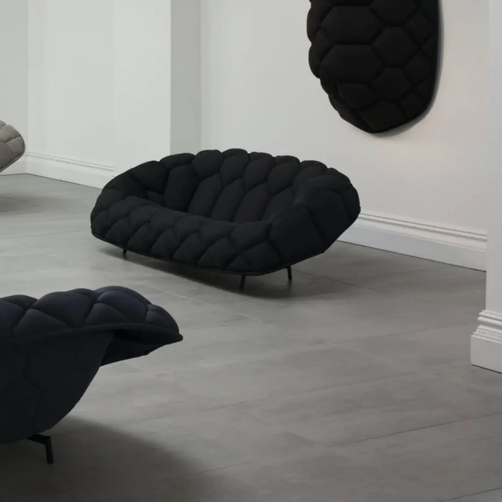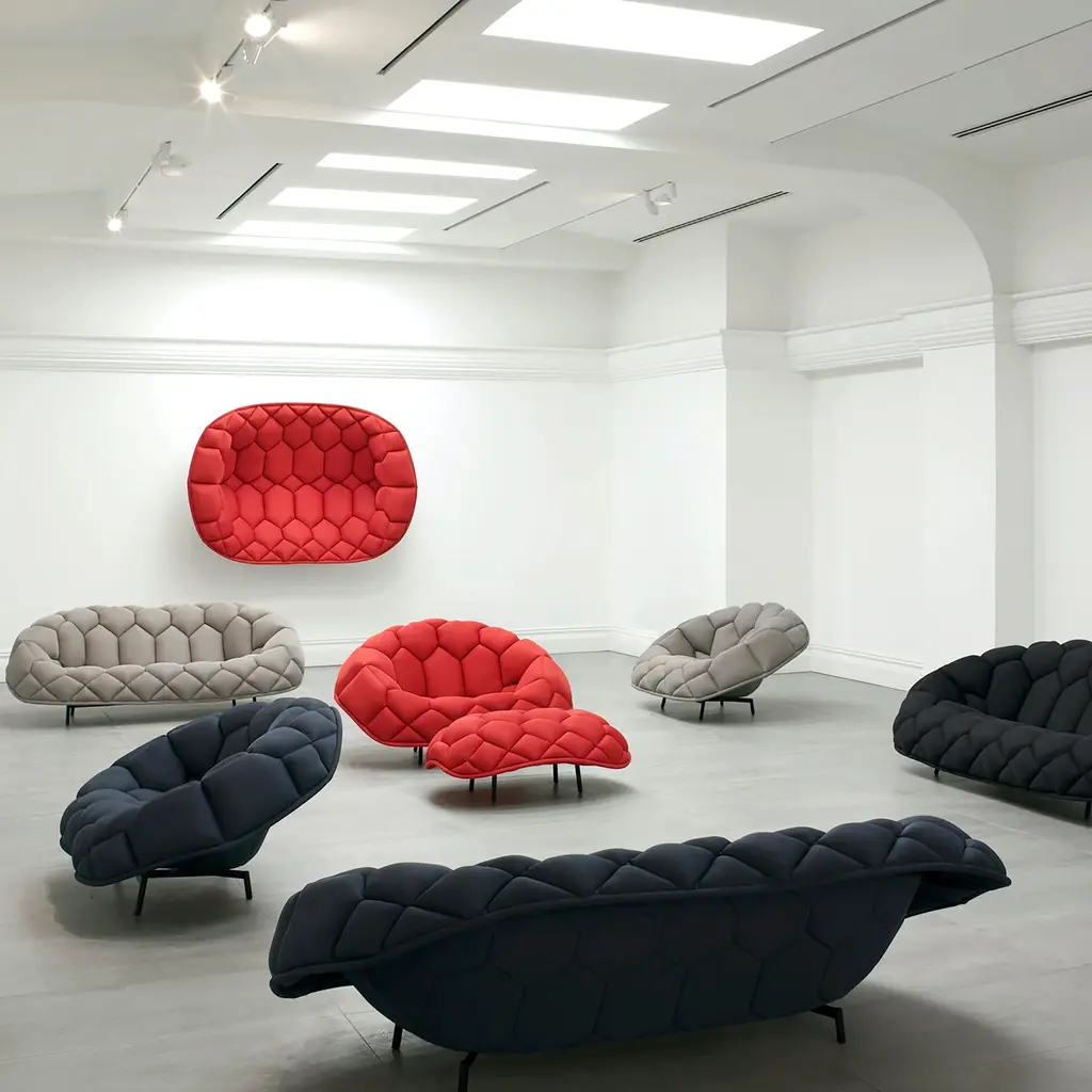 Characterized by designers Erwan and Rowan Bouroullec as a "superhero, you can see its muscles exposed through the stretch fabric," their mind-bending Quilt seating finds its ultimate expression in a standard 3-seater sofa. With its signature plumped contours, it adapts to easy sprawling as well as individual sitting postures with complete comfort via its honeycomb-like surface with individual foam insets. Despite its free-form ease, Quilt's innovative construction with a bright stretch-fabric covering and a glass-reinforced polyester core along with a geometric metal base assures it remains neat and presentable, even in high-use settings..
