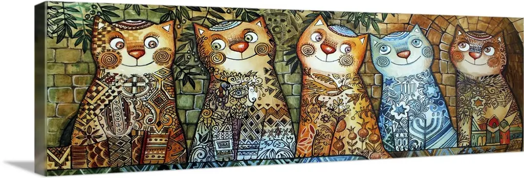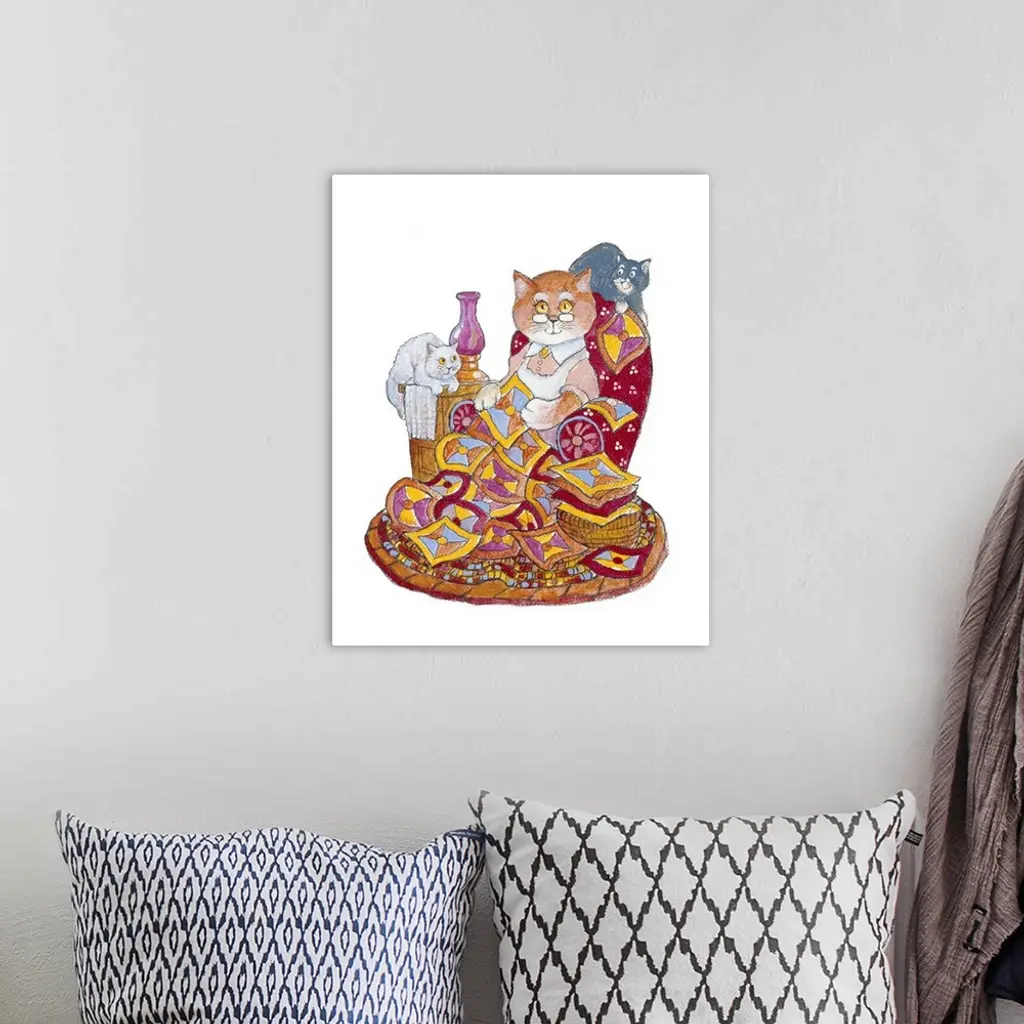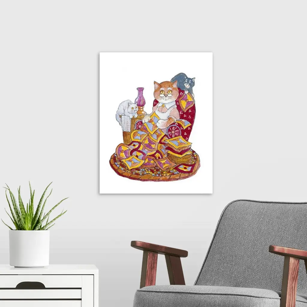 Cat in spectacles sits in arm chair quilting, surrounded by two pet cats.