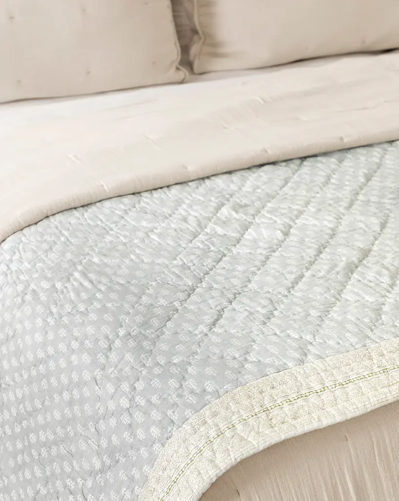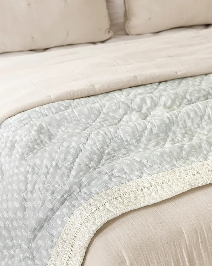 Add texture and elegance to your bedding textiles with our Regatta Block Print Quilt. Block printed by hand in a palette of soft blue, olive, and deep brown, the cotton quilt is a display of craftsmanship and character. Made with 100% cotton fabrication, the quilt brings warmth as well as style.