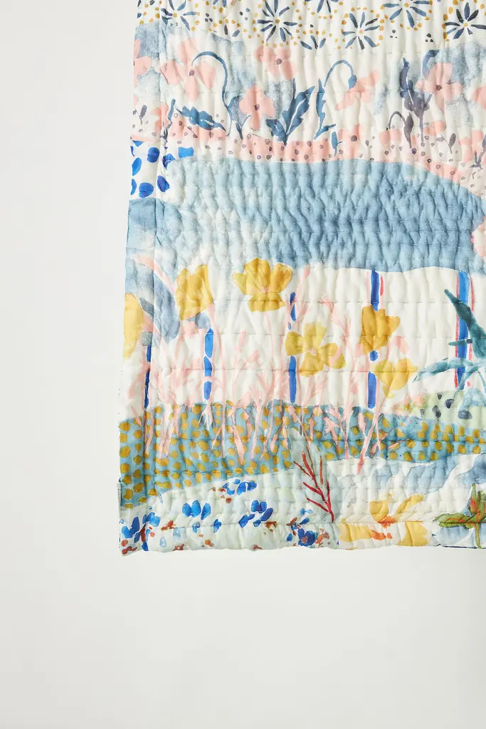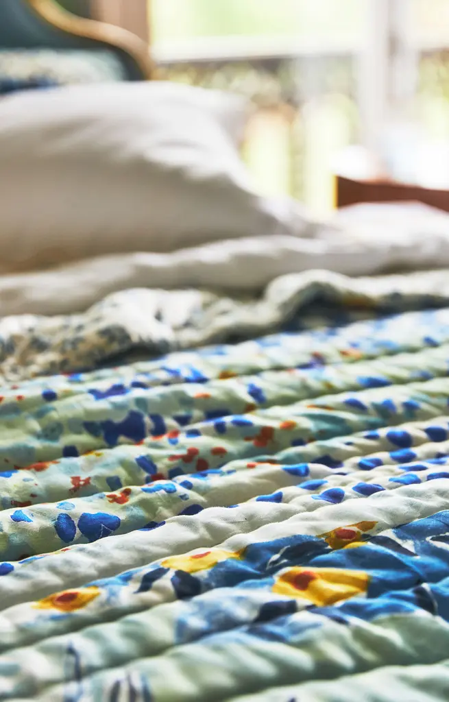Featuring a landscape of florals topped with intricate stitching, this eye-catching collection instantly refreshes any bedroom - no matter the season.Informed by decades of technique development, the age-old process of hand screen- and block-printing has become a cultural cornerstone in Jaipur, India. The highly skilled artisans at the forefront of this practice craft each of our quilts through a time-tested method of 13 different processes, each of which is done by hand - including the final kantha stitch. From the expert color master - who blends each hue with its own unique formula - to the craftsmen and women - who, in pairs, lay down each screen frame with stunning precision - our team of makers apply their expertise and knowledge to a line of exclusive, handcrafted bedding that adds an element of unparalleled artistry to your home.Each one-of-a-kind quilt is crafted from a lightweight voile and finished with delicate, hand-stitched kantha. To help preserve the quality of your unique work of art, we recommend washing on a gentle cycle with care.Looking for the sweetest of dreams? Read our guide to find the perfect bedding for you, and learn how to care for it season after season.