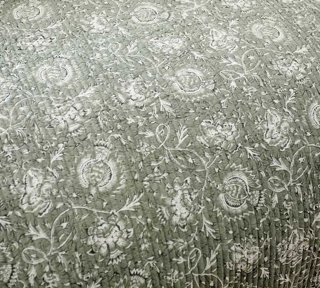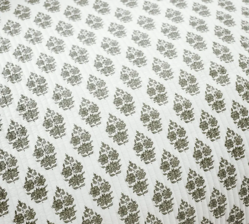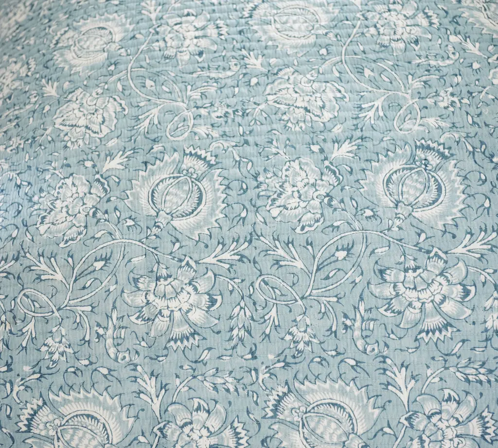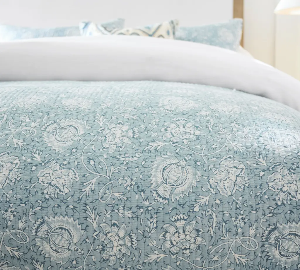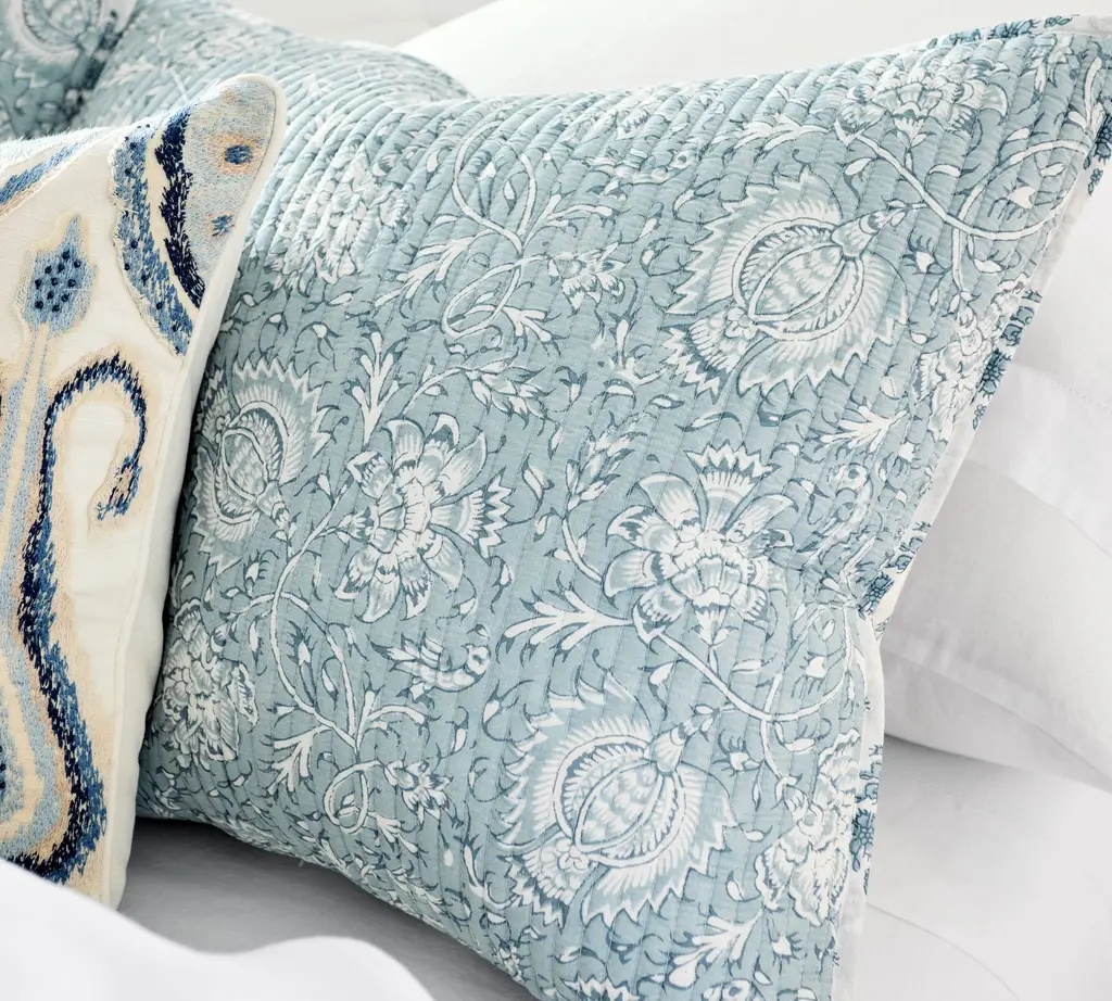 Soft, dusty hues set the tone for these lightweight summer shams. The reversible prints are inspired by Kalamkari on one side and block print on the other. Thin channel stitching lends subtle texture and a classic sensibility. Woven from breathable cotton, they're perfect for warm weather, but also layer nicely in the colder months as well.
