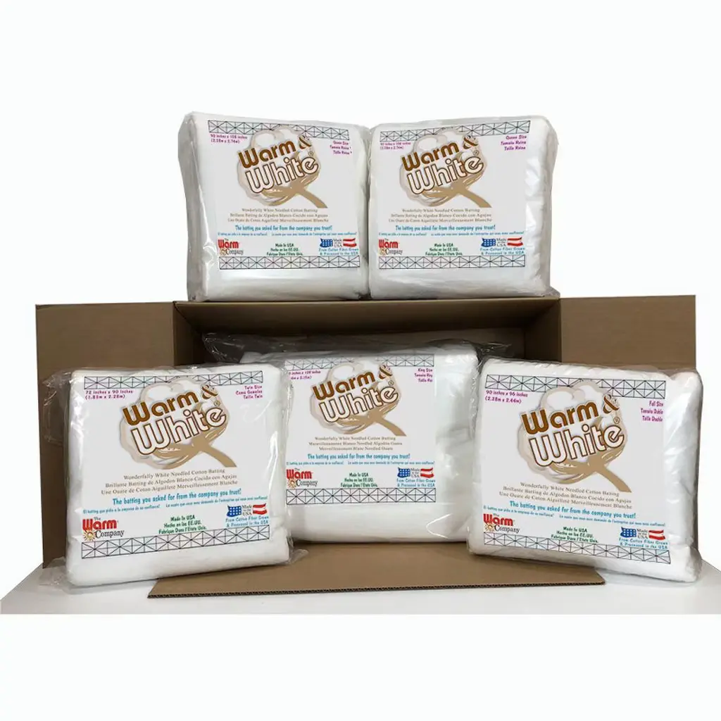 This Warm & White Assortment case comes with 1 King, 2 Queens, 1 Full, and 1 Twin. Warm & White is The Warm Company’s second highest selling quilt batting. It has become the trusted choice for quilters and crafters who work with white, pastel, and tone-on-tone fabrics. Made with purified, bright white U.S.-grown cotton, this low-loft, needle-punched batting offers exceptional softness, stability, and strength—without the natural flecks found in natural cotton batting that could show through lighter fabrics. This batting is everything you love about Warm & Natural, made from the same high-quality cotton and manufacturing process—just purified to a pristine white. Warm & White undergoes a special cleaning and whitening process that also pre-shrinks the cotton fibers, reducing shrinkage and eliminating the need for pre-washing. When looking for a finished quilt that will remain pristine without puckering around your quilted lines, Warm & White is the perfect choice! The cotton is needle-punched through a thin, durable polypropylene scrim without the use of glue or resins, creating a secure, consistent batting that won’t separate, bunch, or shift. You can quilt or tie up to 10" apart, allowing you to finish projects more quickly and confidently—whether you're a beginner or seasoned quilter. Warm & White is perfect for quilts, wall hangings, seasonal crafts like snowmen or stockings, quilted clothing, and any project where a bright, clean background is essential. Pre-Wash & Care Instructions: Pre-washing is optional. Warm & White is pre-shrunk so you will experience little to no shrinkage with your first wash. To pre-wash (if desired): hand soak in mild detergent for 20 minutes, rinse thoroughly, gently squeeze (do not wring), and lay flat to dry or tumble dry on low. Proudly Made in the USA