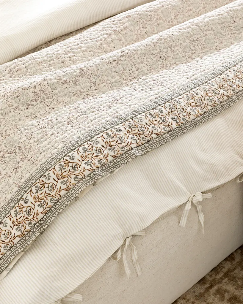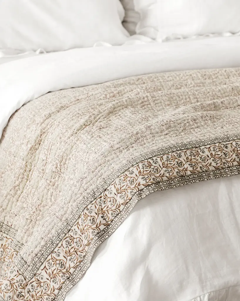 With an elegant floral pattern, the Tulare Block Print Quilt is a simple piece that layers both character and texture into bedding. The cotton voile material adds refinement to the quilt, making it the perfect detail for a primary or guest bedroom.