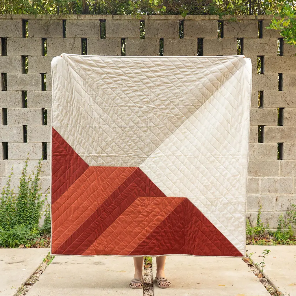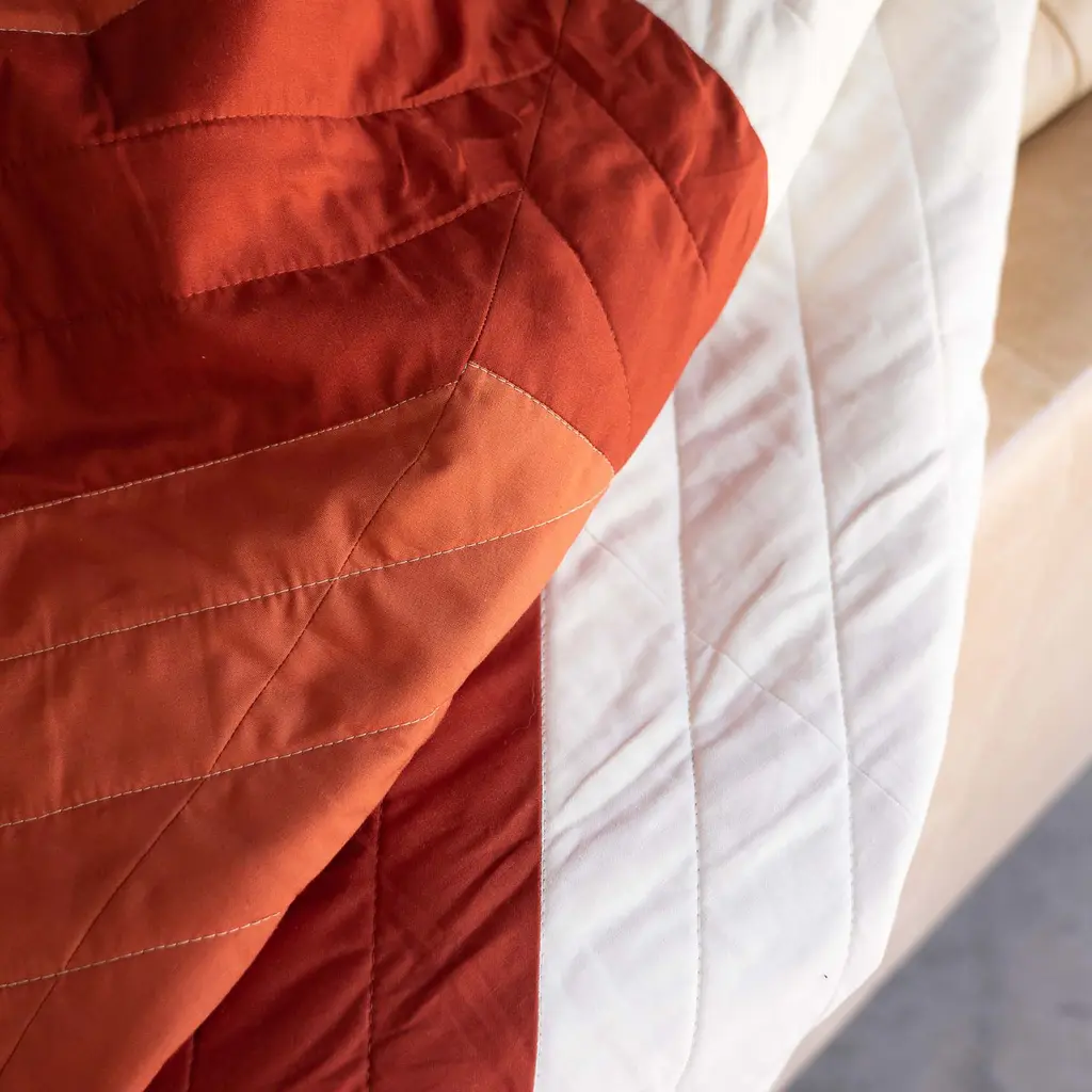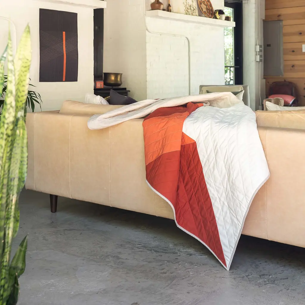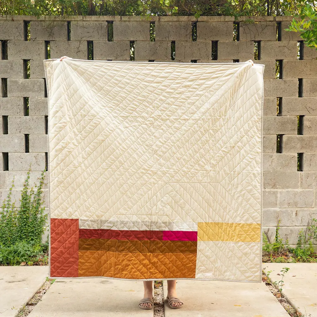 Heirloom-quality quilt made to order just for you. Modern design in a neutral-meets-bright palette. Pattern inspired by the temples of Thailand. A cozy layer for a sofa or bed.