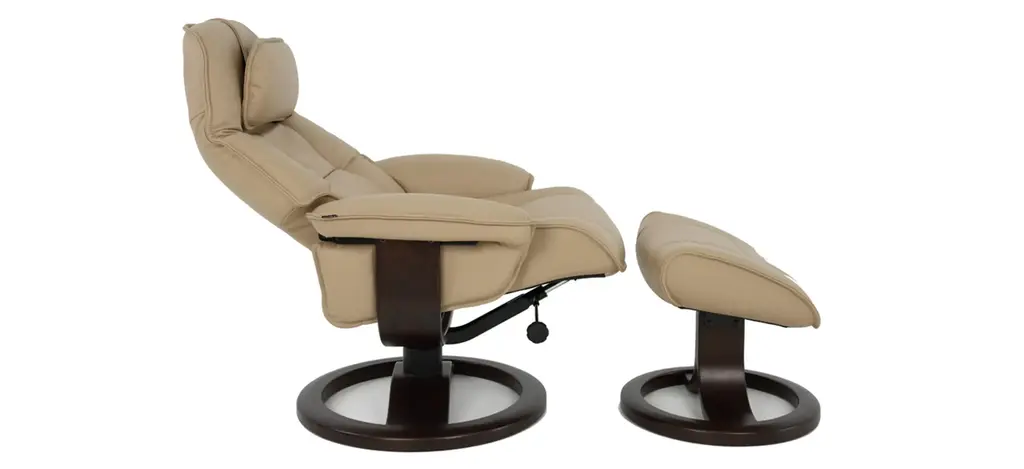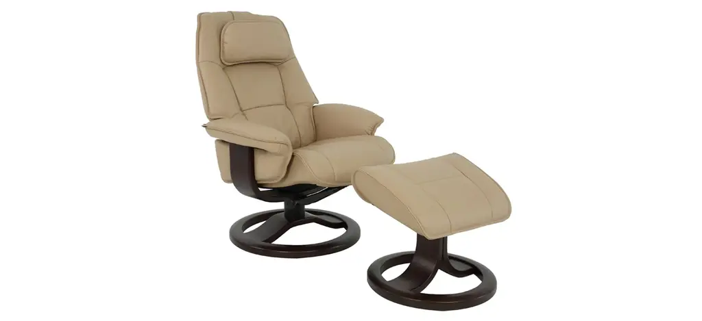 The Admiral R large recliner and ottman provides continuous support for your legs and back. The base has 360o swivel and is made with laminated, stained rubberwood for an elegant appearance. The Admiral features an adjustable head pillow for maximum comfort and a manual release adjustable headrest angle.