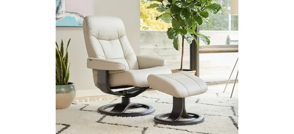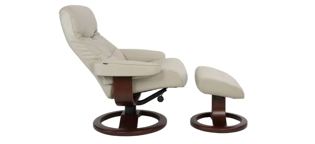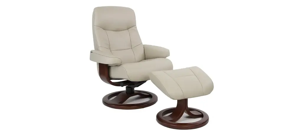 The Muldal R small recliner and ottoman provides continuous support for your legs and back. The base has 360o swivel and is made with laminated, stained rubberwood for an elegant appearance. The Muldal features an adjustable head pillow for maximum comfort and a manual release adjustable headrest angle.
