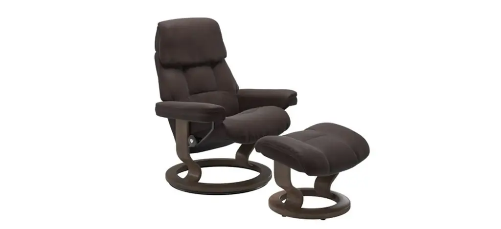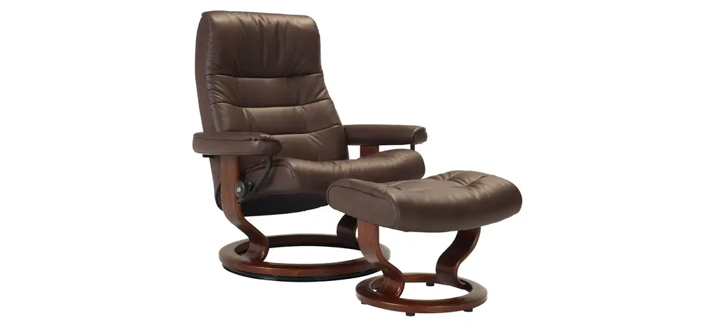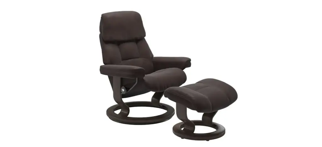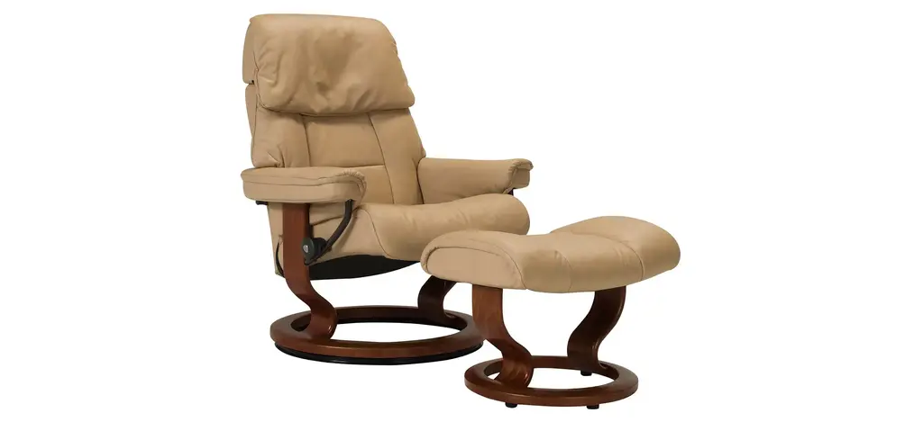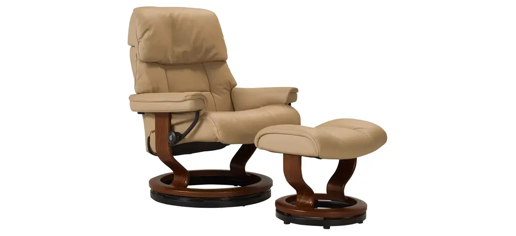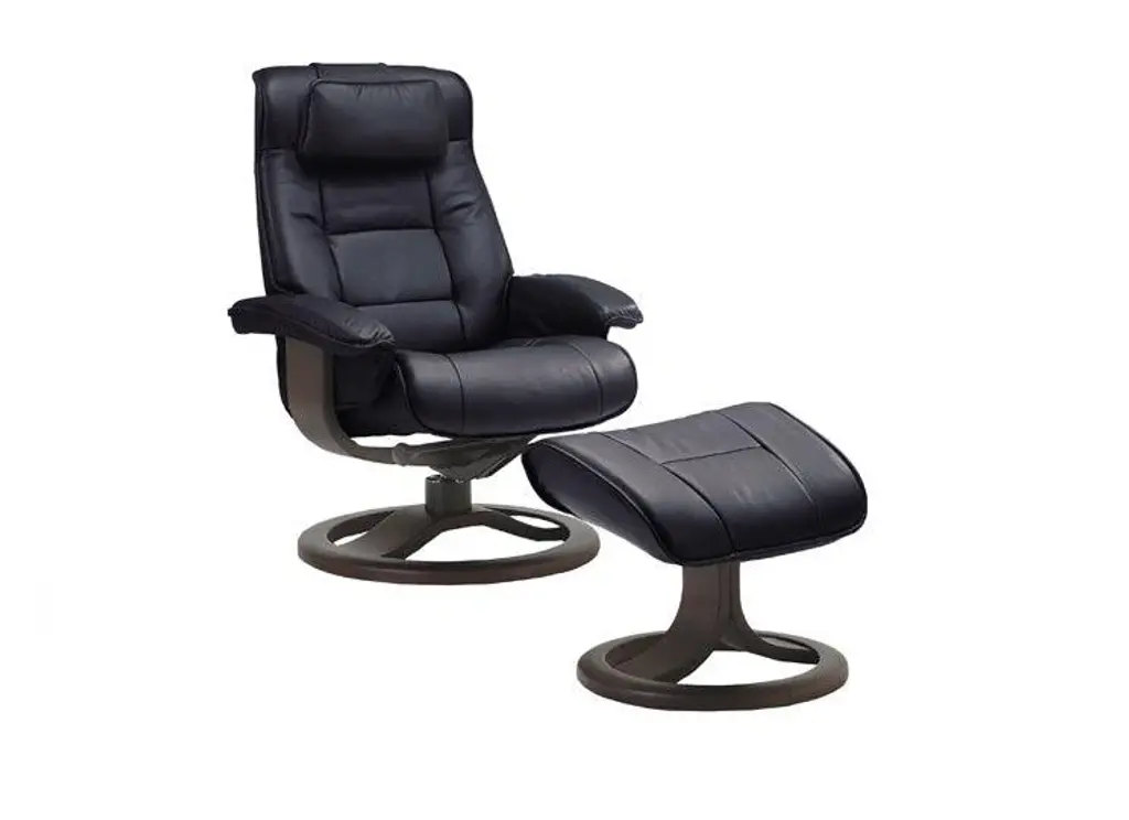 The Mustang R small recliner and ottoman provides continuous support for your legs and back. The base has 360o swivel and is made with laminated, stained rubberwood for an elegant appearance. The Mustang features an adjustable head pillow for maximum comfort and a manual release adjustable headrest angle.
