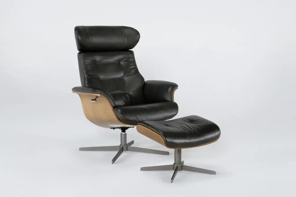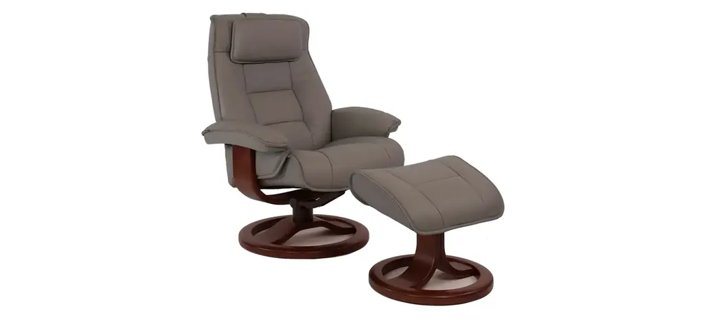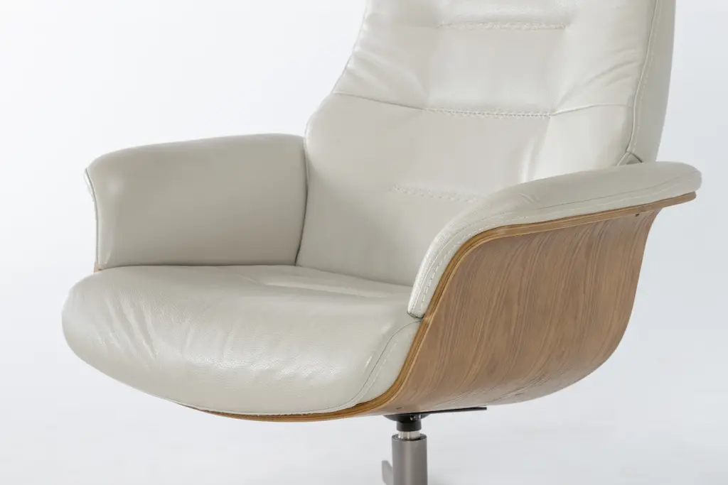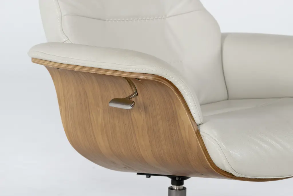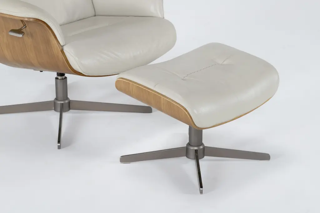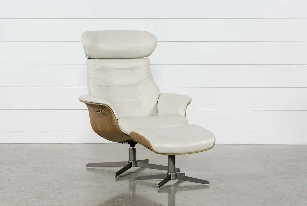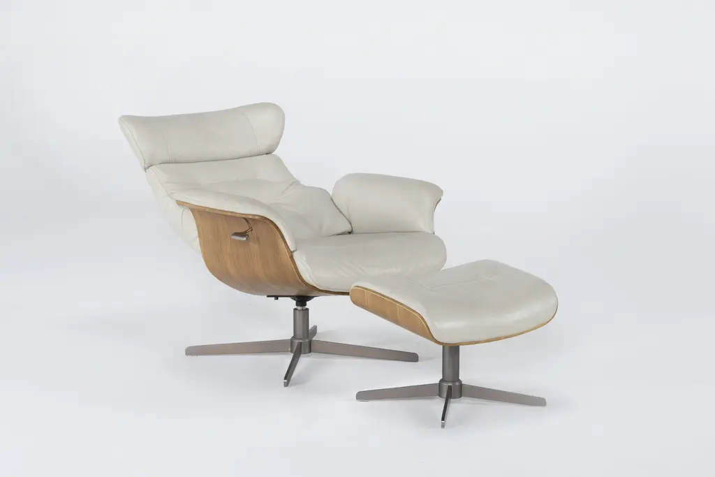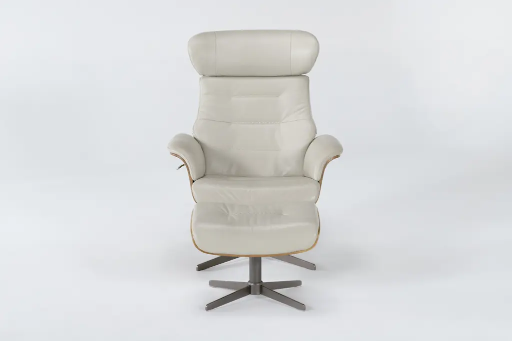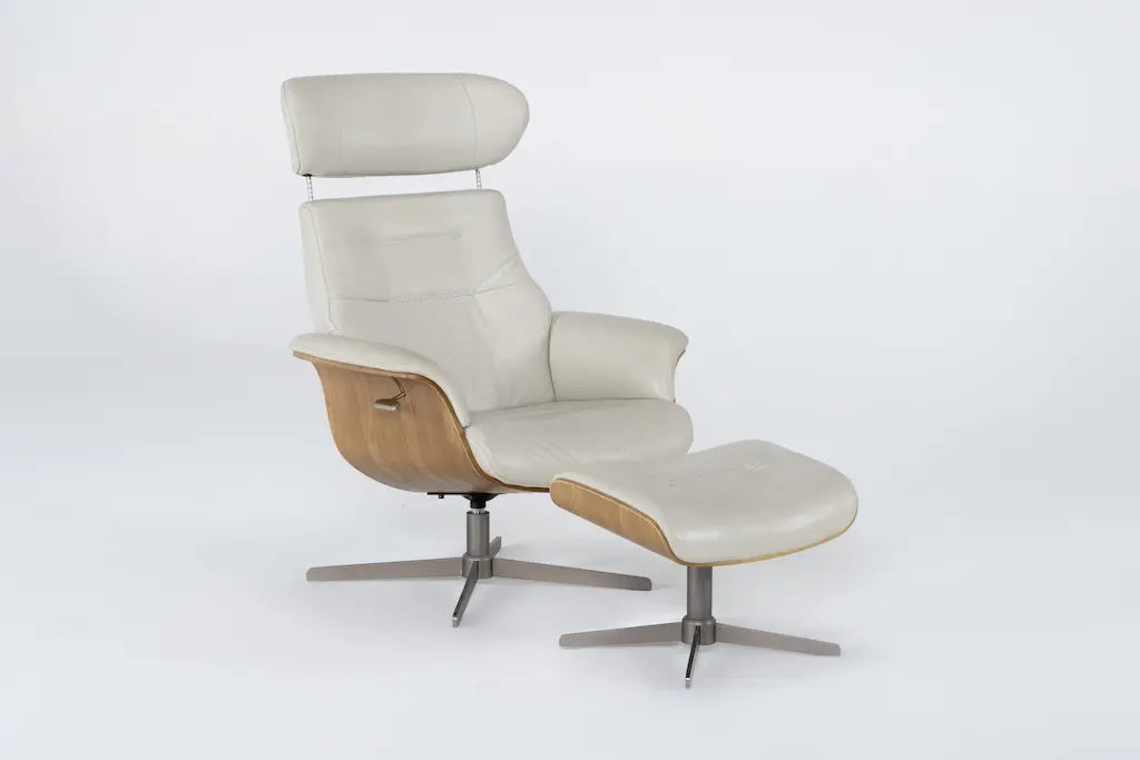 Amala Beige Bone Leather Reclining Swivel Arm Chair With Adjustable Headrest And Ottoman | Solid | Armless | Adjustable Headrests
