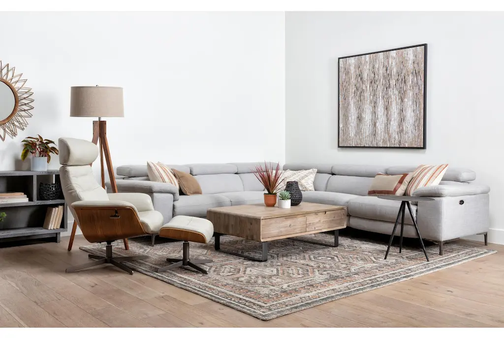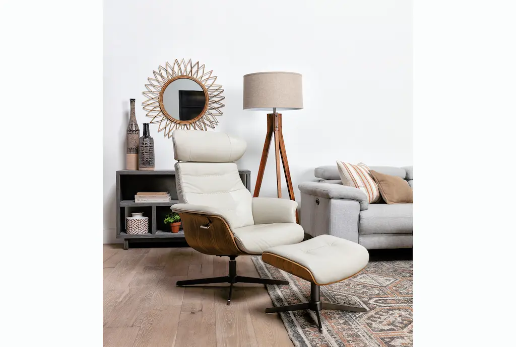 The Amala Beige Bone Leather Reclining Swivel Arm Chair with Adjustable Headrest and Ottoman is a perfect addition to any living room or bedroom. With its mid-century modern style, this chair brings a touch of sophistication to your space. Upholstered in 100% cow leather, it offers a firm comfort level and features a weather-resistant design.