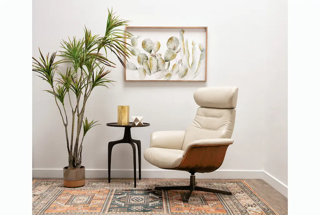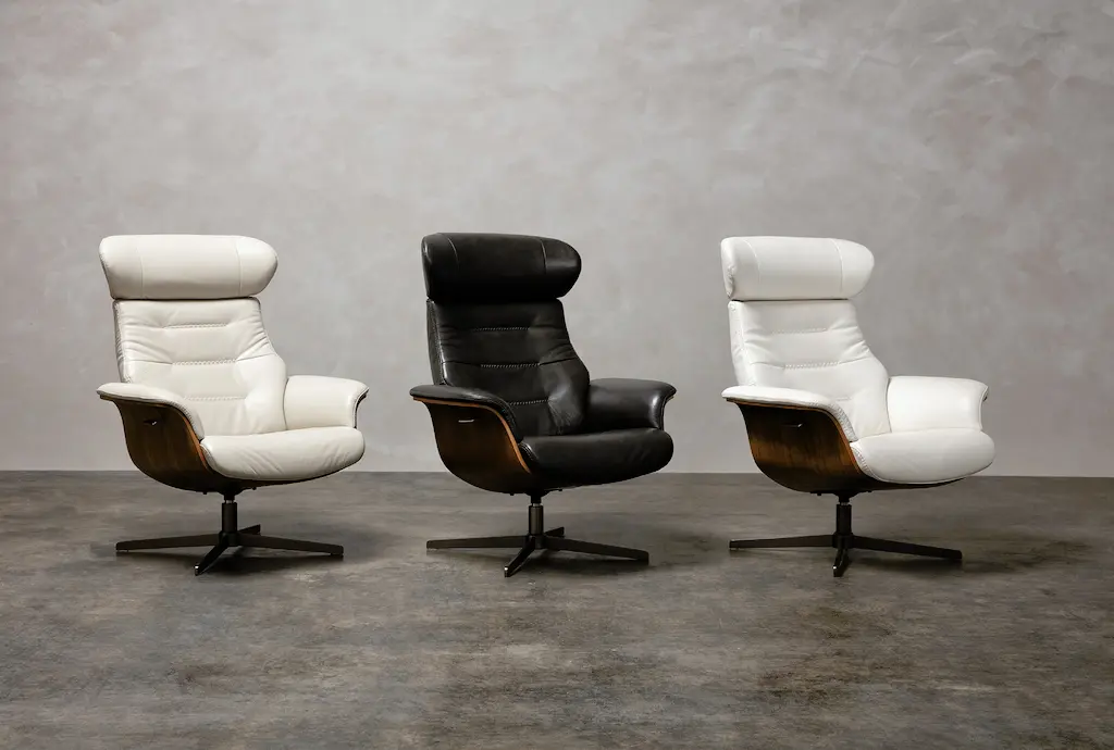 Inspired by an iconic design, our Amala reclining swivel chair delivers all the comfort, quality and sophistication of its predecessor, but at an extraordinary value. Sit and experience the luxury of 100% top grain leather, the ease of a reclining back and adjustable headrest, and the motion of a metal swivel base, which has a memory return feature that spins back to your original position. Seriously, you will love lounging here, and look cool while you do it. This design is the perfect bedroom chair, reading chair, club chair or accent chair for living room. You'll love the grounded color palette, which favors earth tones.