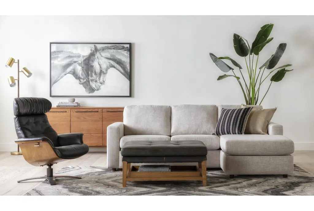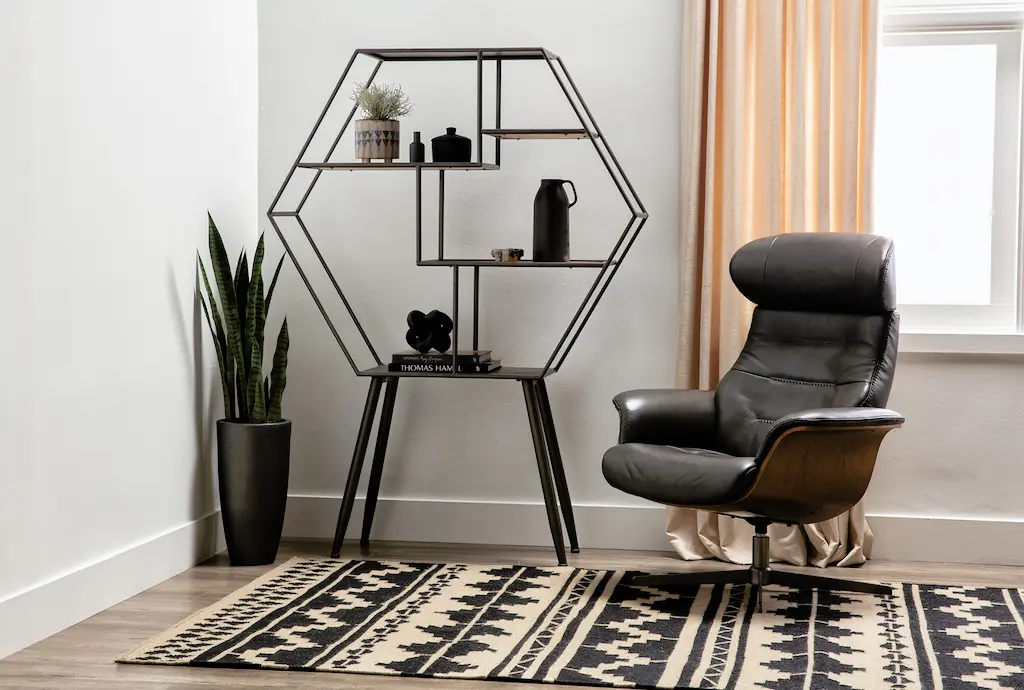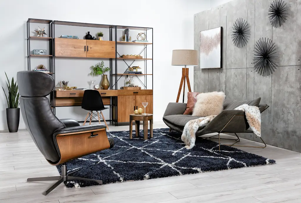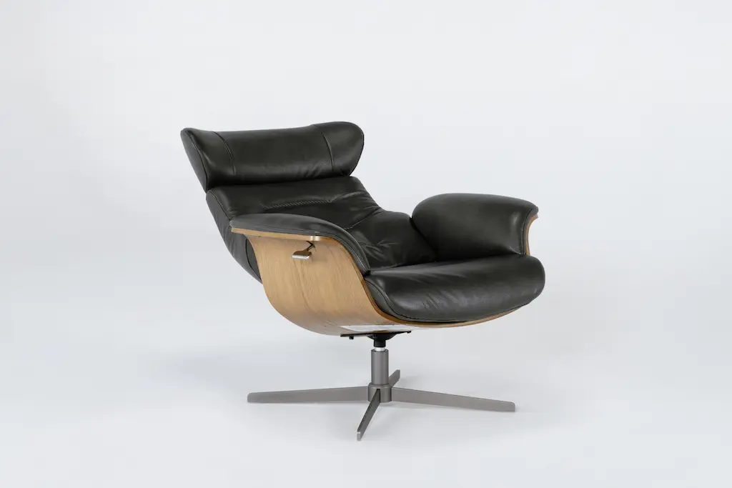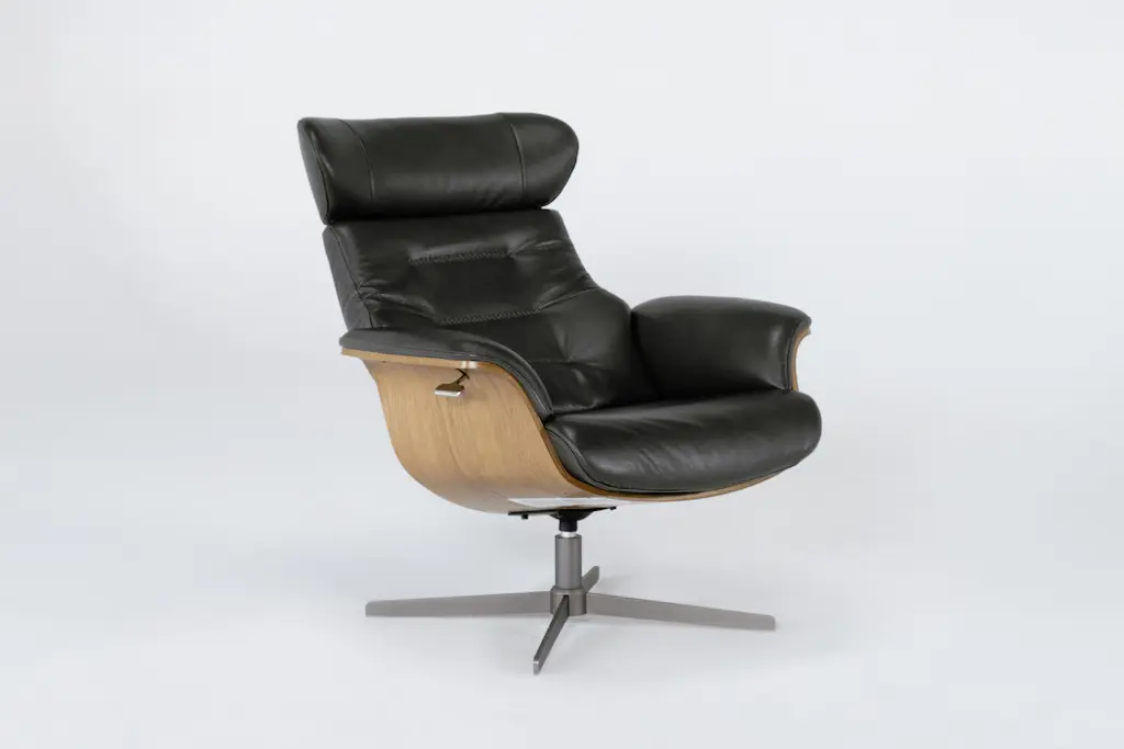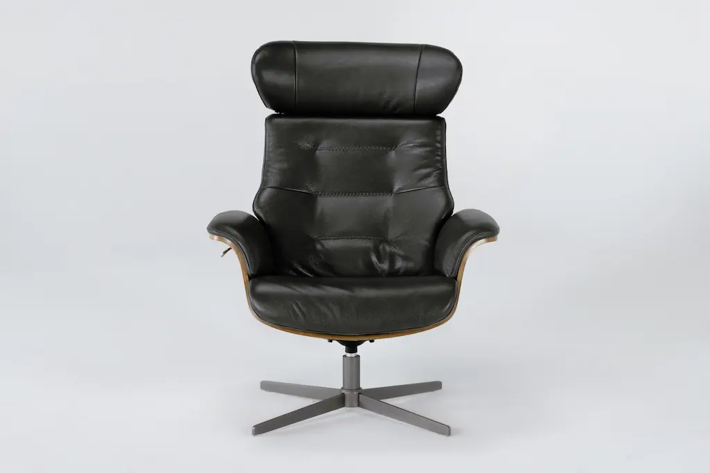 Introducing the Amala Dark Grey Leather Reclining Swivel Arm Chair with Adjustable Headrest, a perfect blend of style and comfort. This mid-century modern armchair is designed to enhance your reading and lounging experience. Crafted from high-quality cow leather, it offers a firm comfort level and features a high back and tufted design for added support.