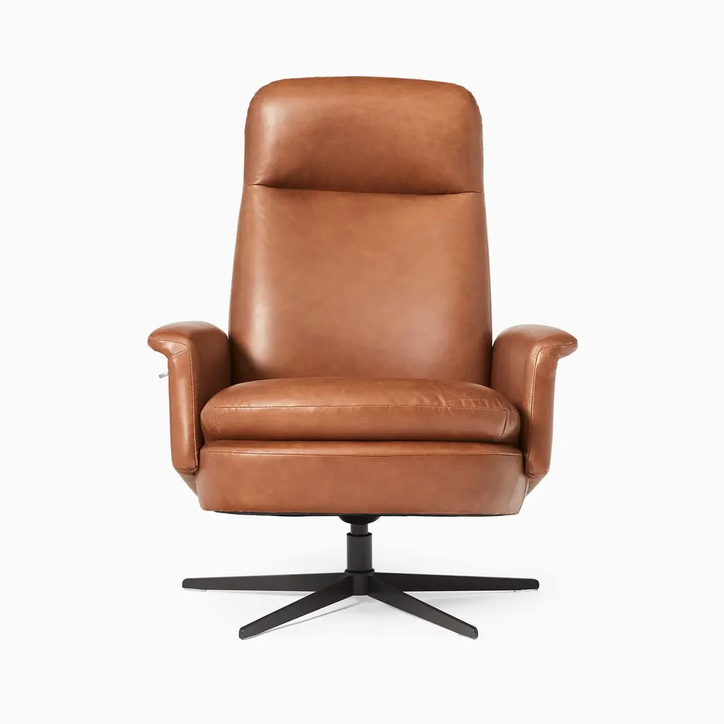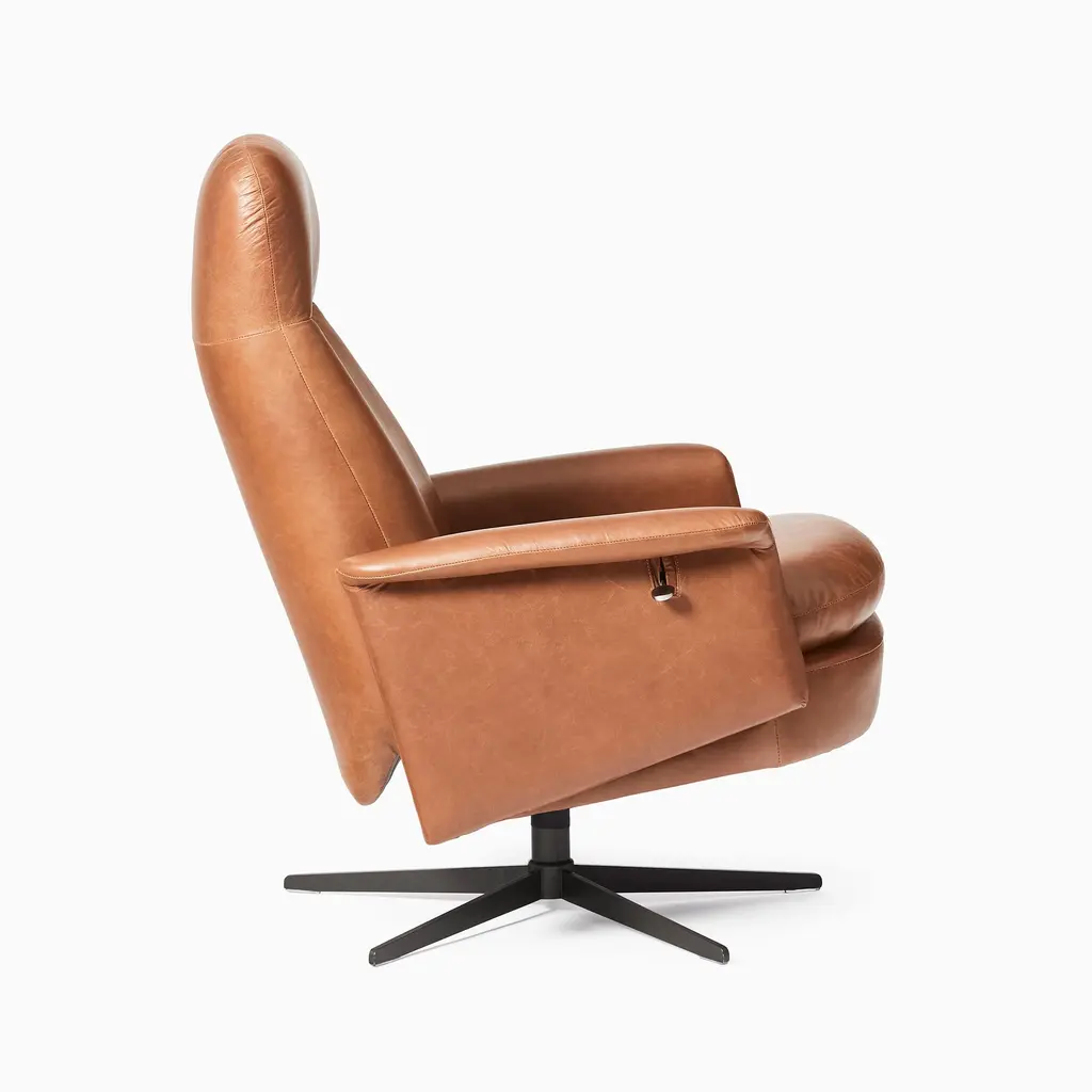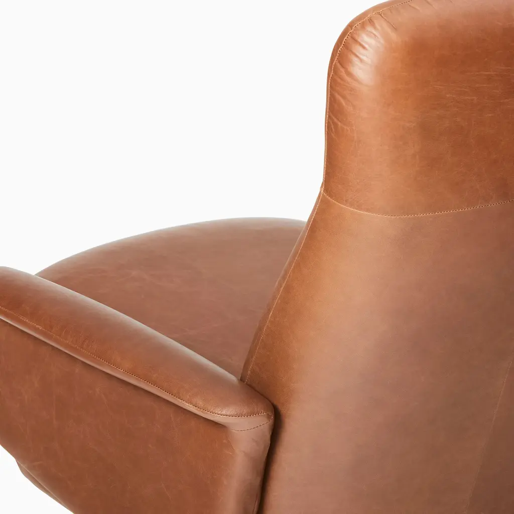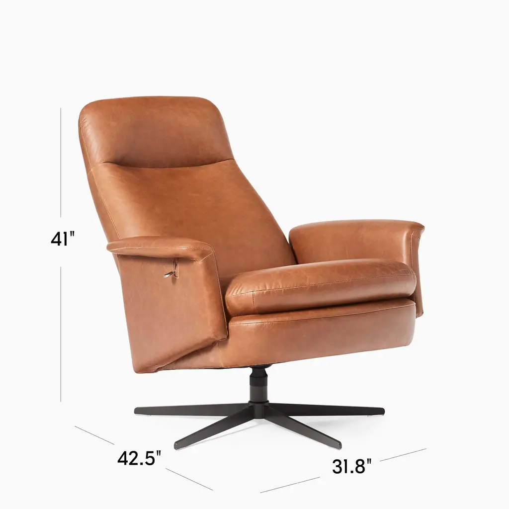 This contemporary chair lets you recline in comfort. Slightly flared arms add a unique design detail. It has a sleek metal swivel base for easy turning. Covered in your choice of luxe leather. Contract Grade for unmatched durability.