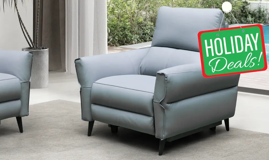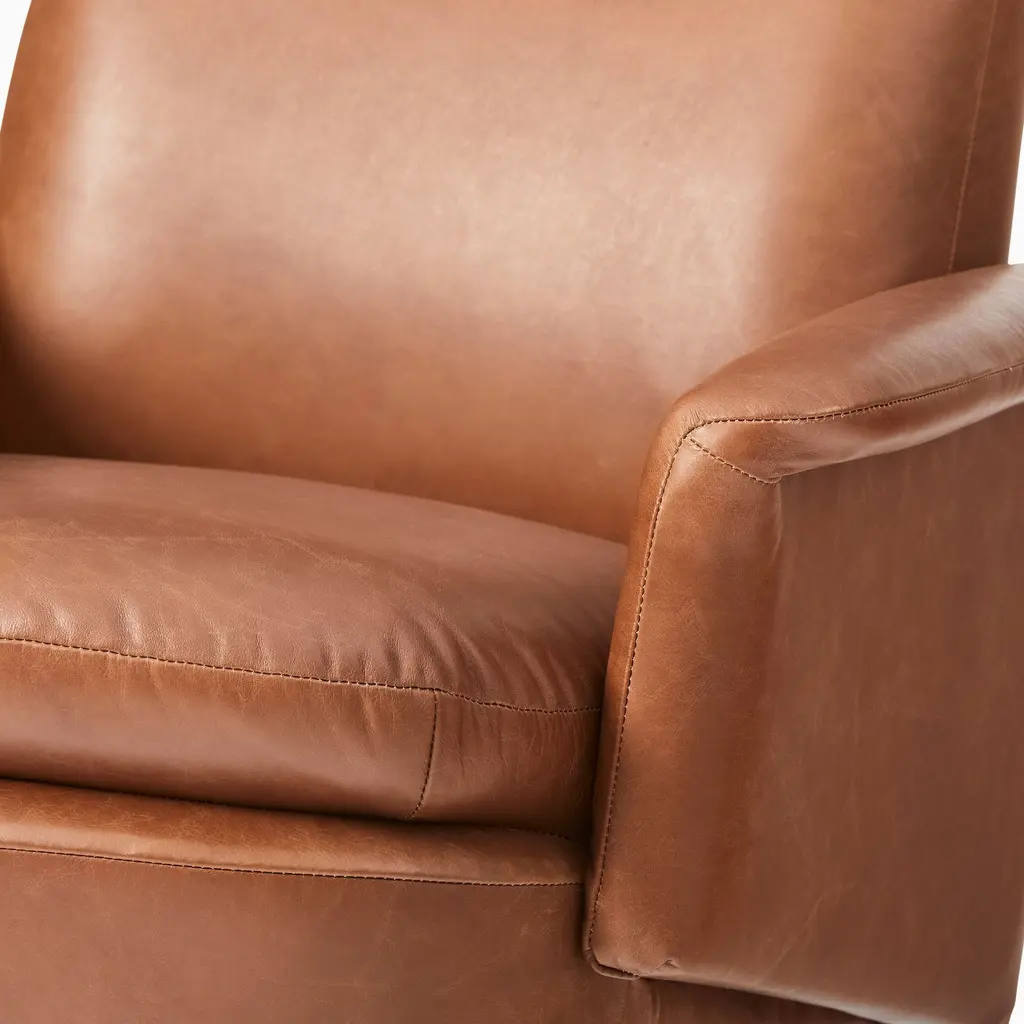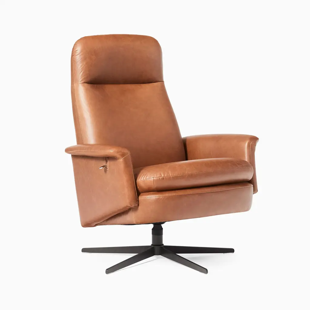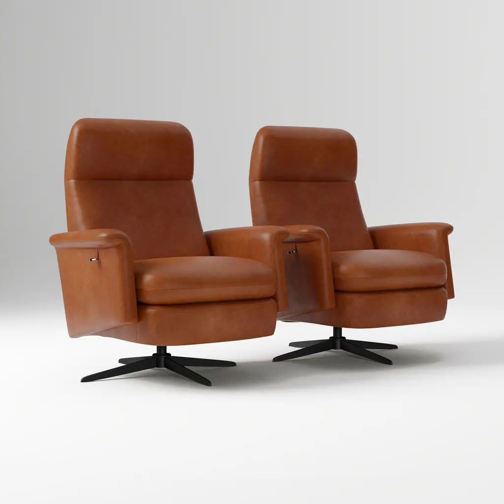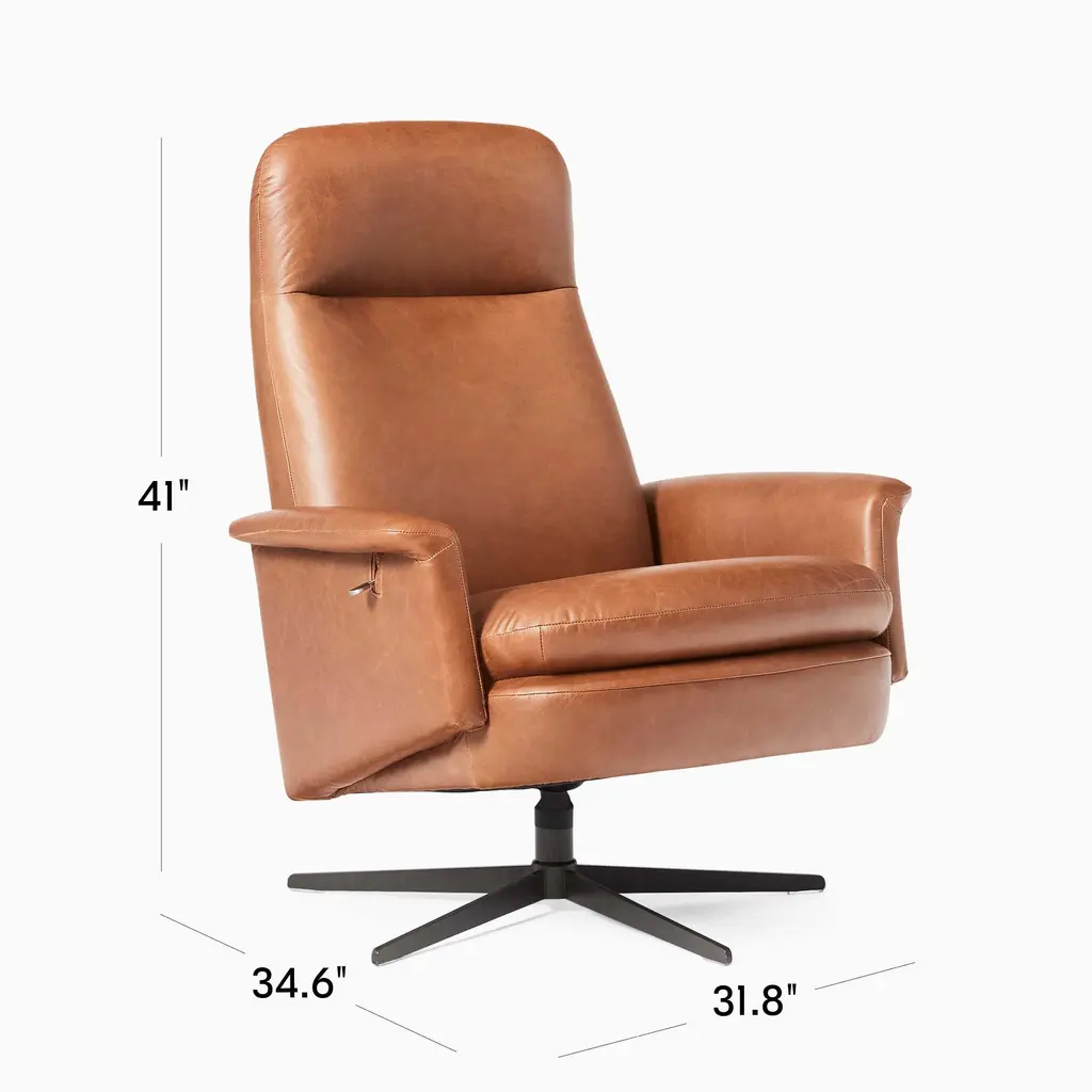 This contemporary chair lets you recline in comfort. Slightly flared arms add a unique design detail. It has a sleek metal swivel base for easy turning. Covered in your choice of luxe leather. Contract Grade for unmatched durability.