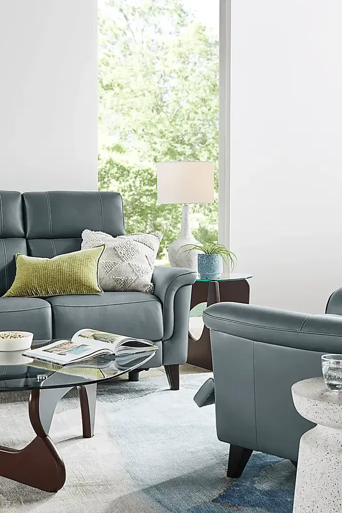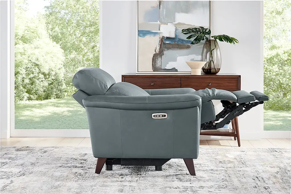 Serene relaxation with quiet elegance is reimagined in the Antonella collection from Cindy Crawford Home, where sculptural form, refined details, and luxurious comfort come together. Exquisitely modern, this recliner is upholstered in blue top grain leather where the body touches and features a clean, sleek frame. Deep channeled back cushions and subtly angled headrests offer supportive comfort, while slim, padded roll arms and tapered wood legs in a brown finish give the silhouette a sculptural, elevated look. Dual power reclining with zero gravity adjustable headrest and footrest allow you to customize your comfort. Integrated USB ports on each control panel keep your devices charged and close at hand. Upholstery: Top grain leather where the body touches with vinyl sides and backs.