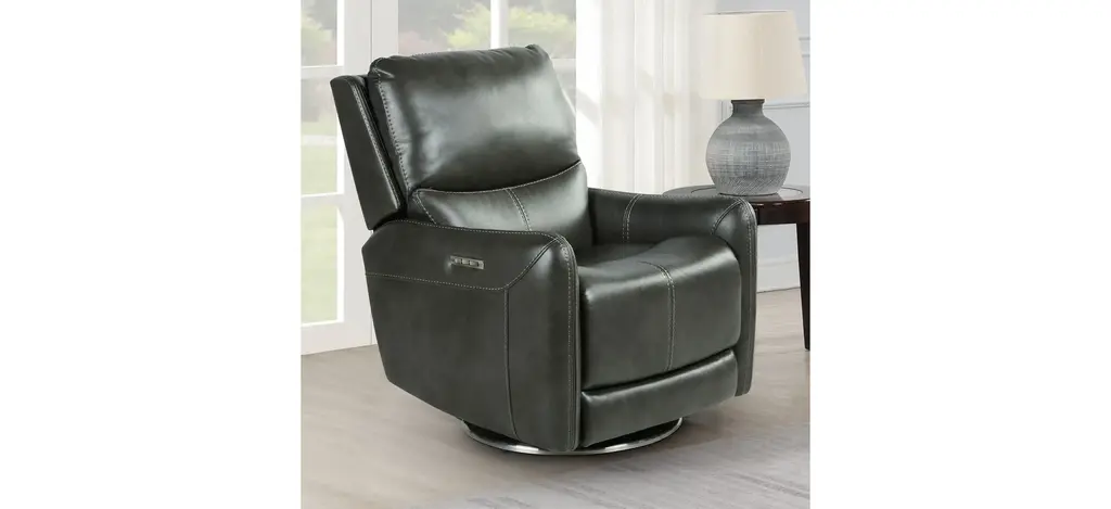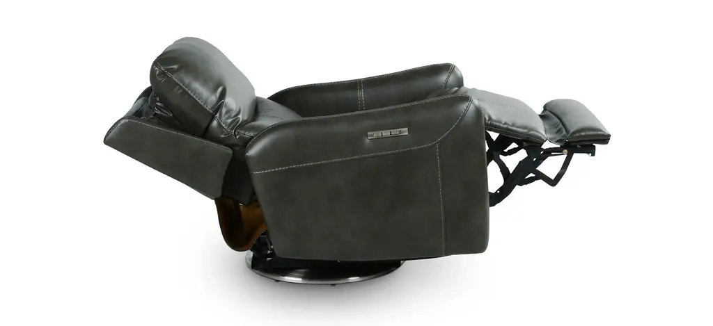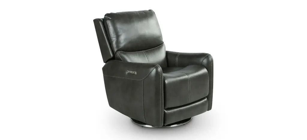 The Athens Swivel Power Recliner combines both style and function. This sleek recliner features pencil arms and power footrest, power headrest and power lumbar all in a chair that swivels 360 degrees. Covered in a durable charcoal faux-leather fabric with baseball stitching, Athens is sure to become your favorite chair.