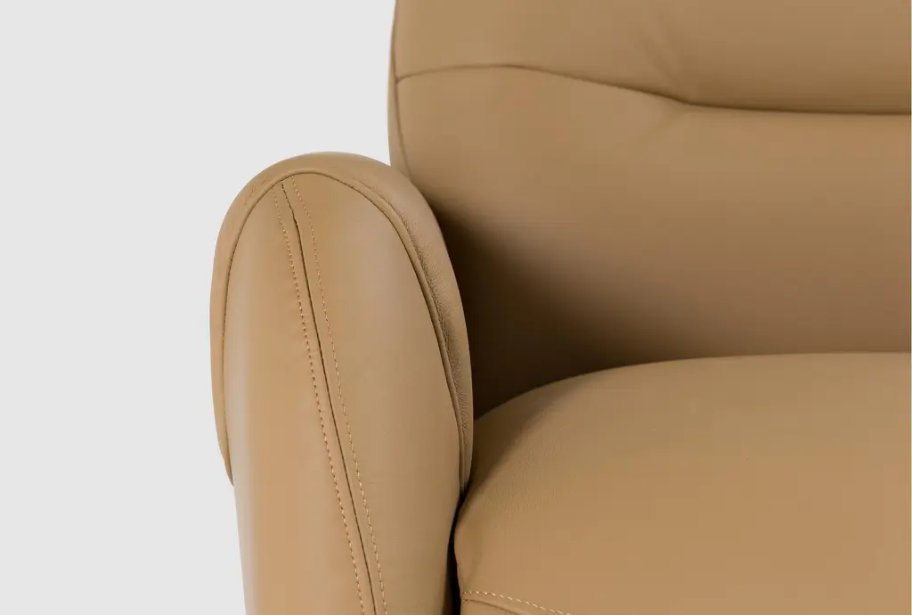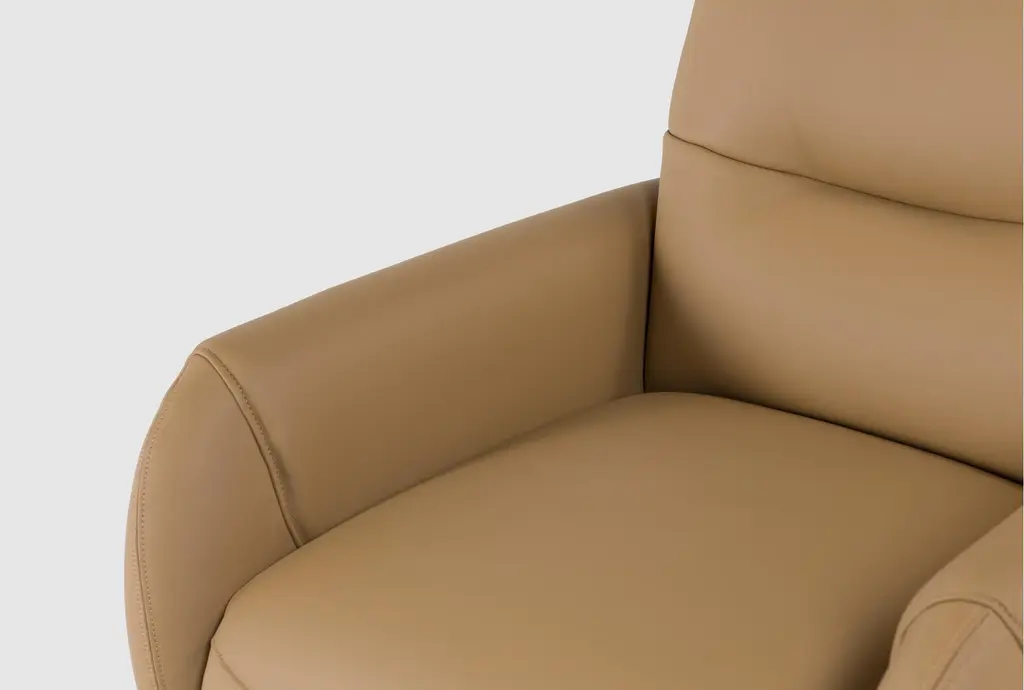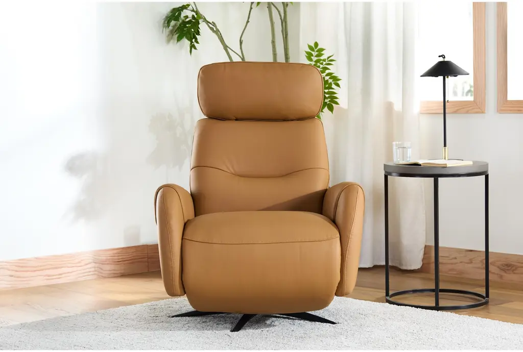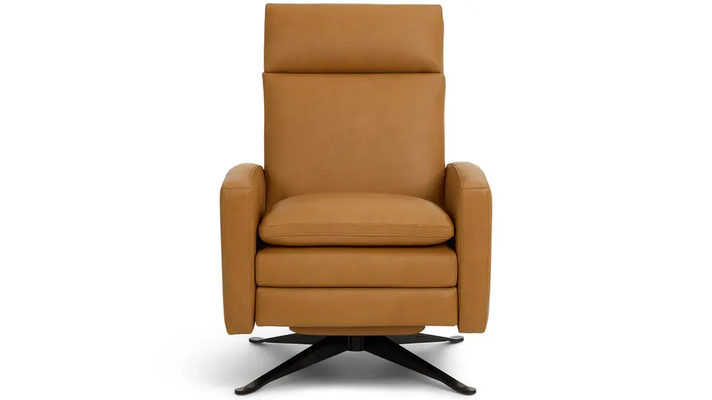 Experience ultimate comfort with the Caius Saddle Brown Leather 32" Swivel Power Recliner. Featuring a manual adjustable headrest and built-in USB, this recliner offers convenience and relaxation. Its camel color and premium leather construction add a touch of sophistication to any living room setting.