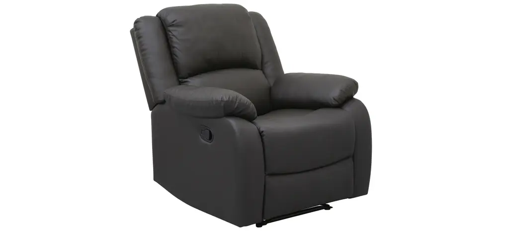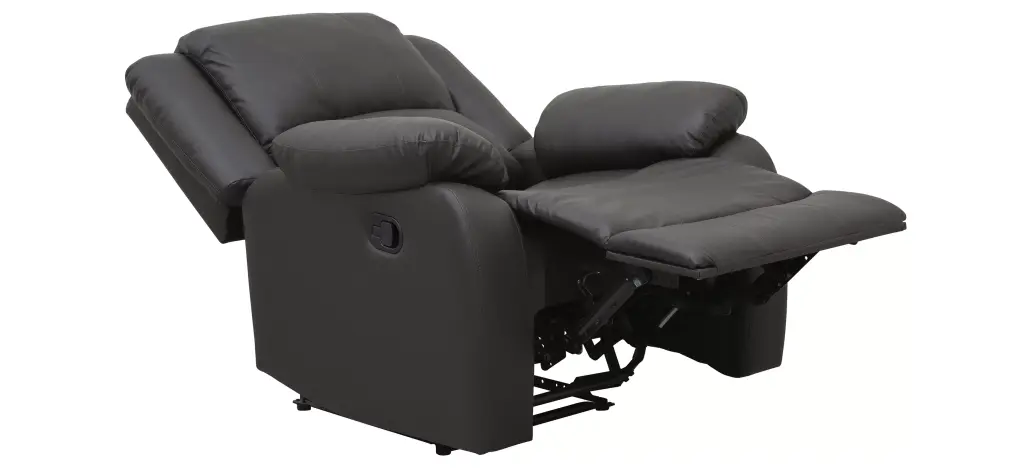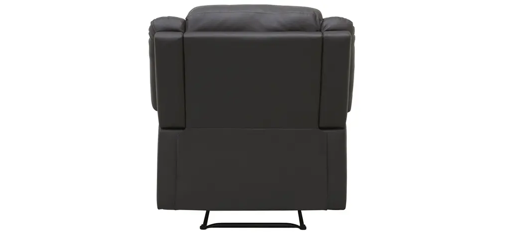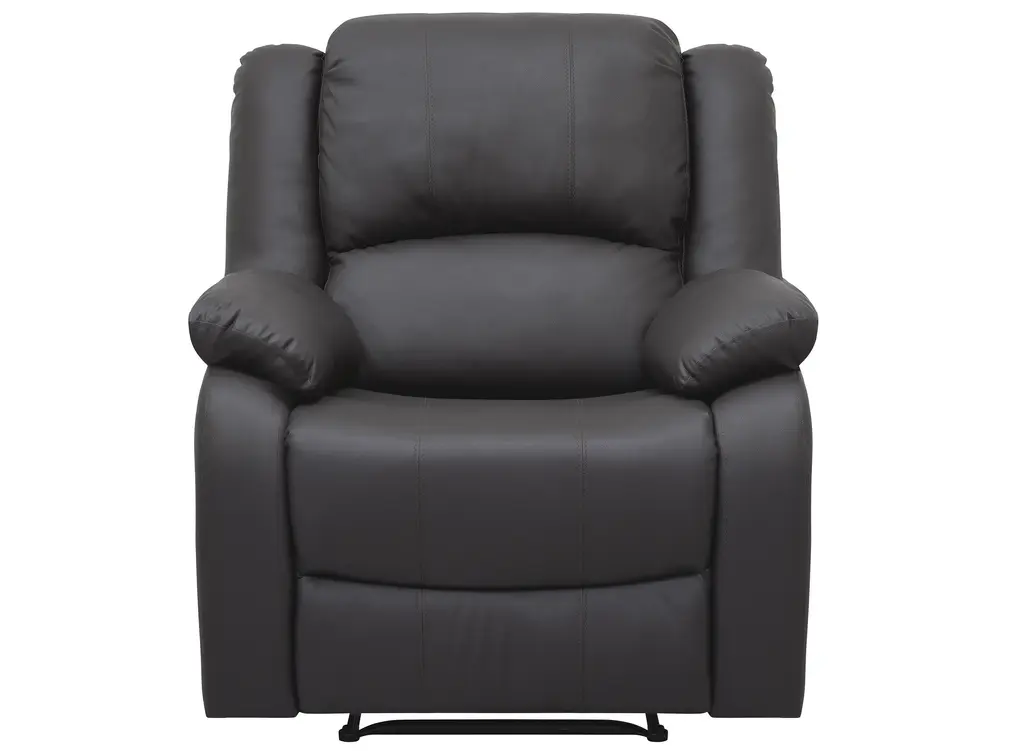 A solid pairing to your transitional living room, the Calla Manual Recliner's decorative versatility, and plush seating creating a reclining chair that is a complement to your lifestyle. Dark brown faux leather covers the chair, the neutral hue lending unobtrusive style to your space. The manual motion mechanism of the piece is engaged with a pull of the side-mounted tab, transitioning you from seated to reclined. The contoured seat structure is amply paired with pillowtop arms maximizing your comfort.