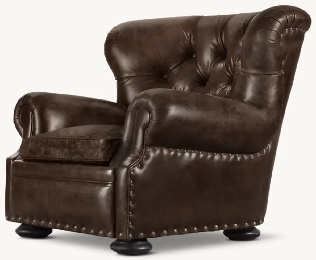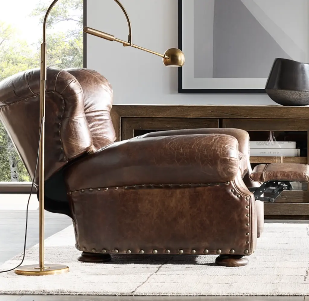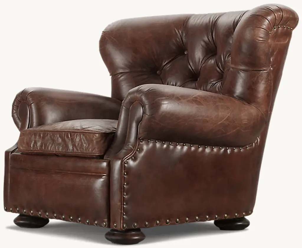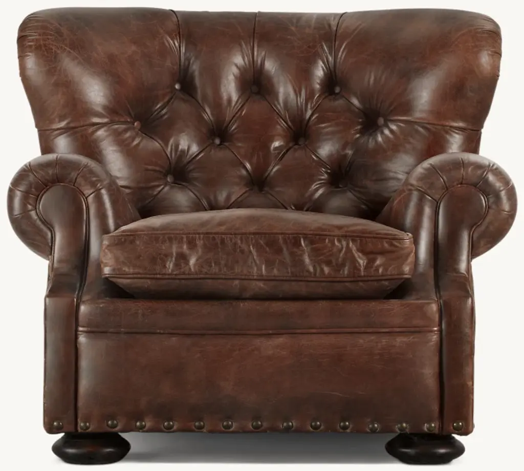 An icon of library and den, Churchill's classic design has been enhanced for posterity. Handcrafted of the finest leather, our seating sits low and deep, its lines contour to the body for enveloping comfort and it is accented with oversized, antiqued brass nailheads. Guaranteed for life.