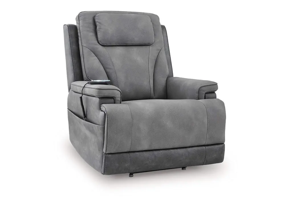 Treat yourself to superior comfort with the Clive Power Recliner, which features high-end ergonomic features and elegant design details. Designed to give living spaces a refined look and feel, this recliner has heavy thread stitching and a channeled back cushion. Pillow pad armrests and flat seat cushions further enhance your comfort, while a hand-held power control allows you to independently adjust the headrest, footrest and lumbar support. Keep your feet and legs elevated with a fully padded extended footrest that helps improve circulation. With the lay-flat mechanism, you can easily shift to a sleep position. Our DualFlex Spring System ensures durability and a supportive sit, along with the attached, high-density foam seat and back cushions. Keep devices charged with a USB port in the hand control, which you can house in the convenient side pocket.