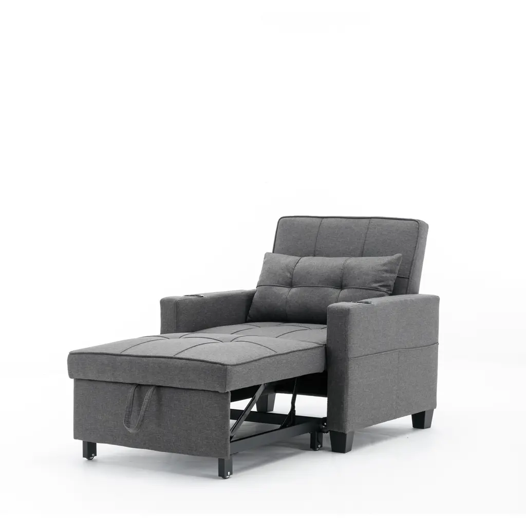 our convertible sleeper chair is a perfect addition to any household.The unique folding design makes this chair easy to transform. It has multiple positions, such as a chair with armrests, chaise lounge or a bed. Featuring steel construction, this chair can retains its value over the long term. A pillow comes as a gift, which you can use as a pillow or cushion. You can put it in the living room, the bedroom, or even the office. Buy yours today!FeaturesConstructed of high quality polyester, sponge and steel, provides lasting durability The outer cover can be removed for easy clean> Folds up to an armrest chair, bed or chaise lounge seat Equipped with two casters for easier mobility Five adjustable position of backrest Filled with thick sponge for superior comfort Includes soft pillow for added comfort Assembly requiredColor:Blue/Brown Material:Polyester + Steel + Sponge Overall dimension:26.5''Wx39''Dx31''H Seat size:25.5''Wx 23''Deep Height from seat to ground:15.5'';Back size:25.5'' x 16'' Weight capacity:330 Lbs Package includes:1 x Sofa Bed