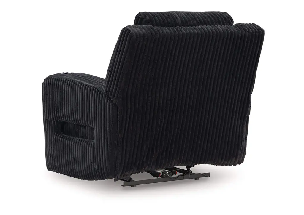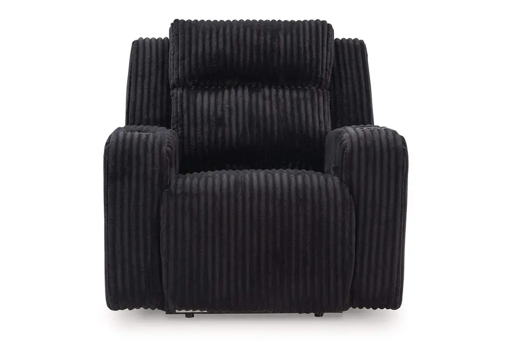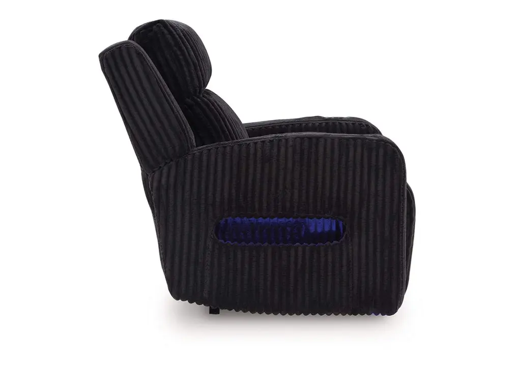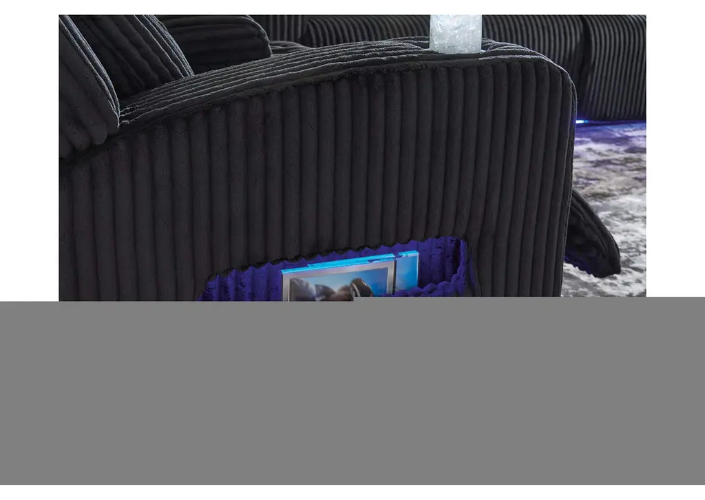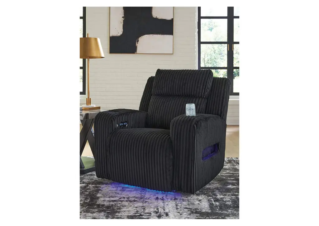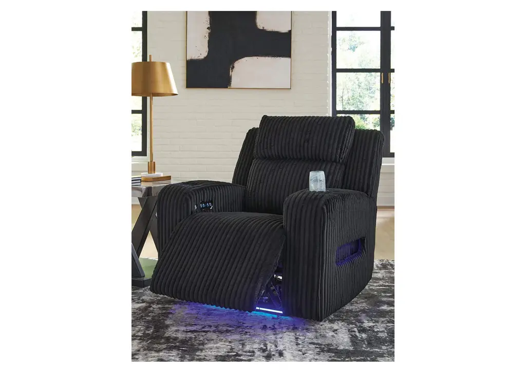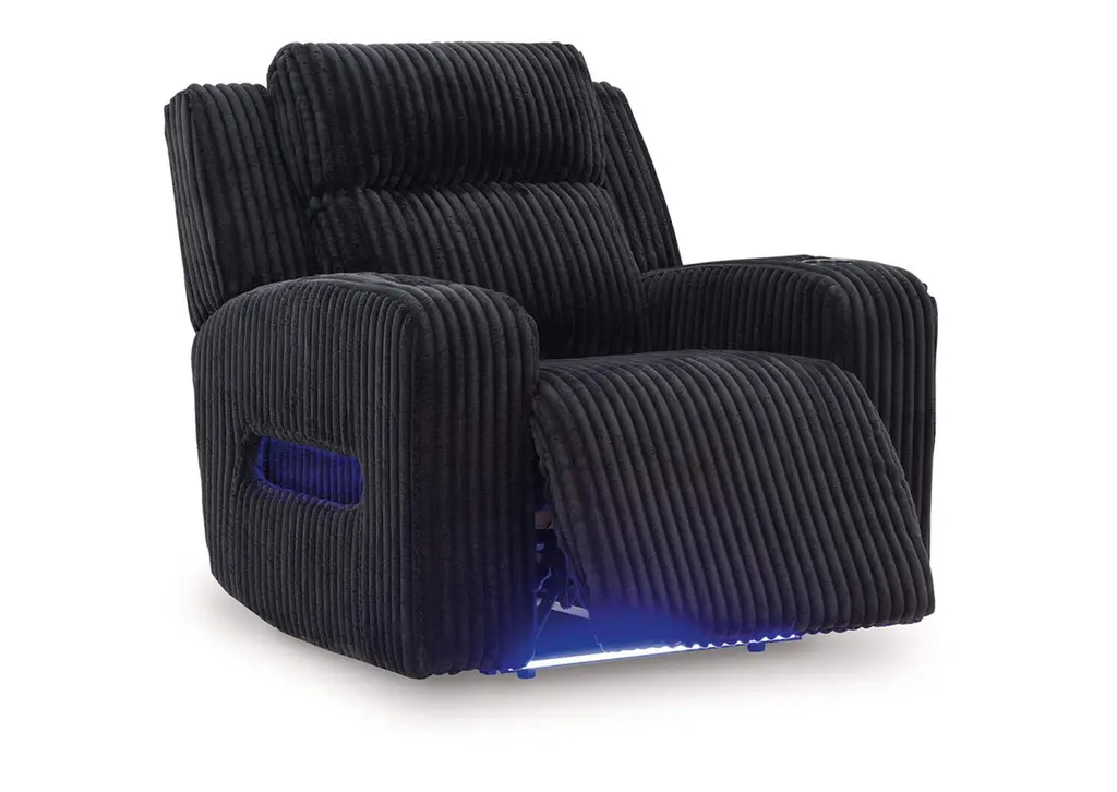 Trend-right style, meet irresistible modern function. Your living room gets a cozy-cool upgrade with this power recliner. Curl up in its ultra-chic corded upholstery and recline with one-touch controls. Is it movie night or game time? With ambient LED lighting, this recliner transforms from a serene relaxation spot to an entertainment hub. USB charging, cup holders and storage cutouts make lounging all the more convenient. Weight 138.000 lbs. (62.1kgs.)