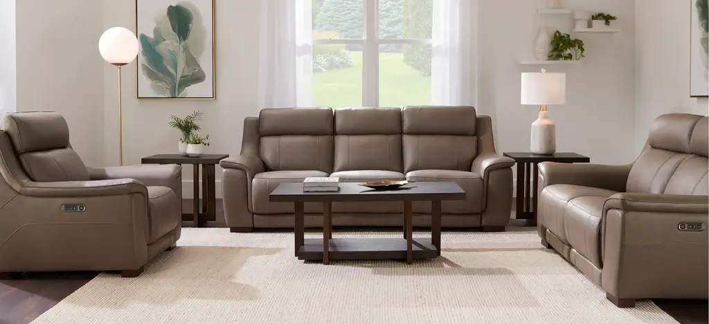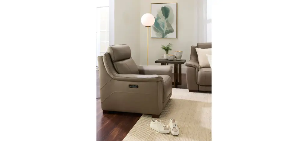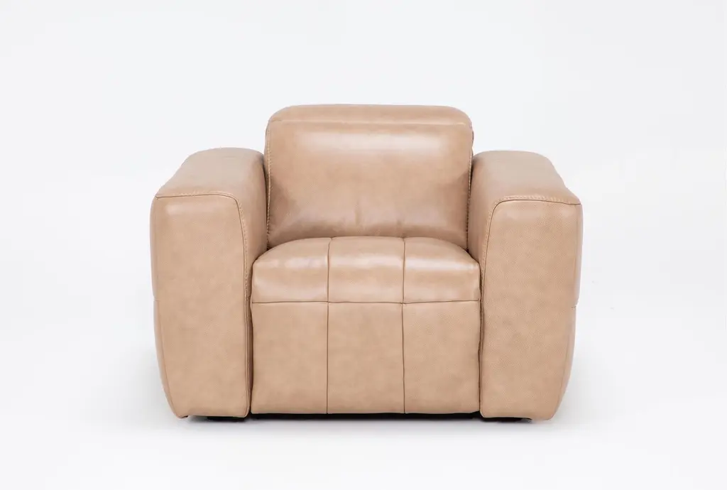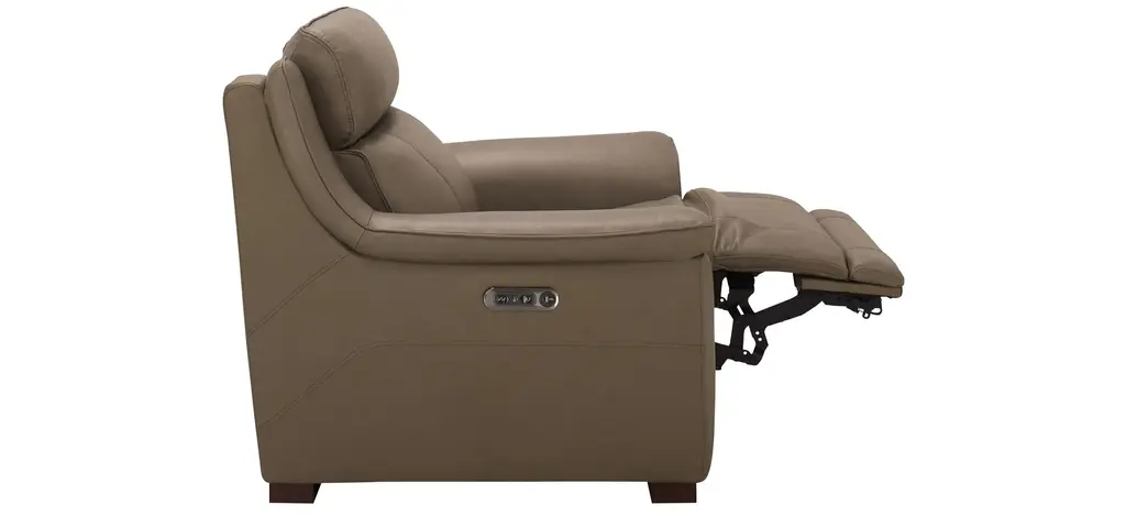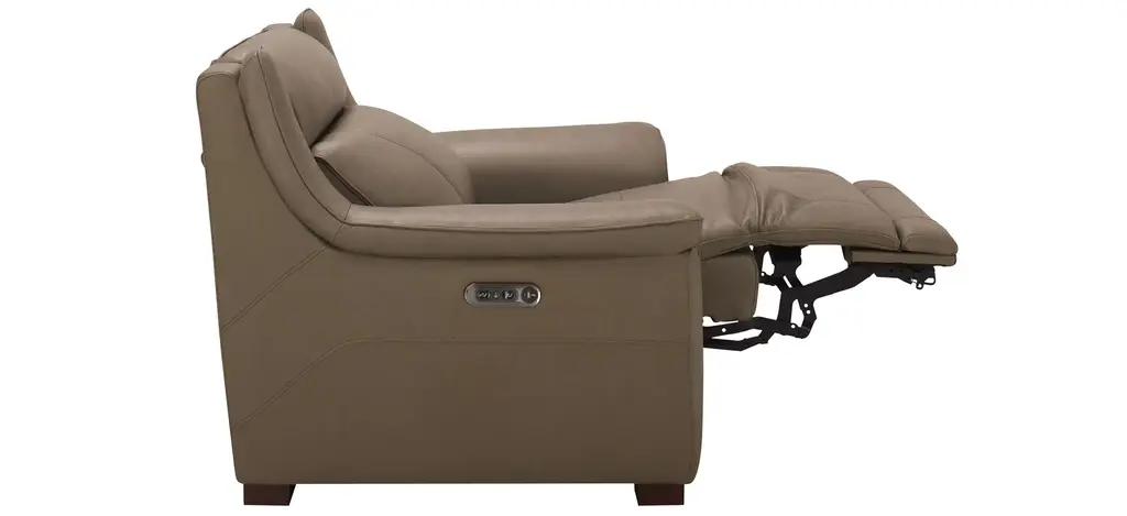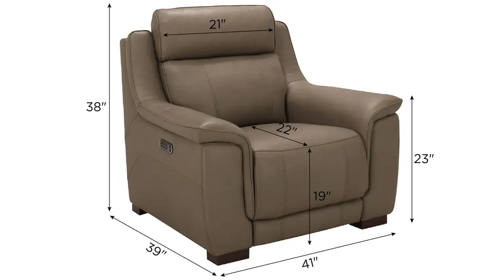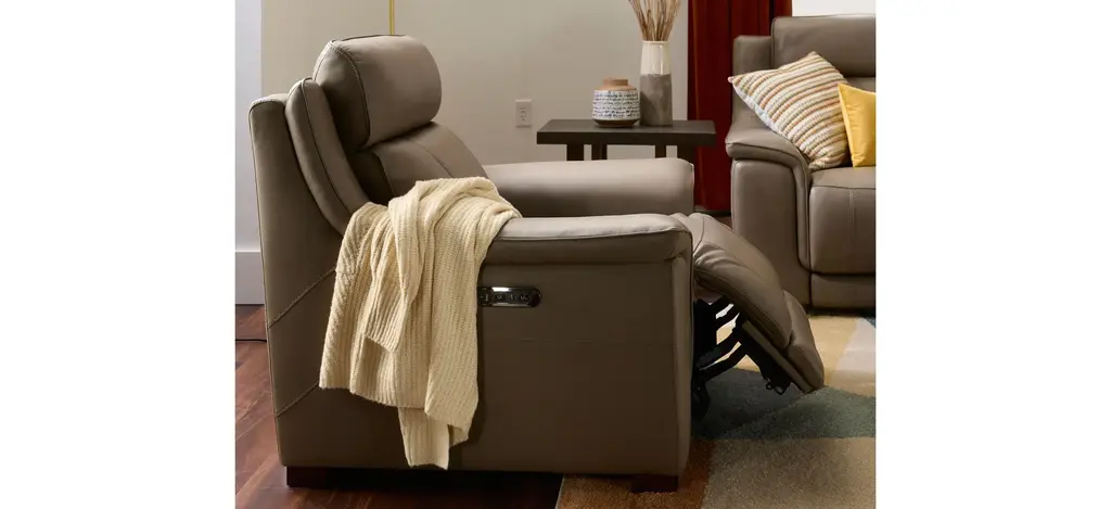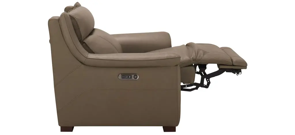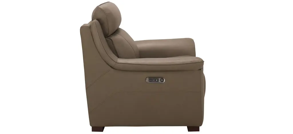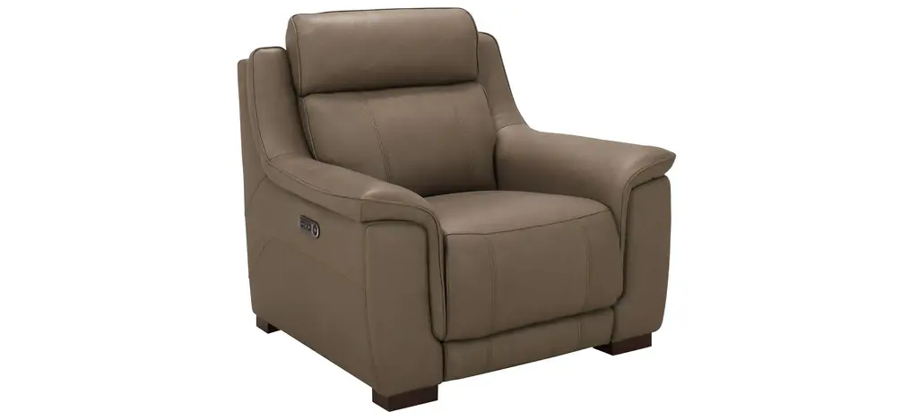 You won't know how you got by without the comfort and convenience of the Griffith power recliner with power headrest. Supple leather in a beautiful shade of mushroom brown, along with pillowed arms and soft head support, promise everything you'd expect from a traditional comfy couch, along with high-tech conveniences you'll love.