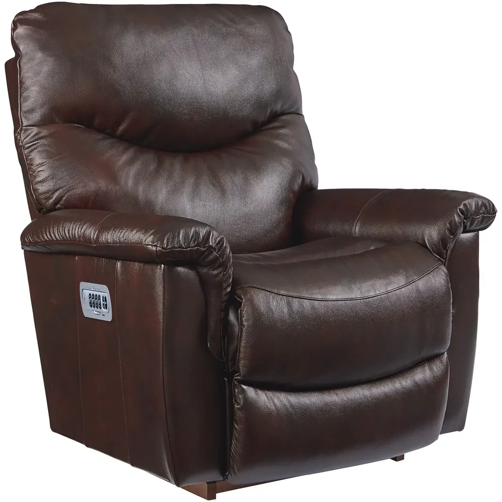 The James Leather TriPower Recliner with headrest and lumbar support blends function and comfort with a casual style that looks right with any home decor. It features a tall back and pillowtop arms that add flair to this perennial family favorite. The bucket chaise seat and leg rest create a continuous comfort zone when in the reclining position. This recliner includes a wireless remote, allowing you to adjust the headrest, back, leg rest, and lumbar independently for an unbelievable number of relaxing positions. Also included is a handy USB charging port to keep your devices ready and two memory settings that save your favorite reclining positions.