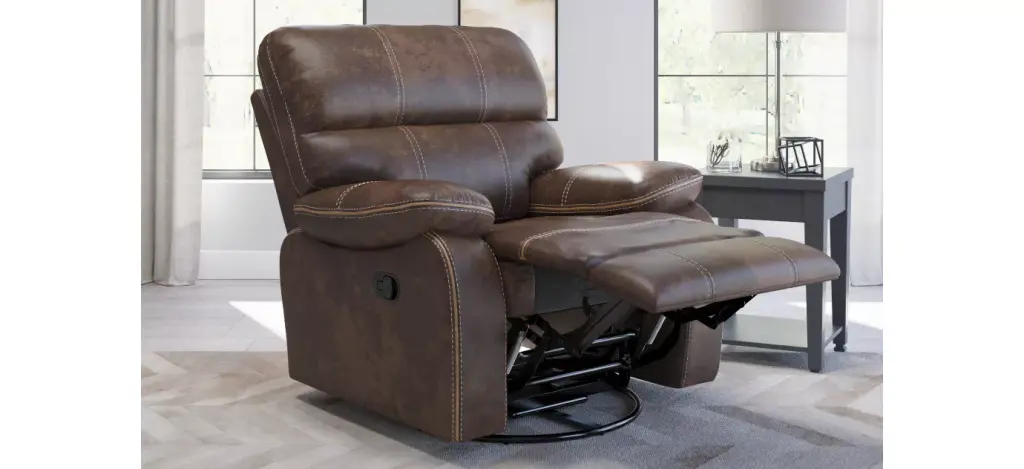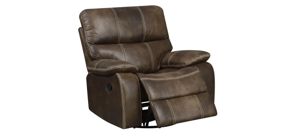 Jessie James Swivel Gliding Recliner collection offer luxury and style with comfort and convenience. With the ability to swivel, glide and recline, this chair was designed for relaxation while its microsuede upholstery provides important durability. The rich faux leather is contrasted with luggage stitching creating eye-catching comfort. The well-positioned features offer modern amenities within a traditional design.